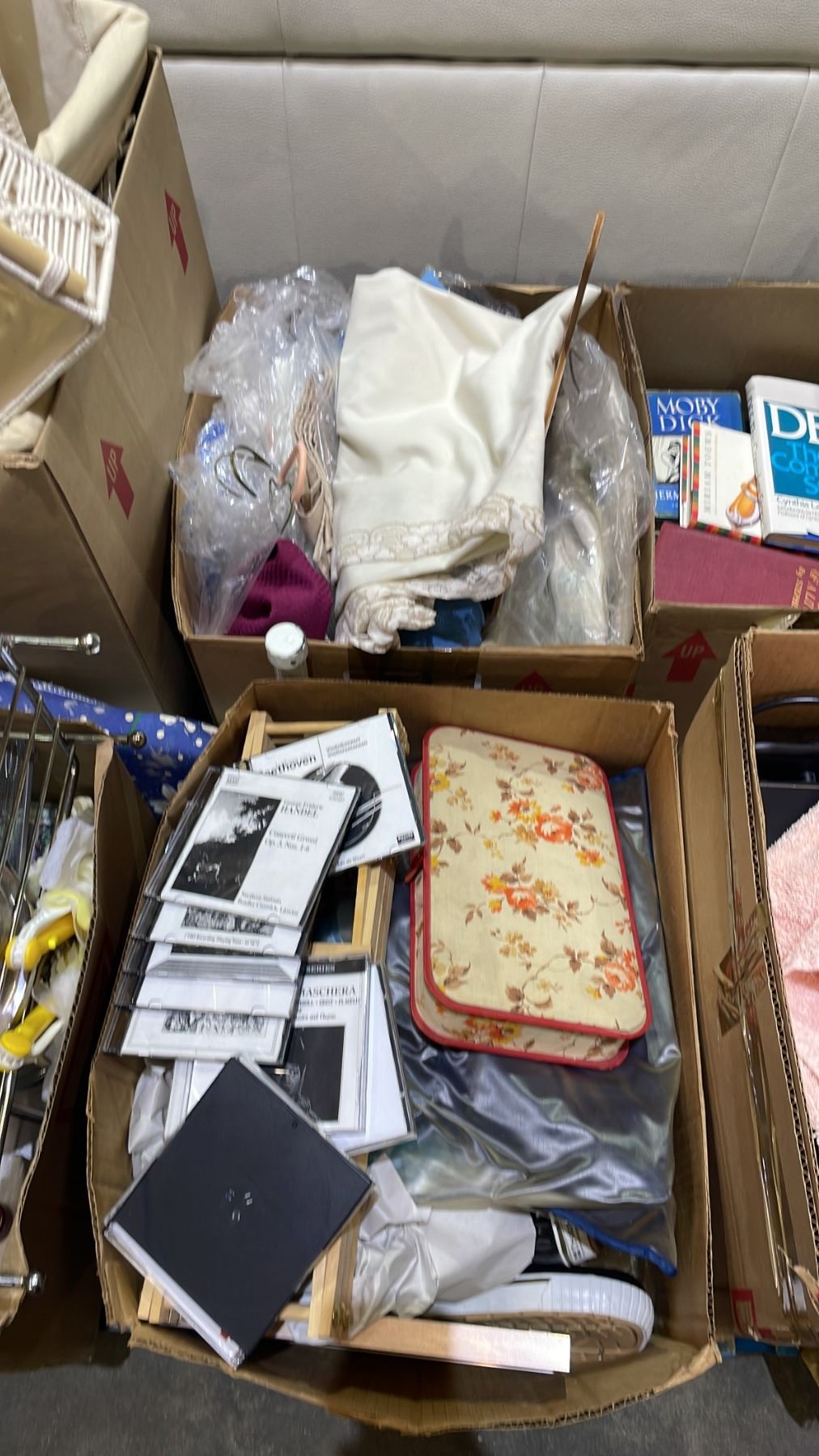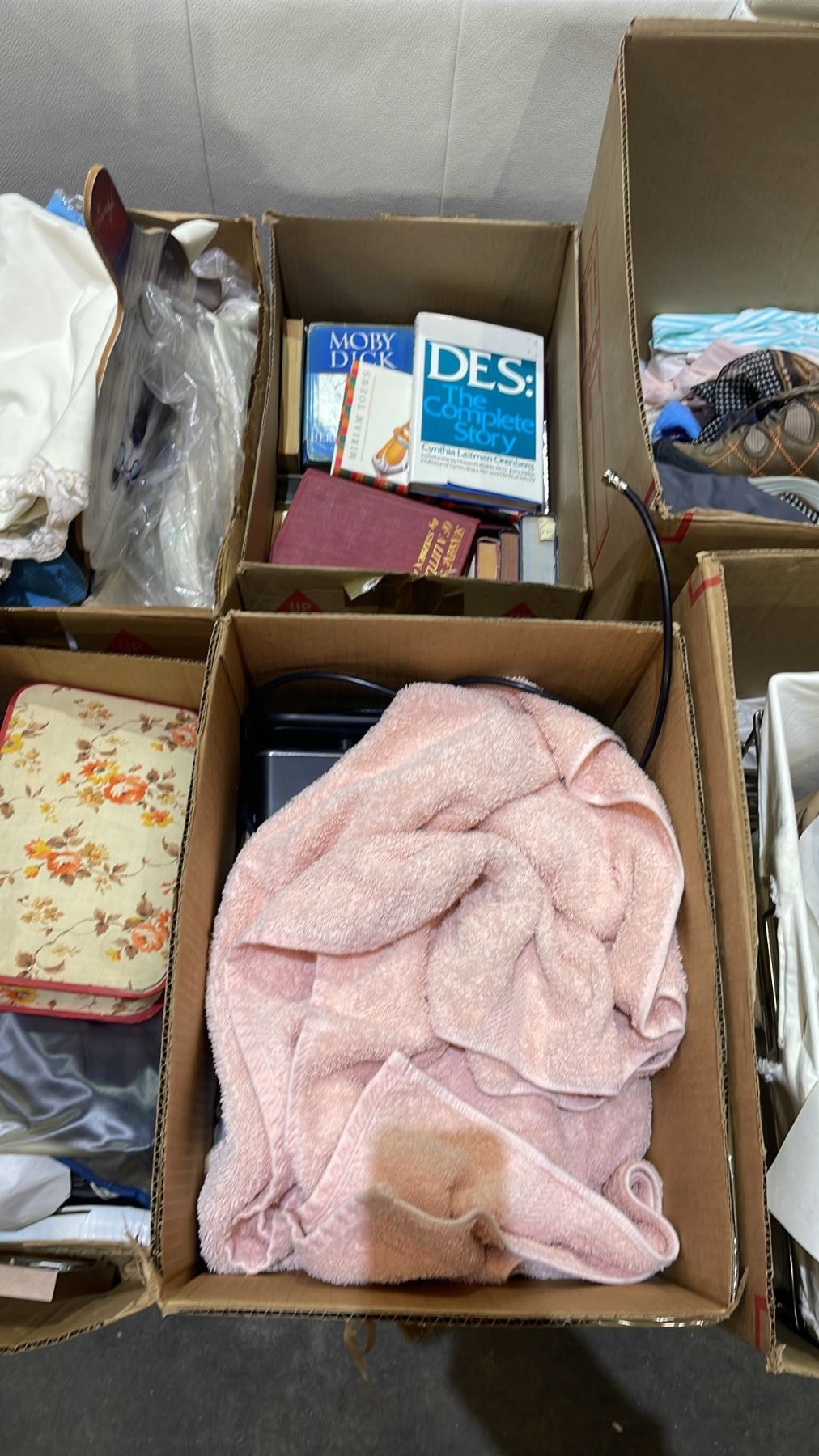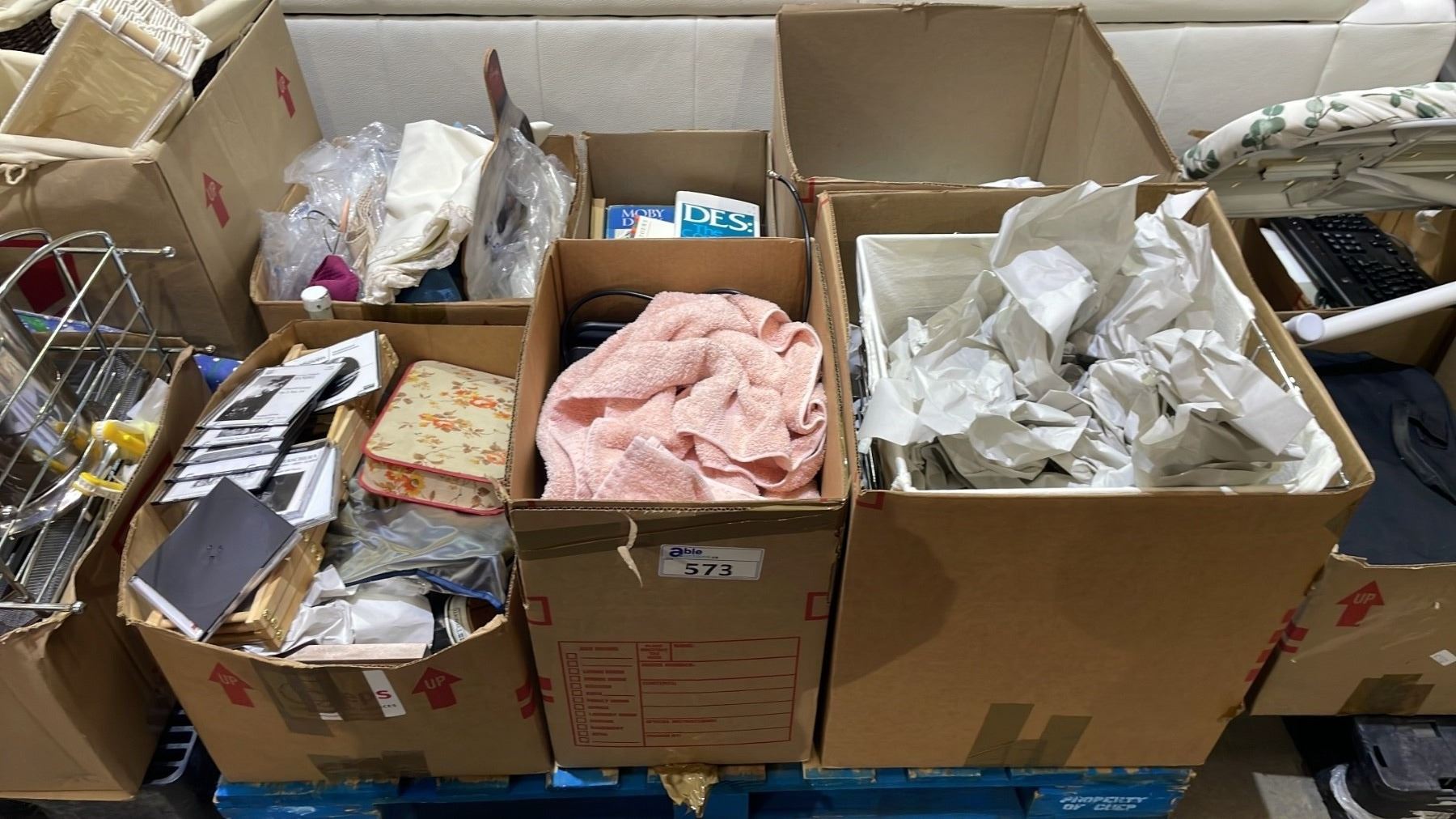 PALLET OF ESTATE GOODS - BOOKS, PAPER PLATES, BOWLS & CUPS, TABLE LINENS & MORE