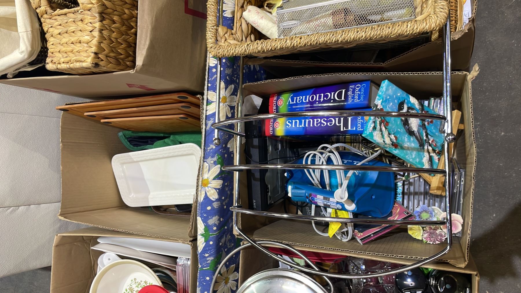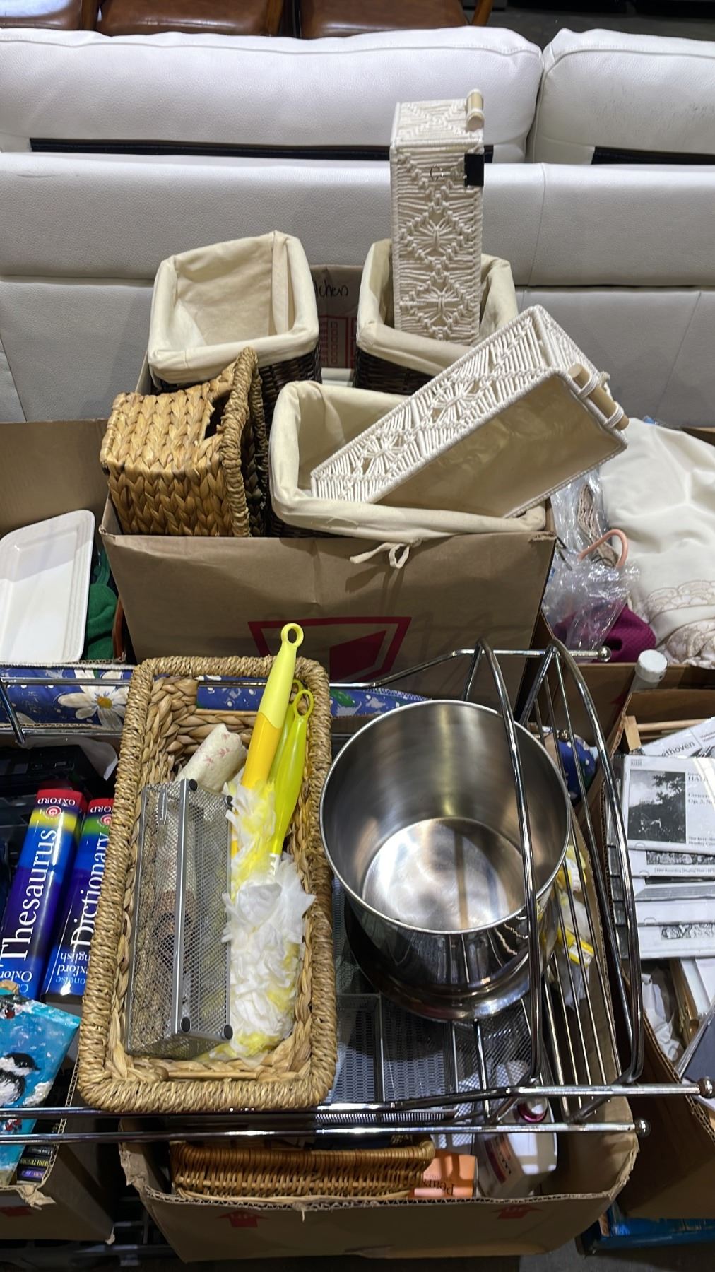 PALLET OF ESTATE GOODS - MUSIC CDS, STORAGE BASKETS, TRAVEL MUGS, BOWLS, PLATES & MORE
