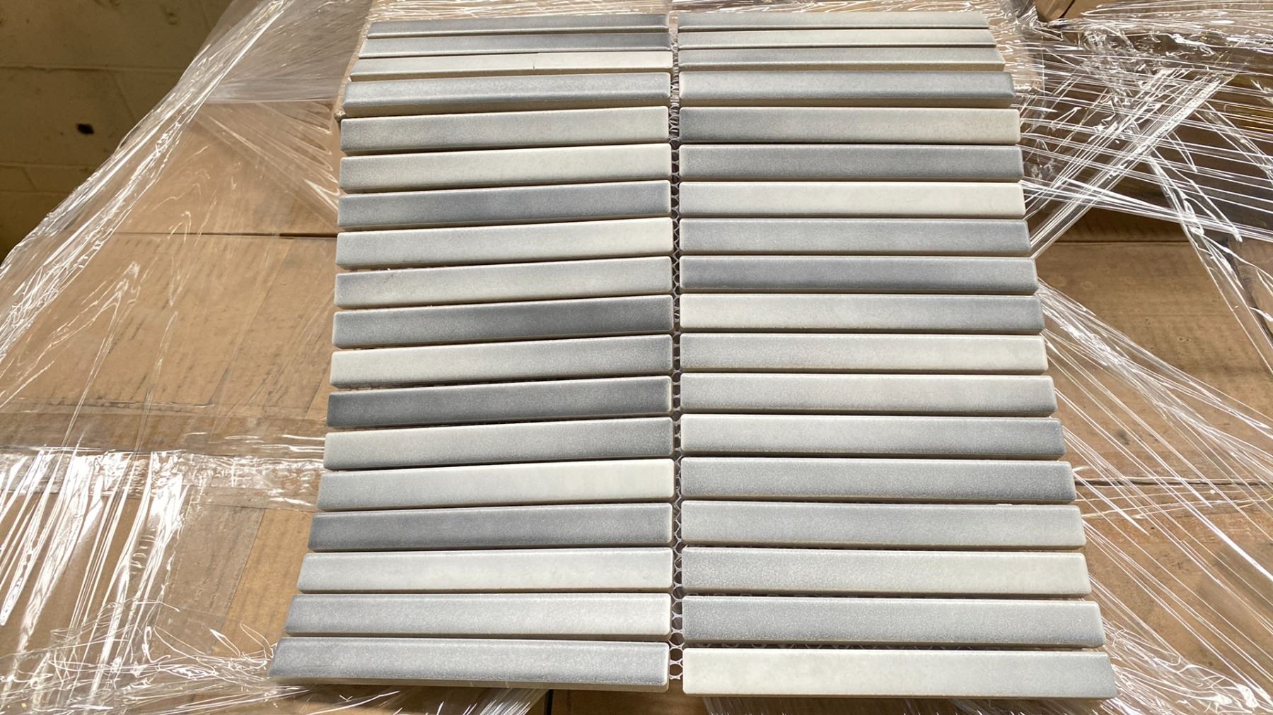 PALLET OF EVANESCENCE SERIES FE-EVMOS-GRE 0.5"X6" GLAZED CERAMIC MOSAIC TILES (12"X12" SHEETS, APPROX. 92 BOXES) 1.009 METERS SQUARED PER BOX