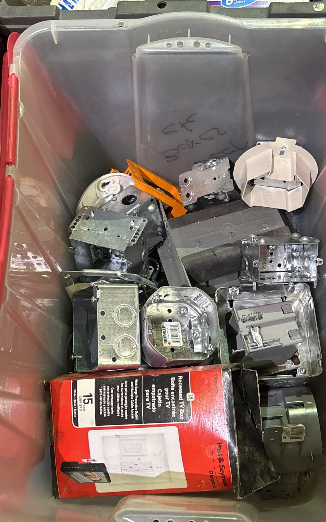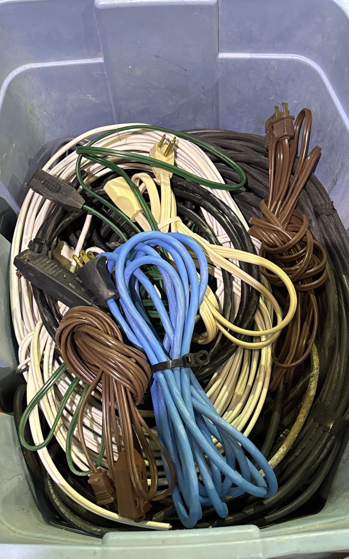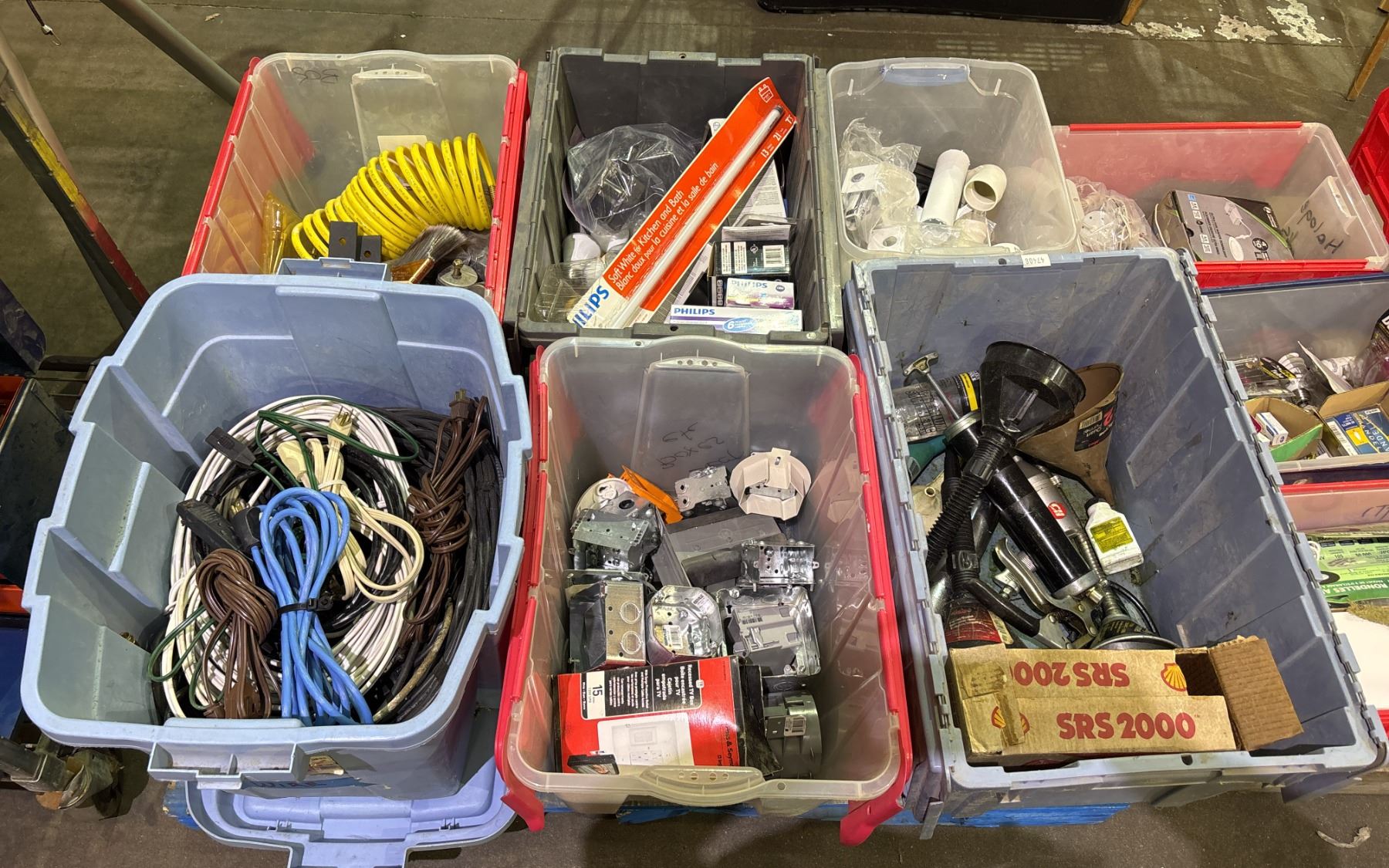PALLET OF EXTENSION CORDS, ELECTRICAL COVERS, ASSORTED FUNNELS, LIGHT BULBS, HARDWARE & MORE *MUST