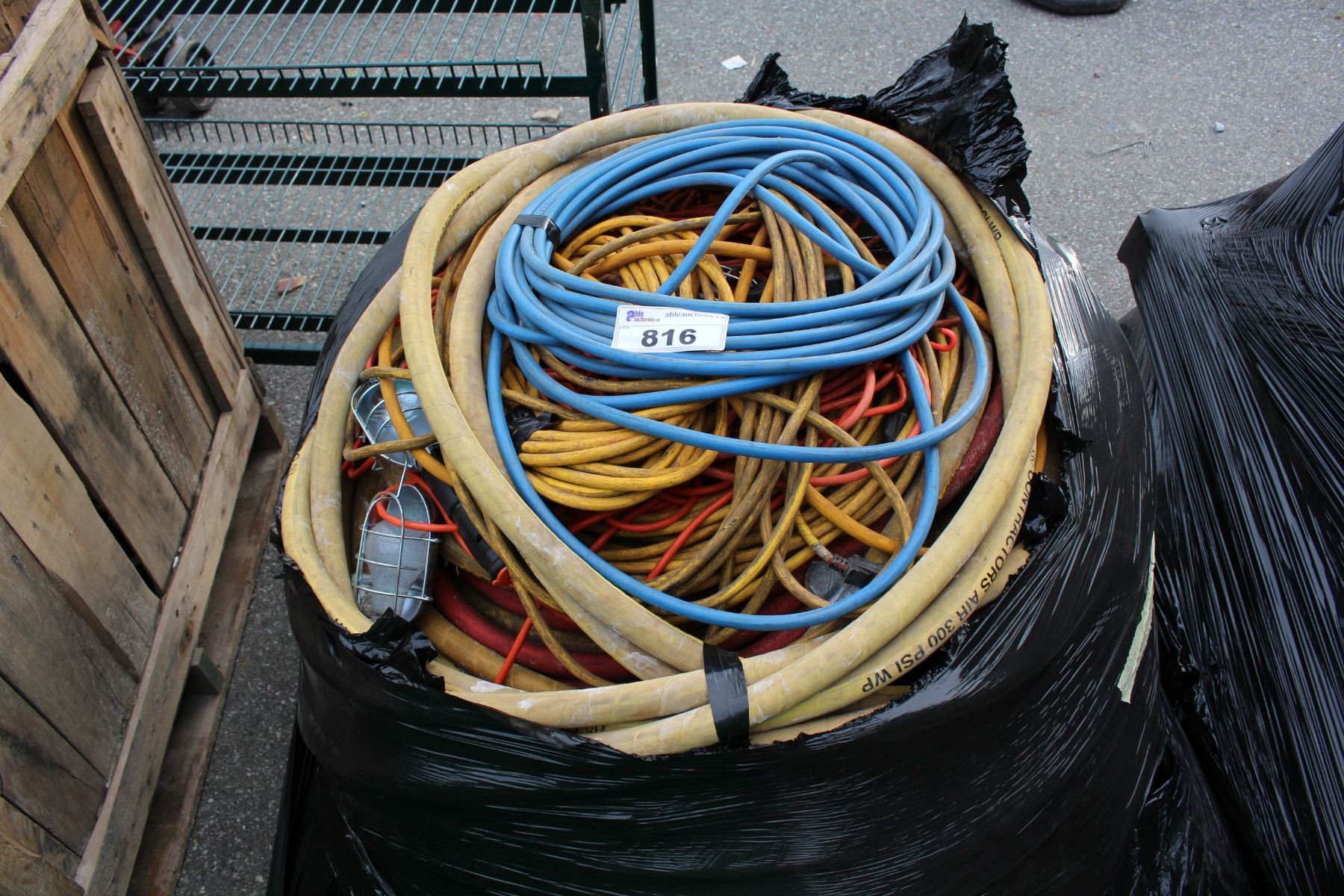 PALLET OF EXTENSION CORDS, LIGHTS, HEAVY DUTY CONTRACTORS 300PSI AIRLINES AND MORE