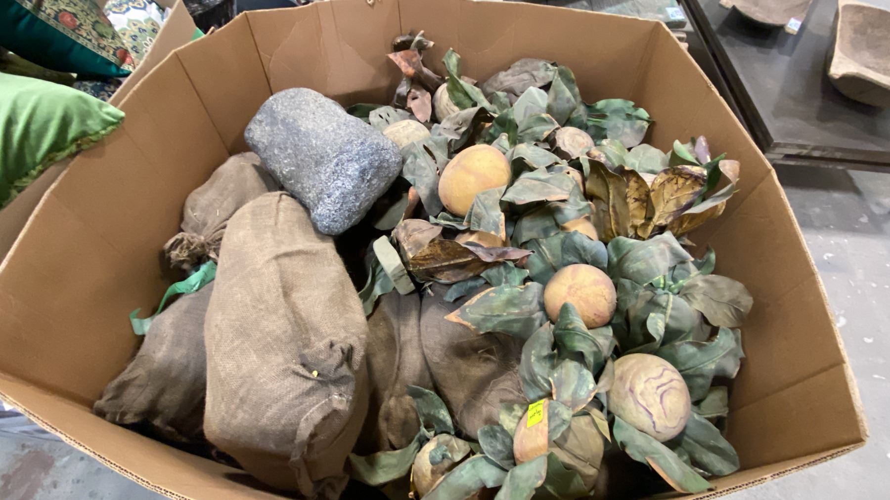 PALLET OF FAUX VEGETABLES, ROCKS & BURLAP SACKS