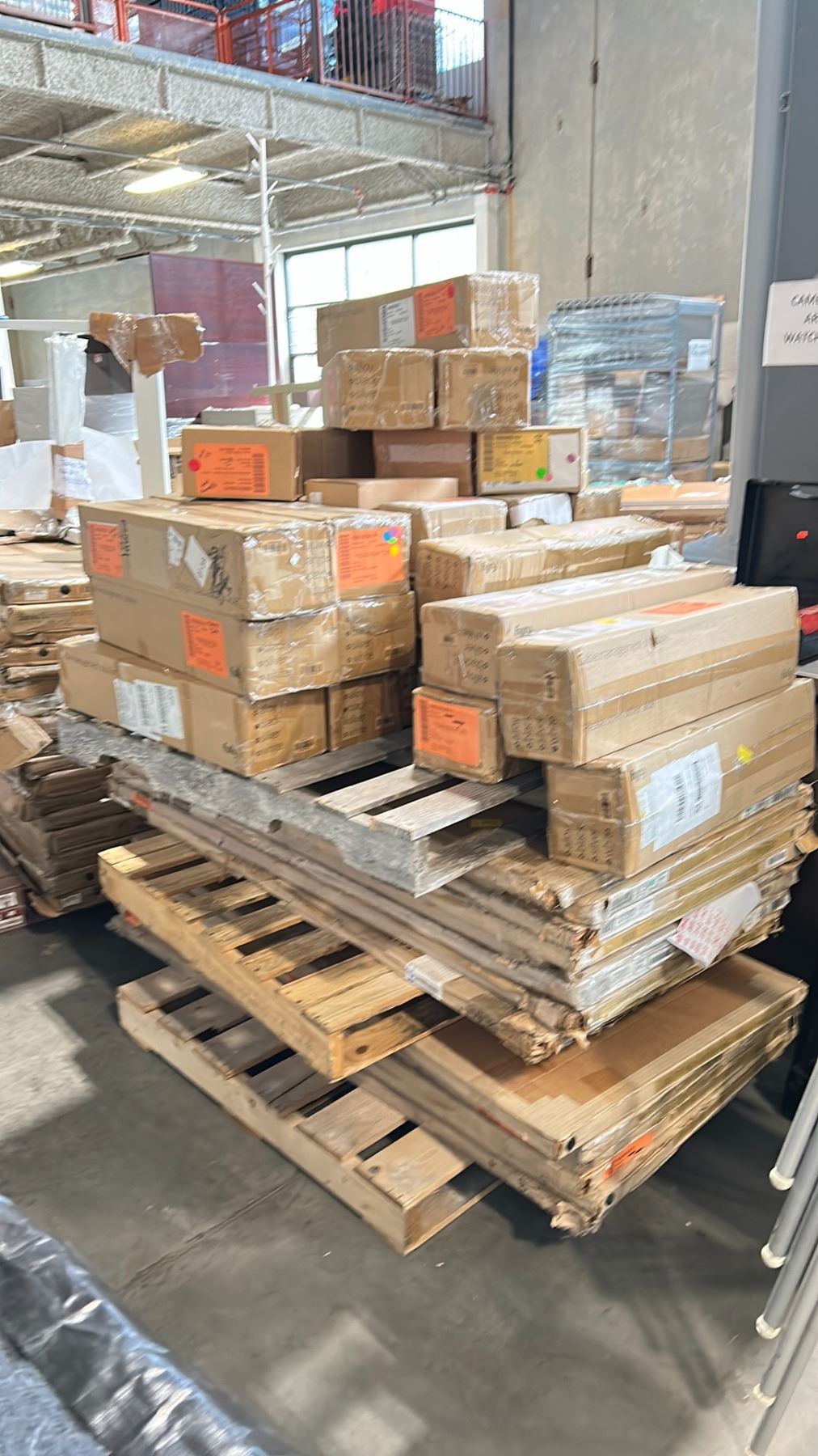 PALLET OF FULLY DESK PARTS AND 2 PALLETS OF TABLE TOPS