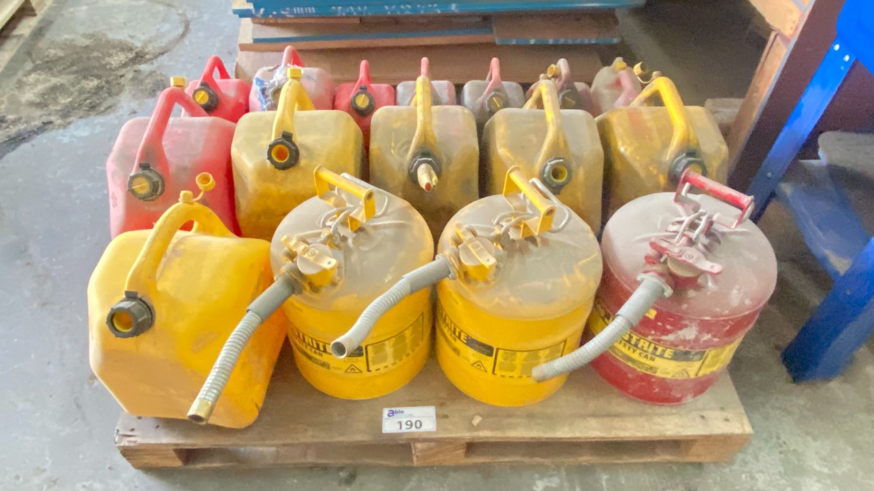 PALLET OF GAS & DIESEL JERRY CANS AND 3 JUSTRITE METAL SAFETY CANS