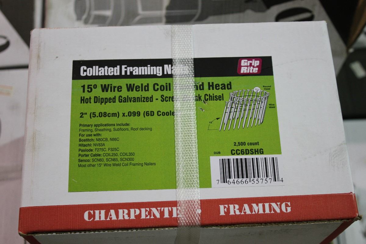 PALLET OF GRIP RITE 15 DEGREE WIRE WELD COIL ROUND HEAD COLLATED FRAMING NAILS (28 BOXES)