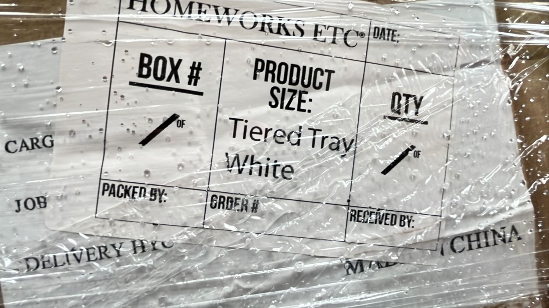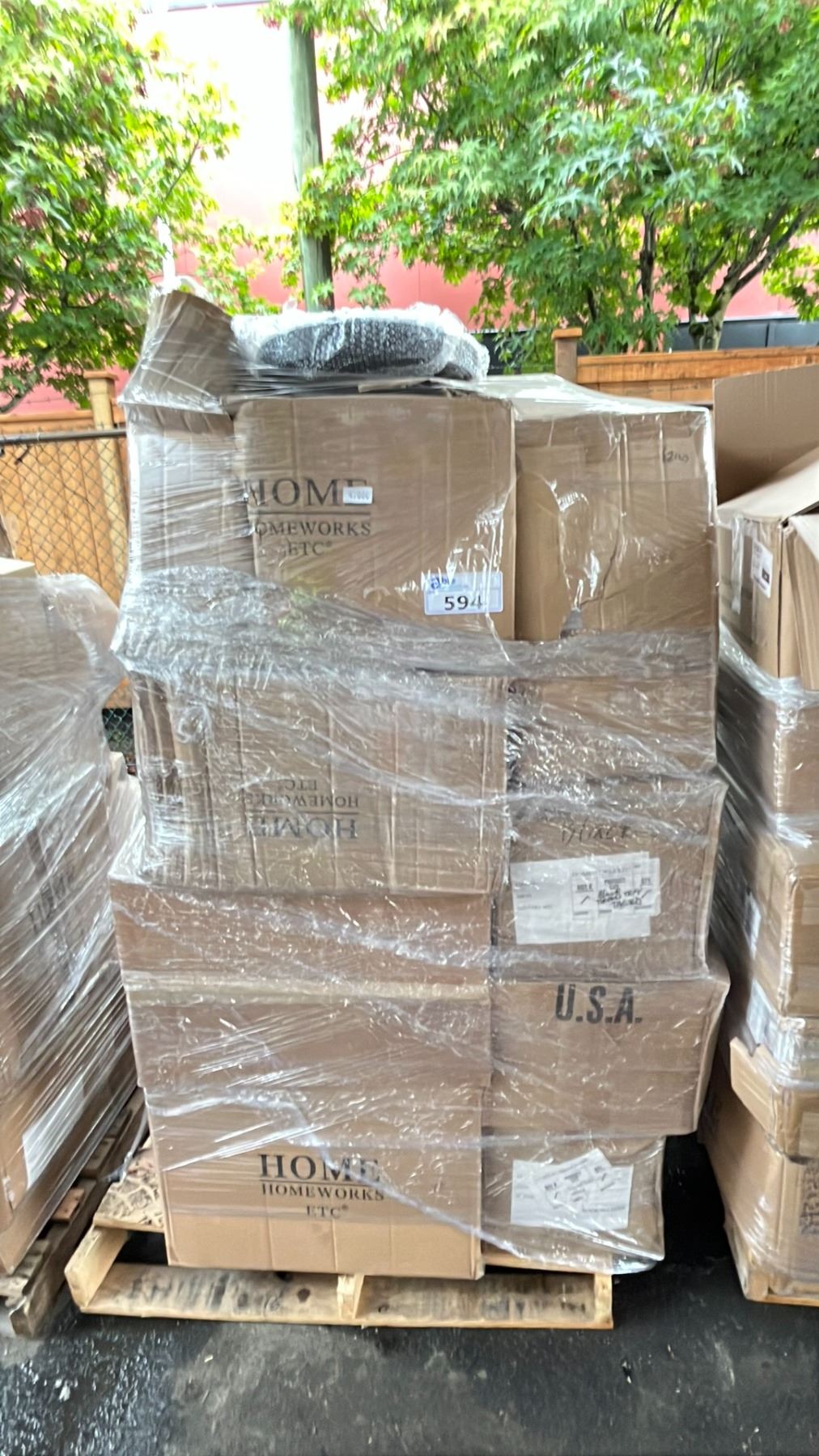 PALLET OF HOME GOODS - BLACK & WHITE 2 TIER WOODEN TRAYS, WOODEN CUT OUTS, ULINE CLEAR RETAIL