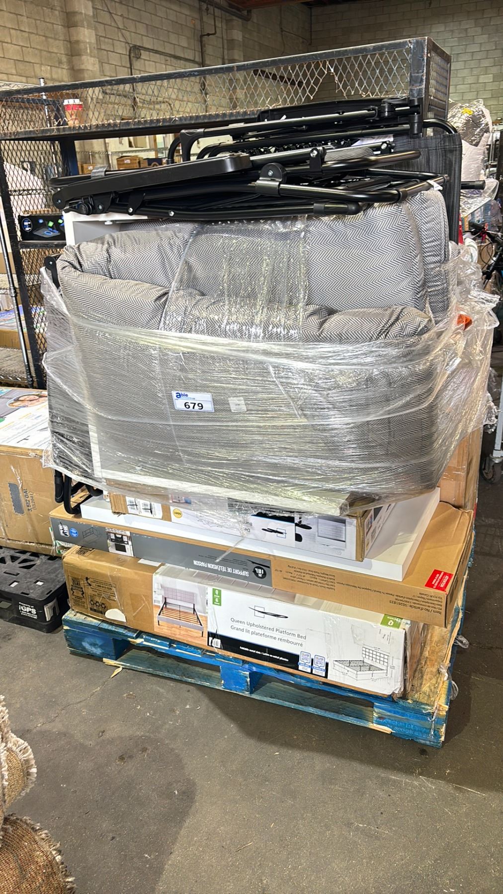 PALLET OF HOME GOODS - PARASON TV STAND, FOLDING CHAIRS, PLATFORM BED, CUSHIONS, TV STAND & MORE *MUST TAKE ALL ON PALLET*
