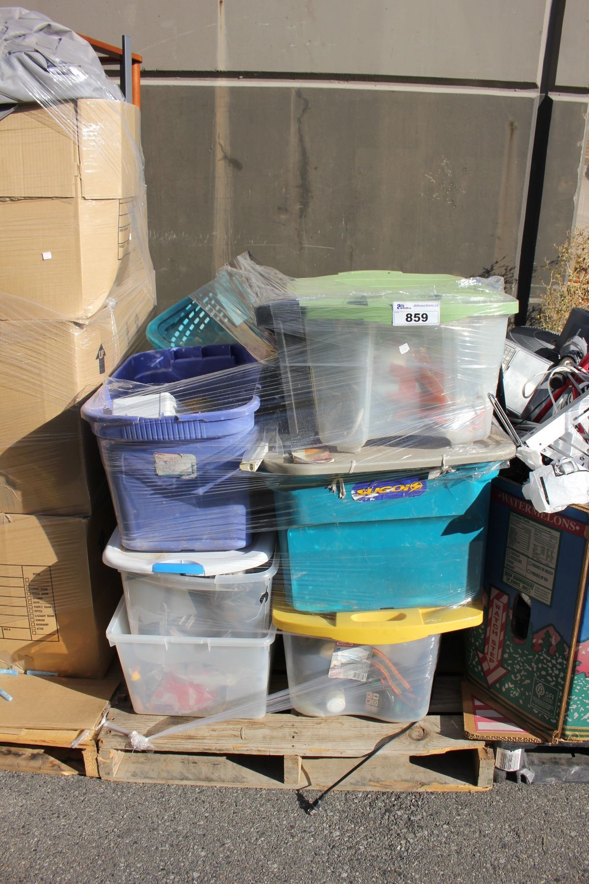 PALLET OF HOUSEHOLD GOODS, BINS AND MORE