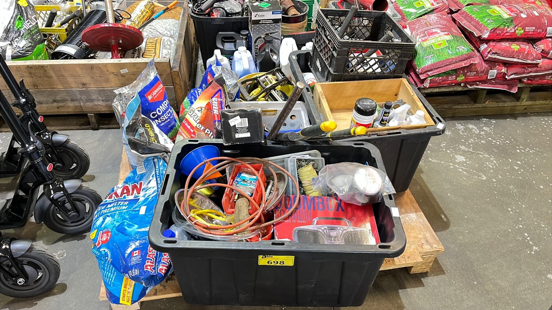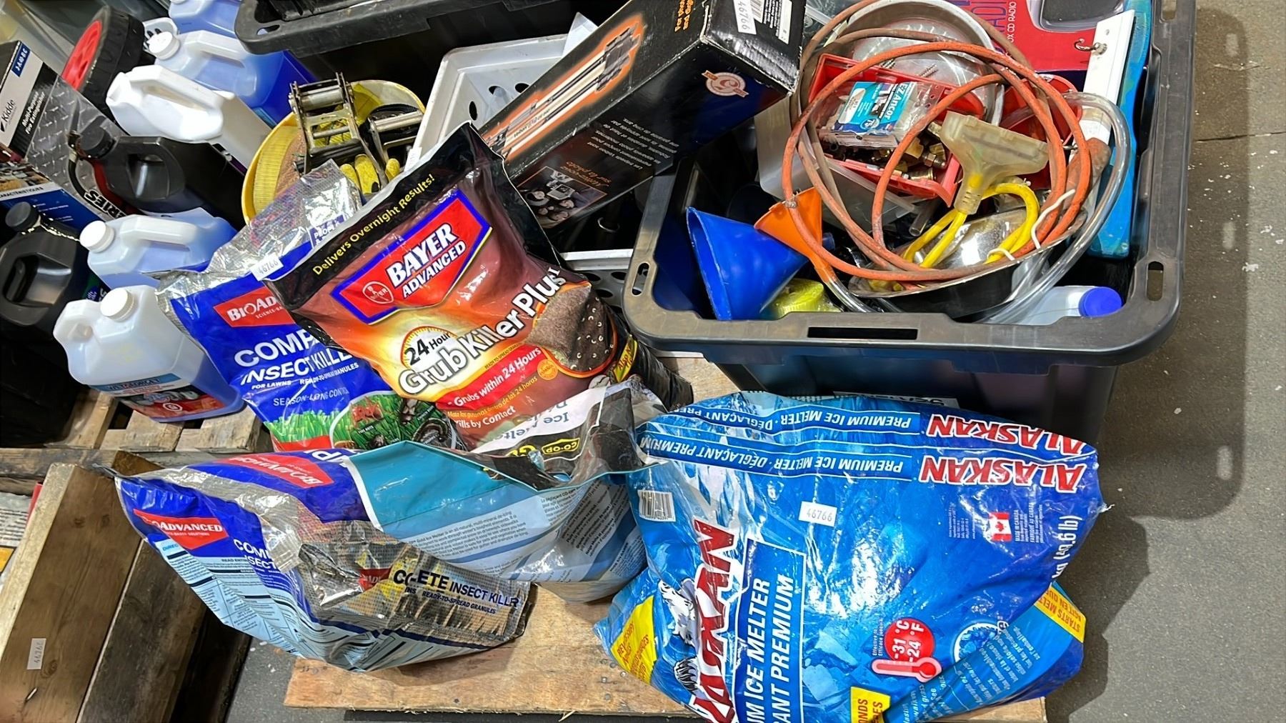 PALLET OF ICE MELTER, INSECT KILLER, RATCHET STRAPS, HARDWARE, SMALL HAND TOOLS & MORE