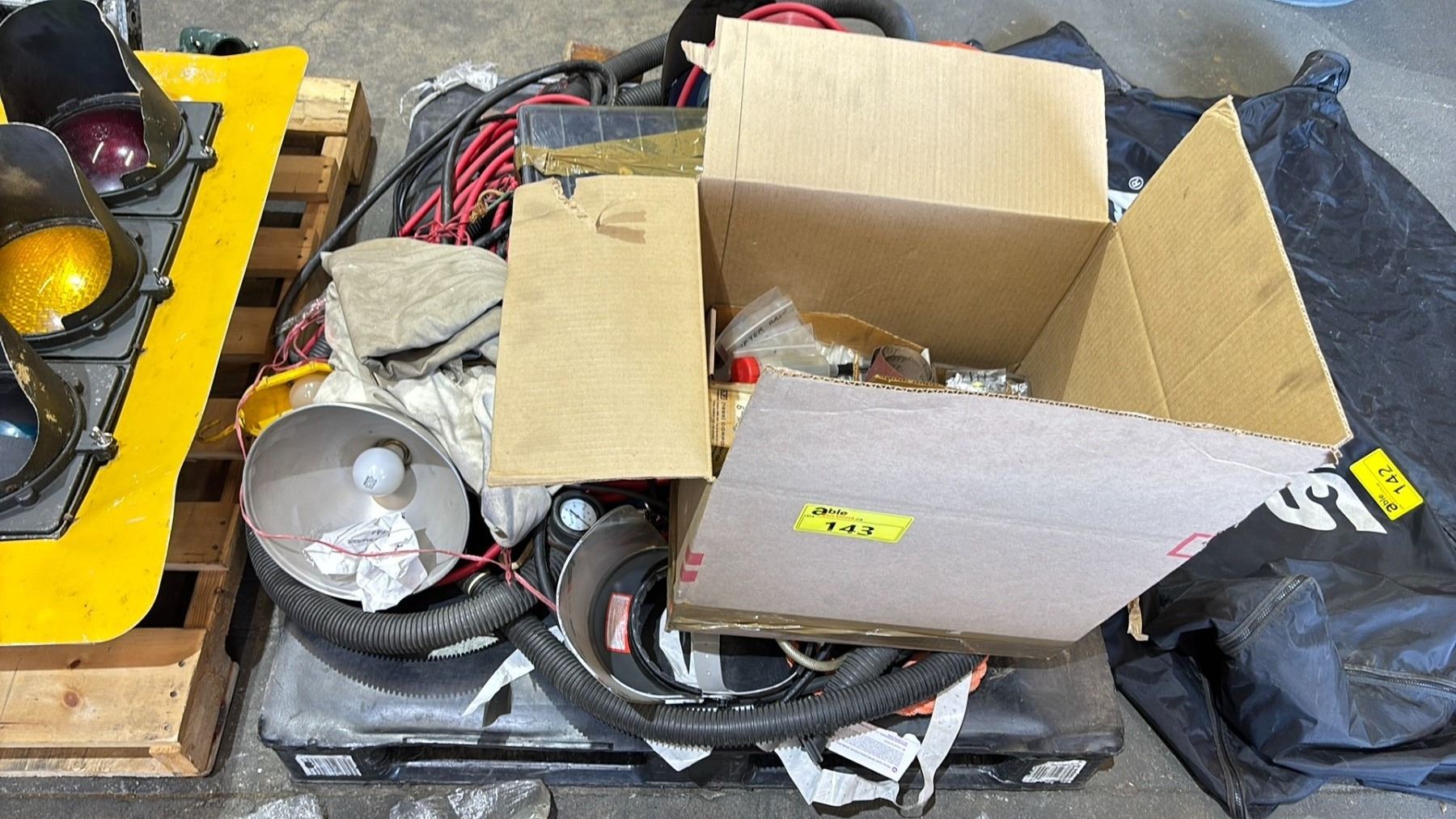 PALLET OF INDUSTRIAL GOODS - PORTABLE AIR TANK, HOSES, LIGHTS, SMALL PARTS ORGANIZER, VACUUM & MORE *MUST TAKE ALL ON PALLET*
