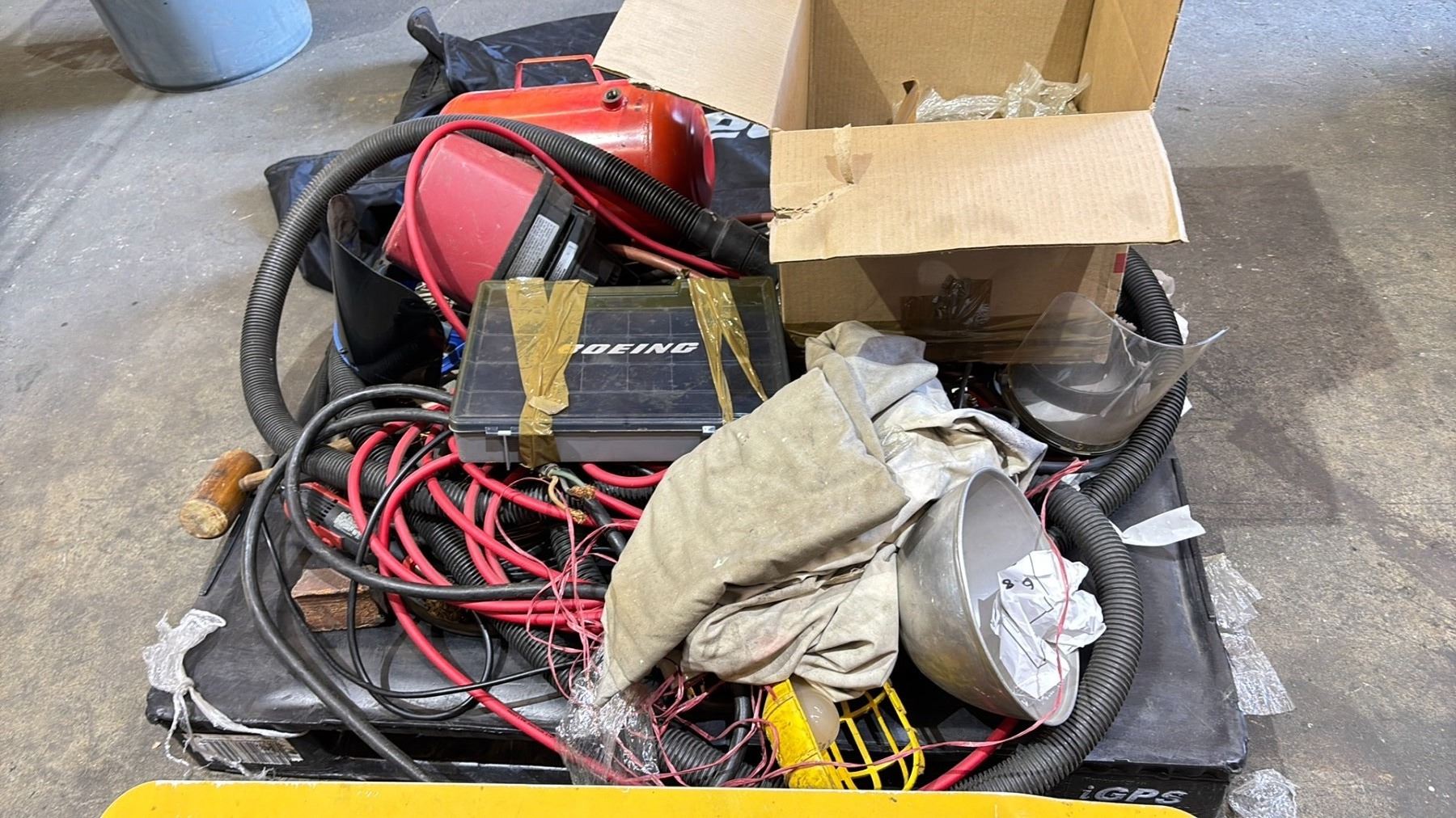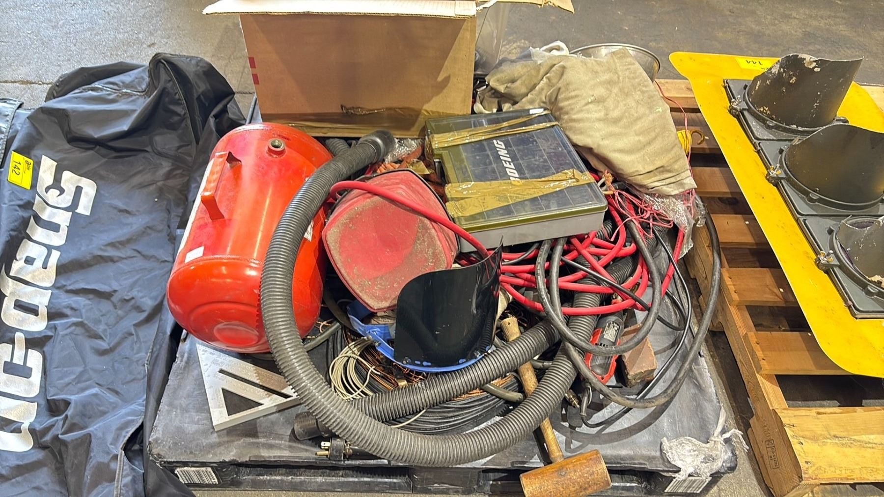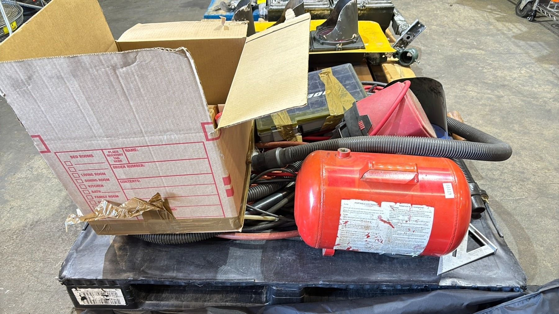 PALLET OF INDUSTRIAL GOODS - PORTABLE AIR TANK, HOSES, LIGHTS, SMALL PARTS ORGANIZER, VACUUM & MORE