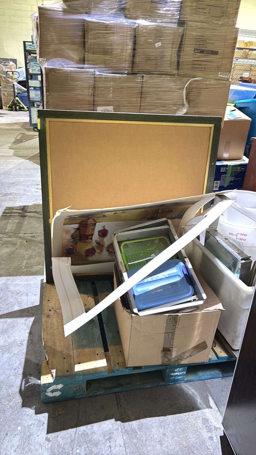 PALLET OF LARGE MIXING WHISK, MEASURING BINS, ART FRAME AND MORE