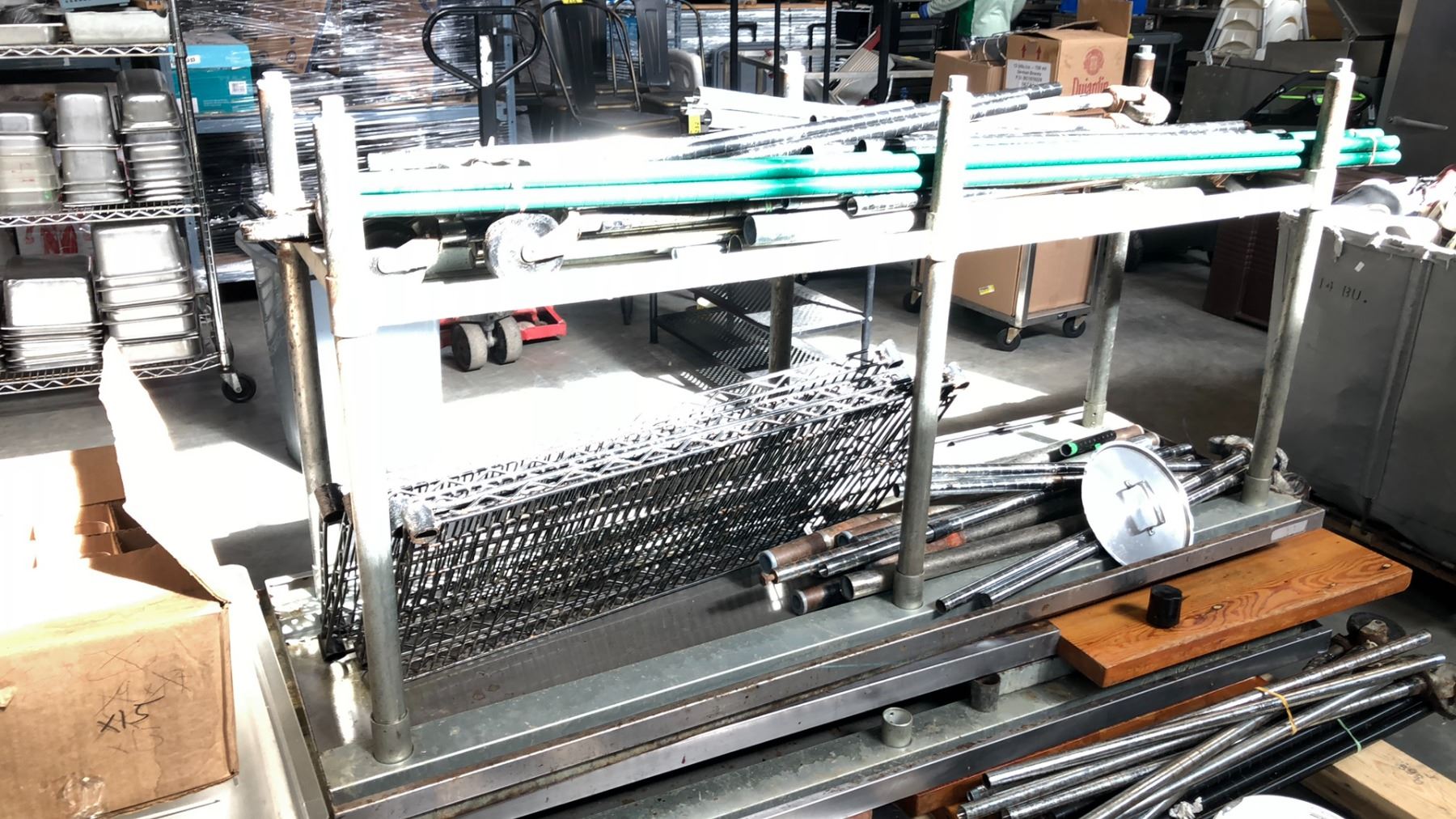 PALLET OF METRO RACKING PARTS, TABLE PARTS AND BINS OF DRINKING GLASSES/COOKWARE *LOCATED AT 101-11539 136 ST SURREY*