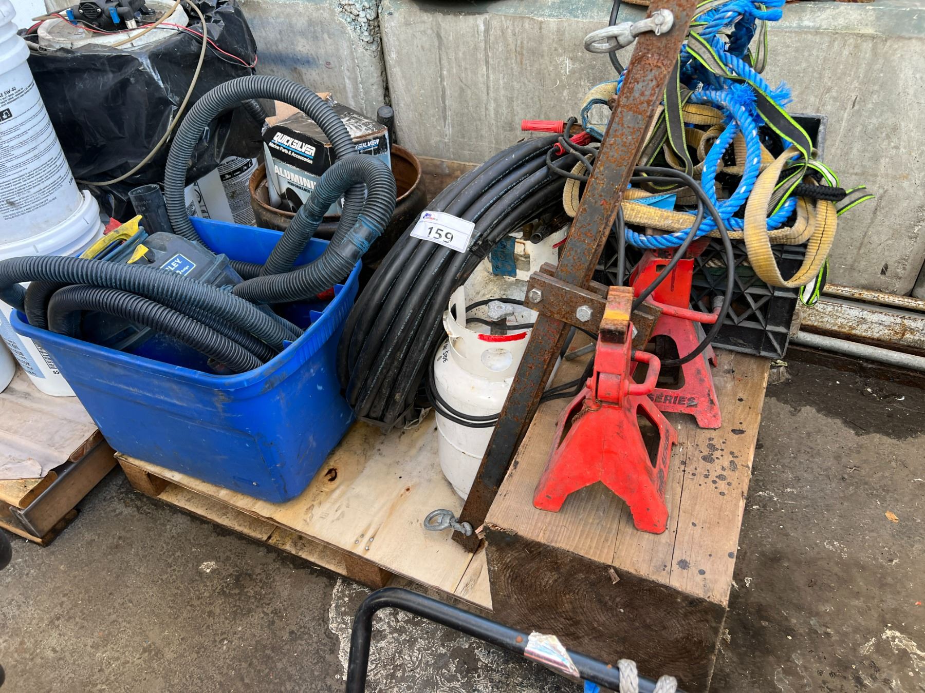 PALLET OF MISCELLANEOUS ITEMS-PROPANE TANKS, JACK STANDS, HEAVY DUTY ROLL COPPER WIRING, ETC.