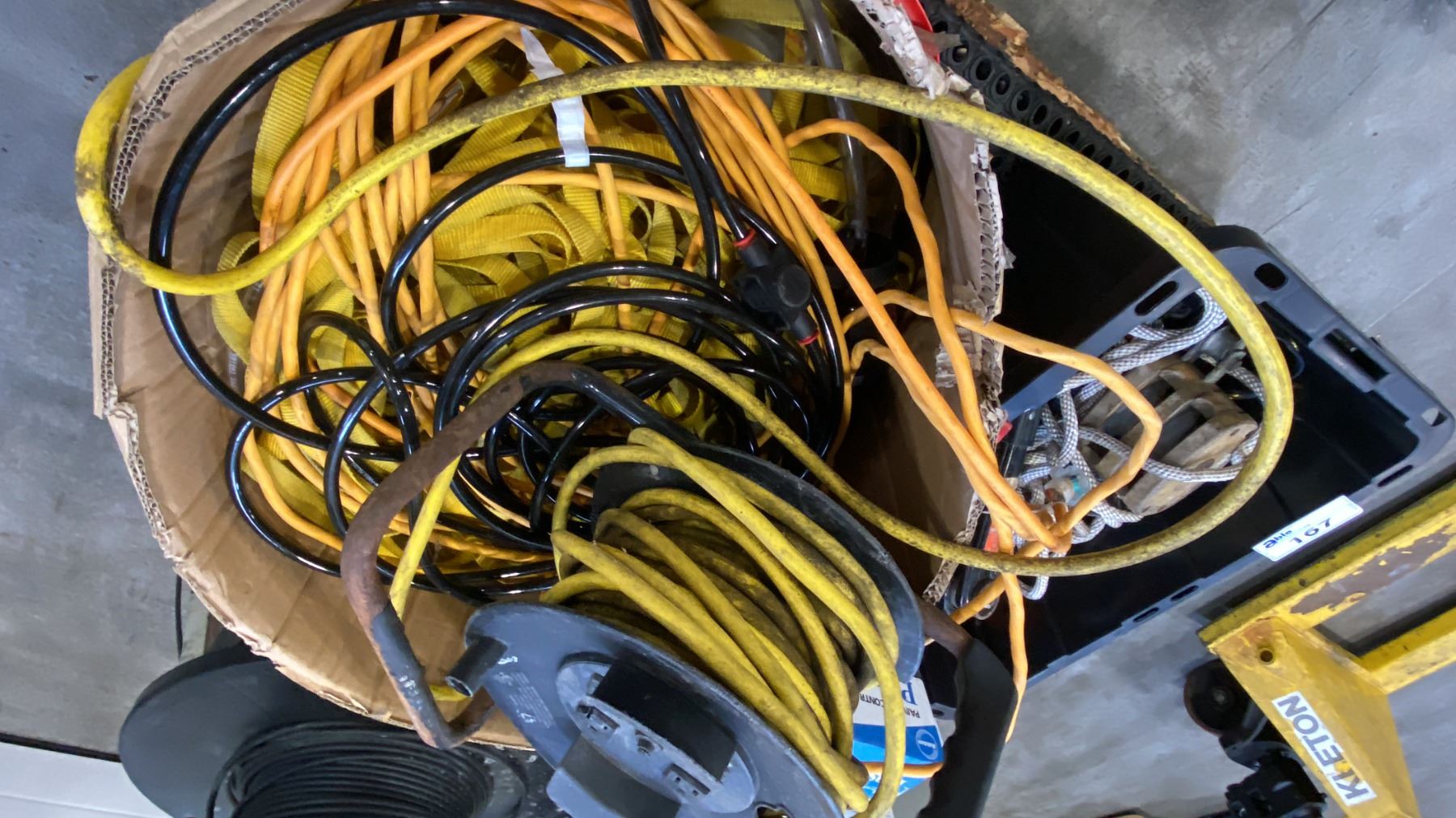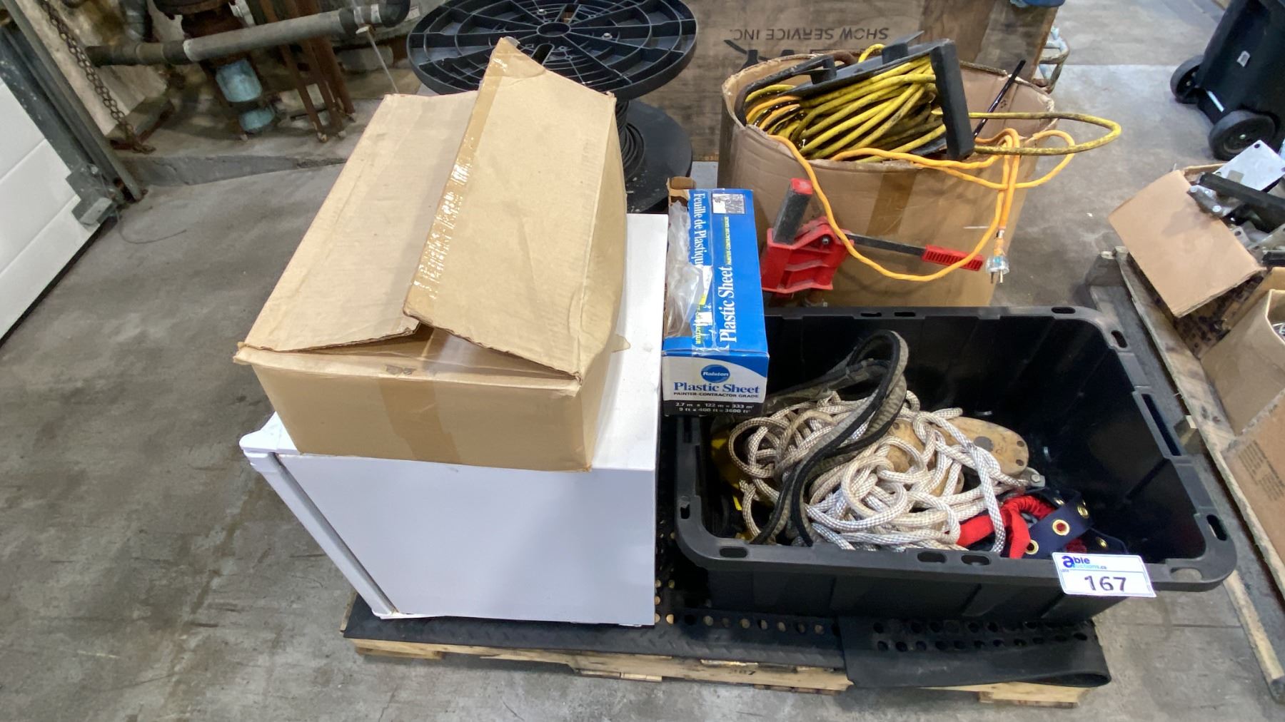 PALLET OF MIXED ITEMS INCL DANBY COMPACT FRIDGE, DOUBLE WOODEN BLOCK PULLEYS, LAGGING ROPES, EXTENSION CORDS, STEP STOOL AND MORE