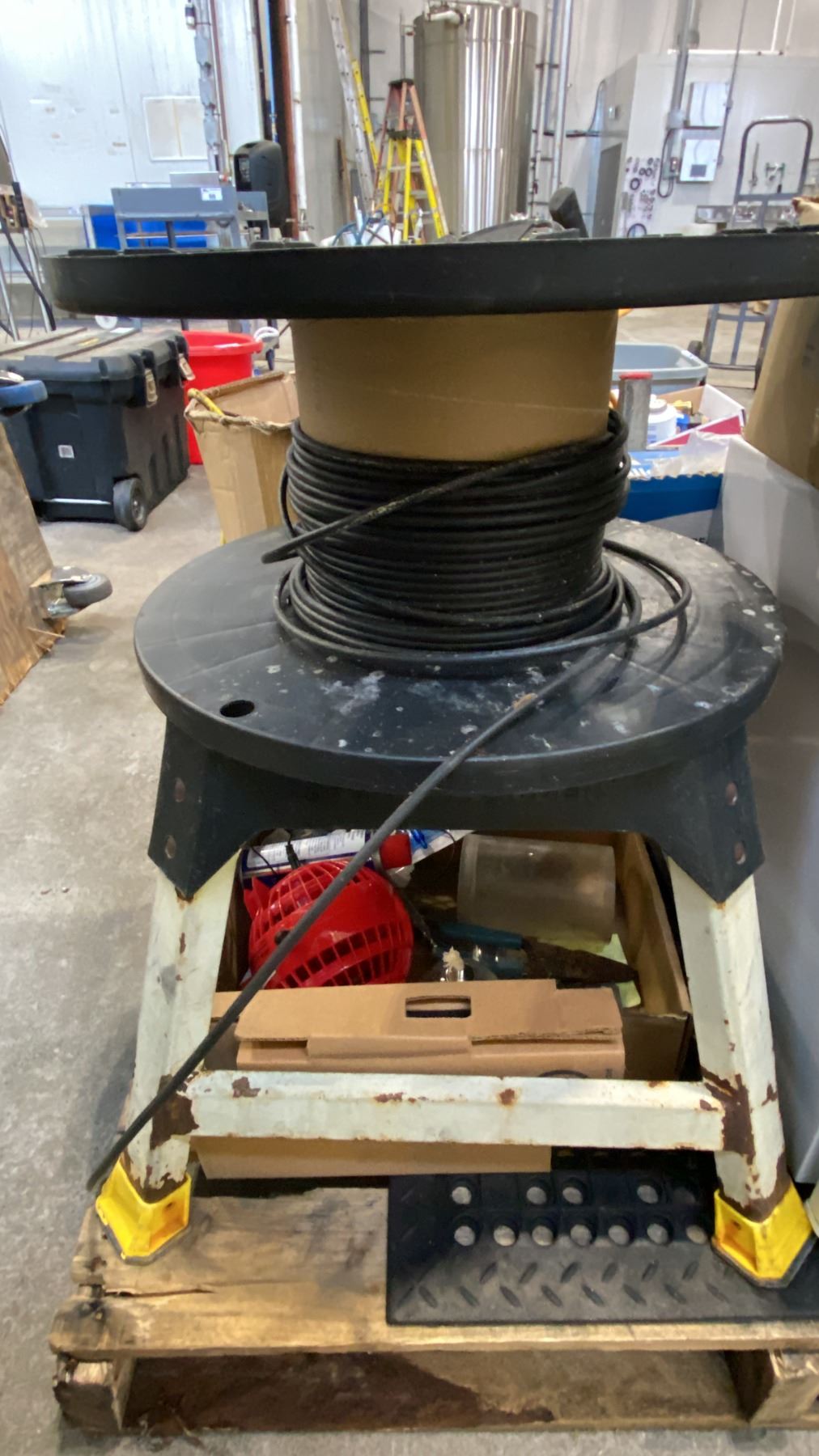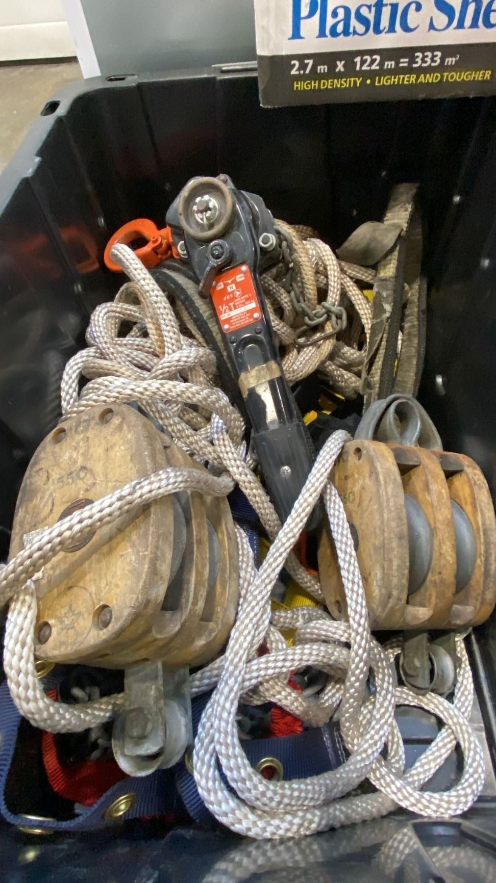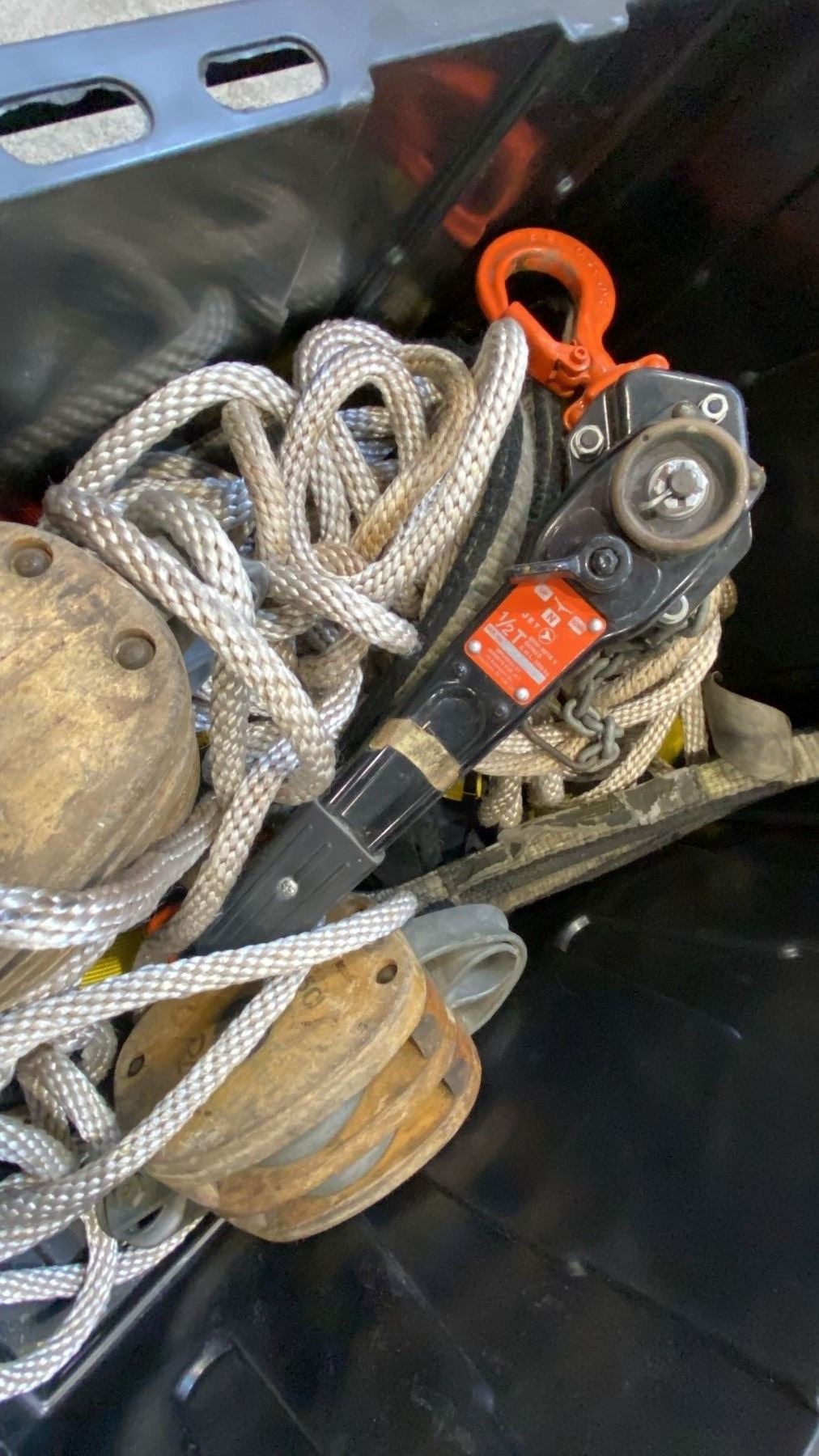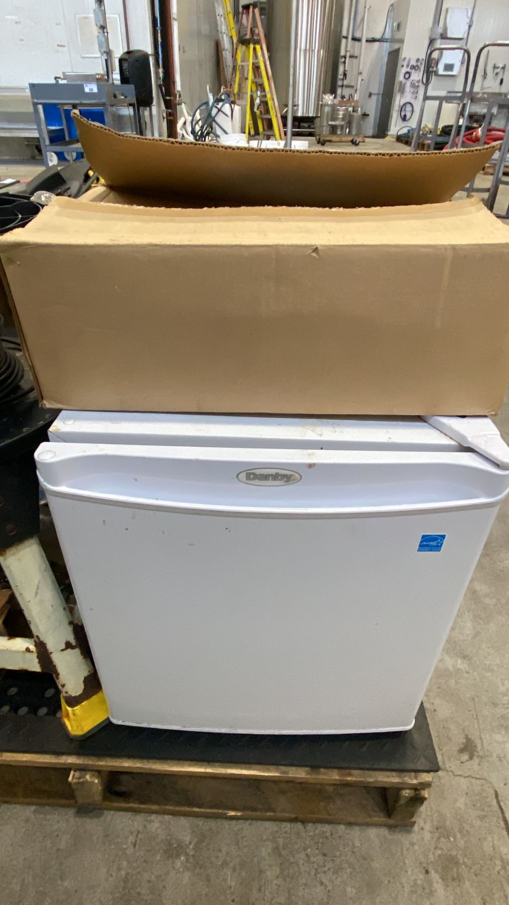 PALLET OF MIXED ITEMS INCL DANBY COMPACT FRIDGE, DOUBLE WOODEN BLOCK PULLEYS, LAGGING ROPES,