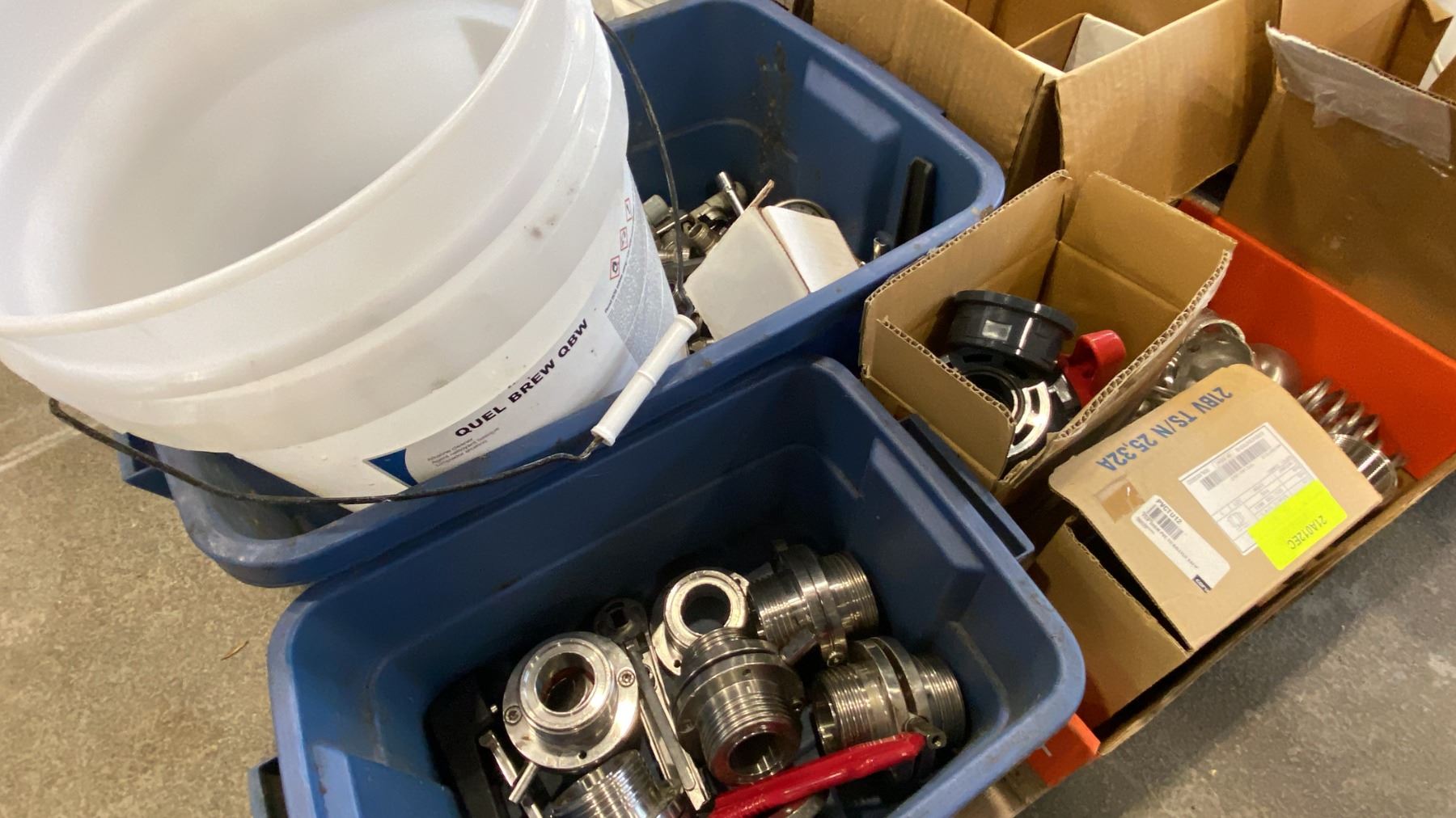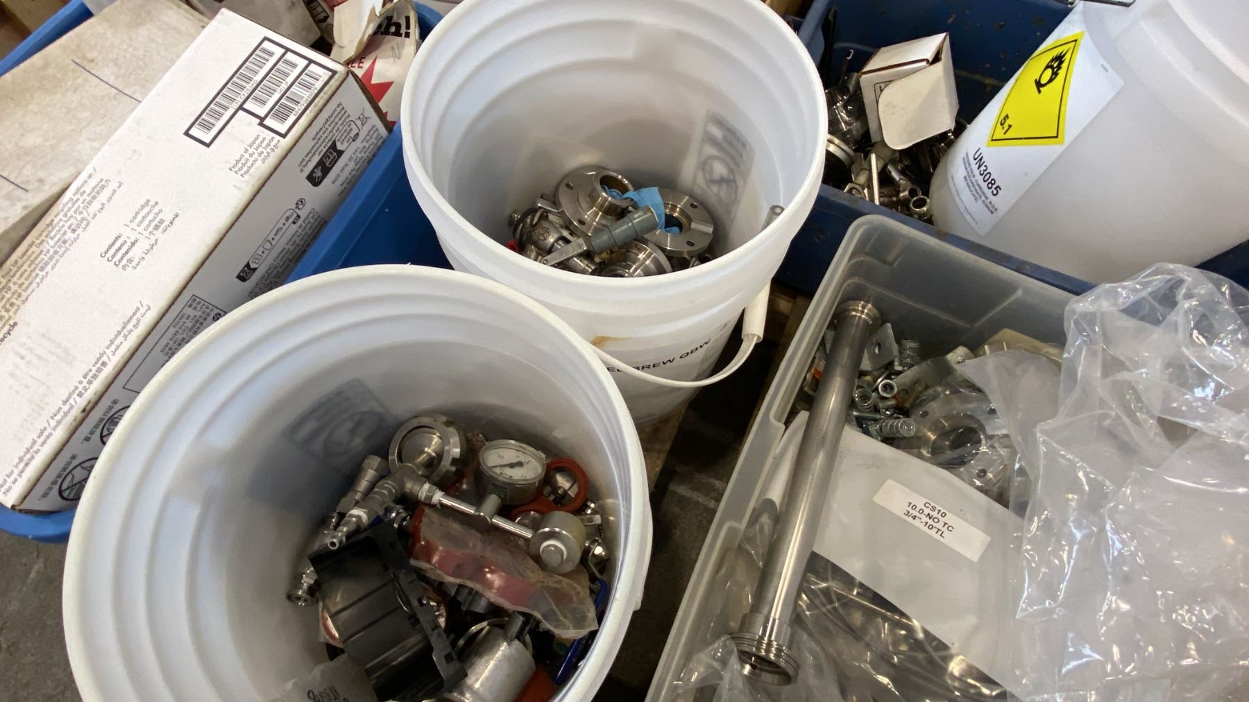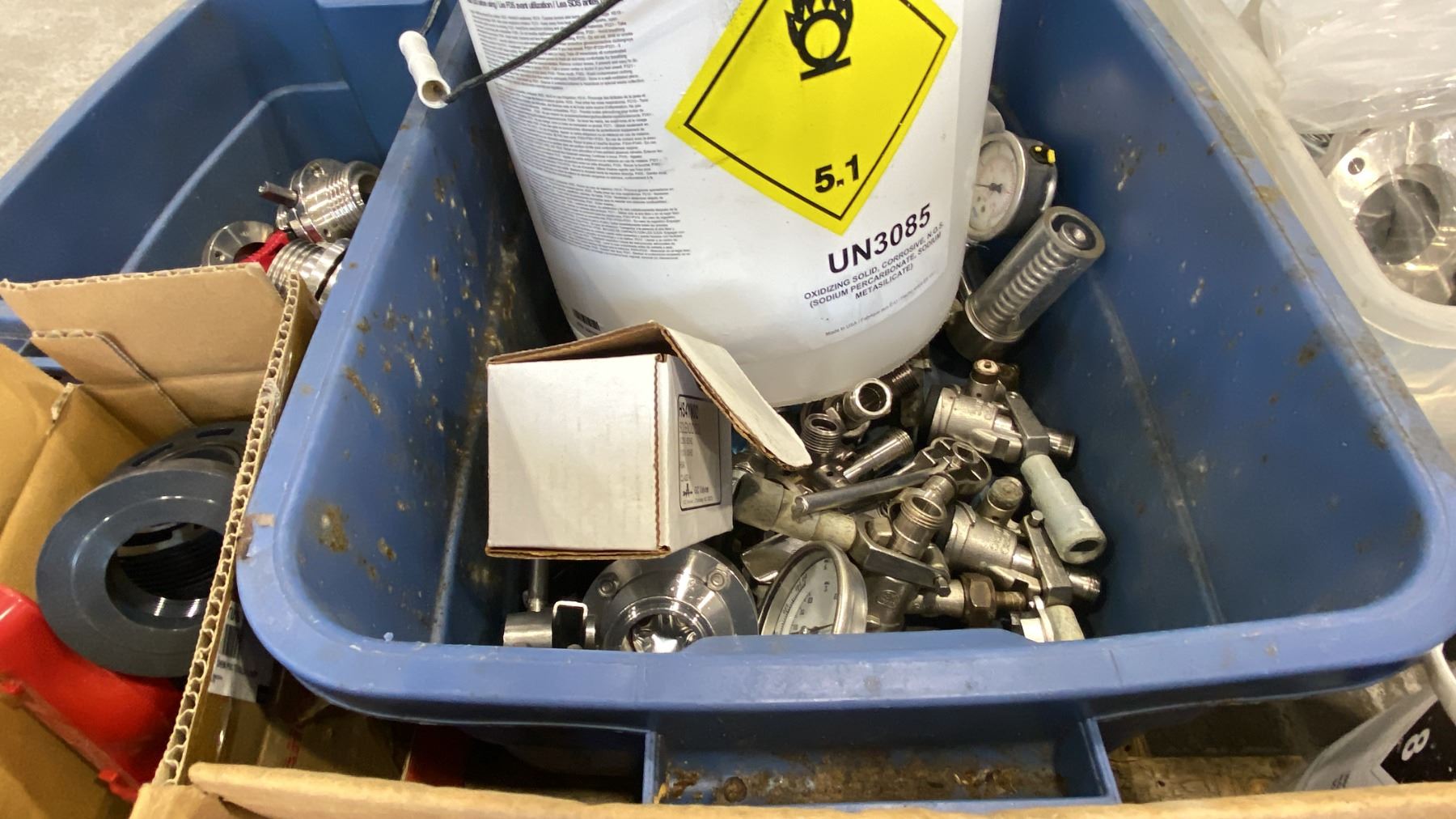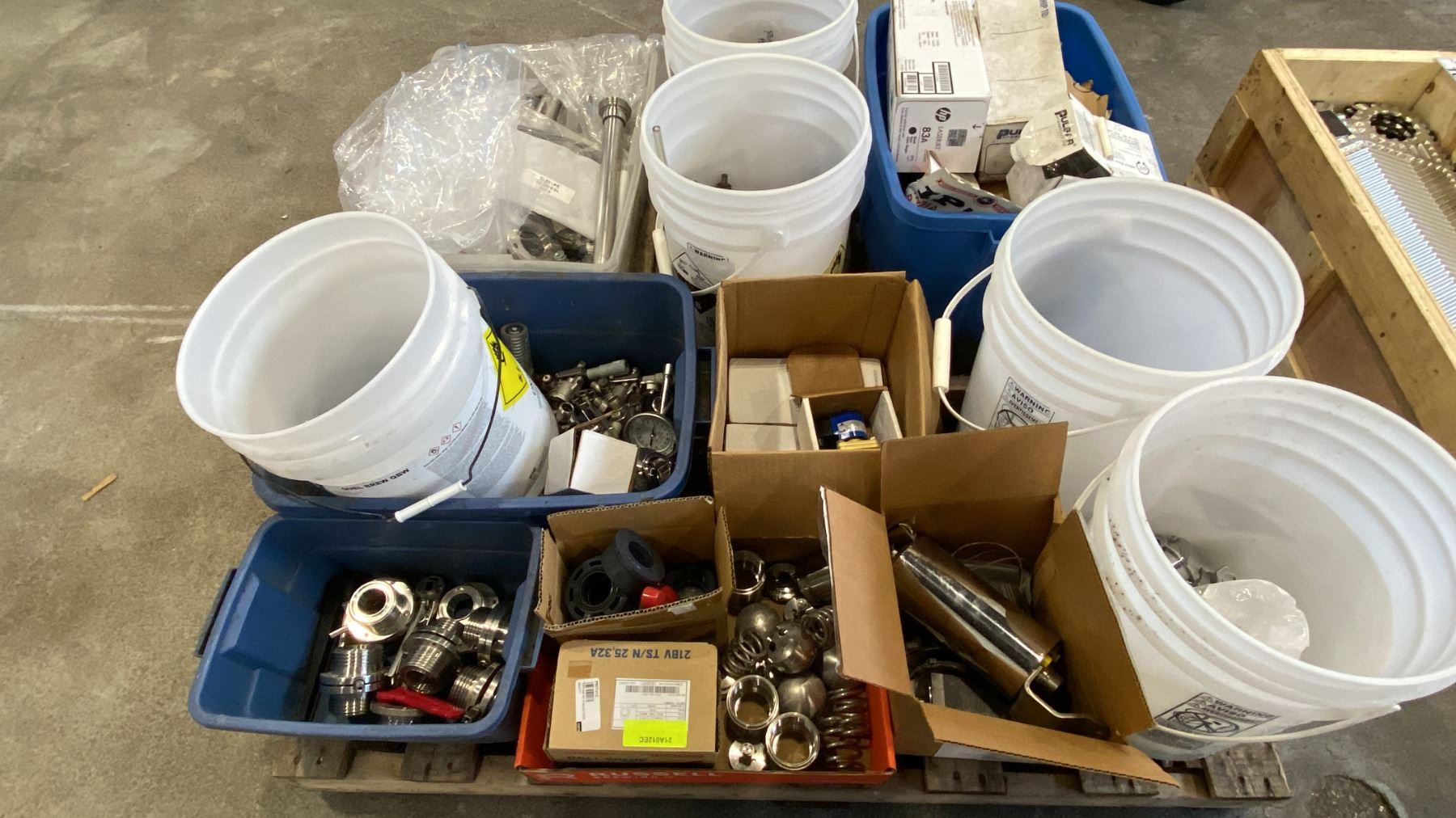 PALLET OF MIXED ITEMS INCL TRI-CLAMP FITTINGS, GAUGES, SHUTOFF VALVES, SANITARY FITTINGS AND MORE