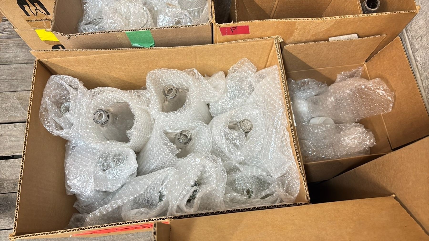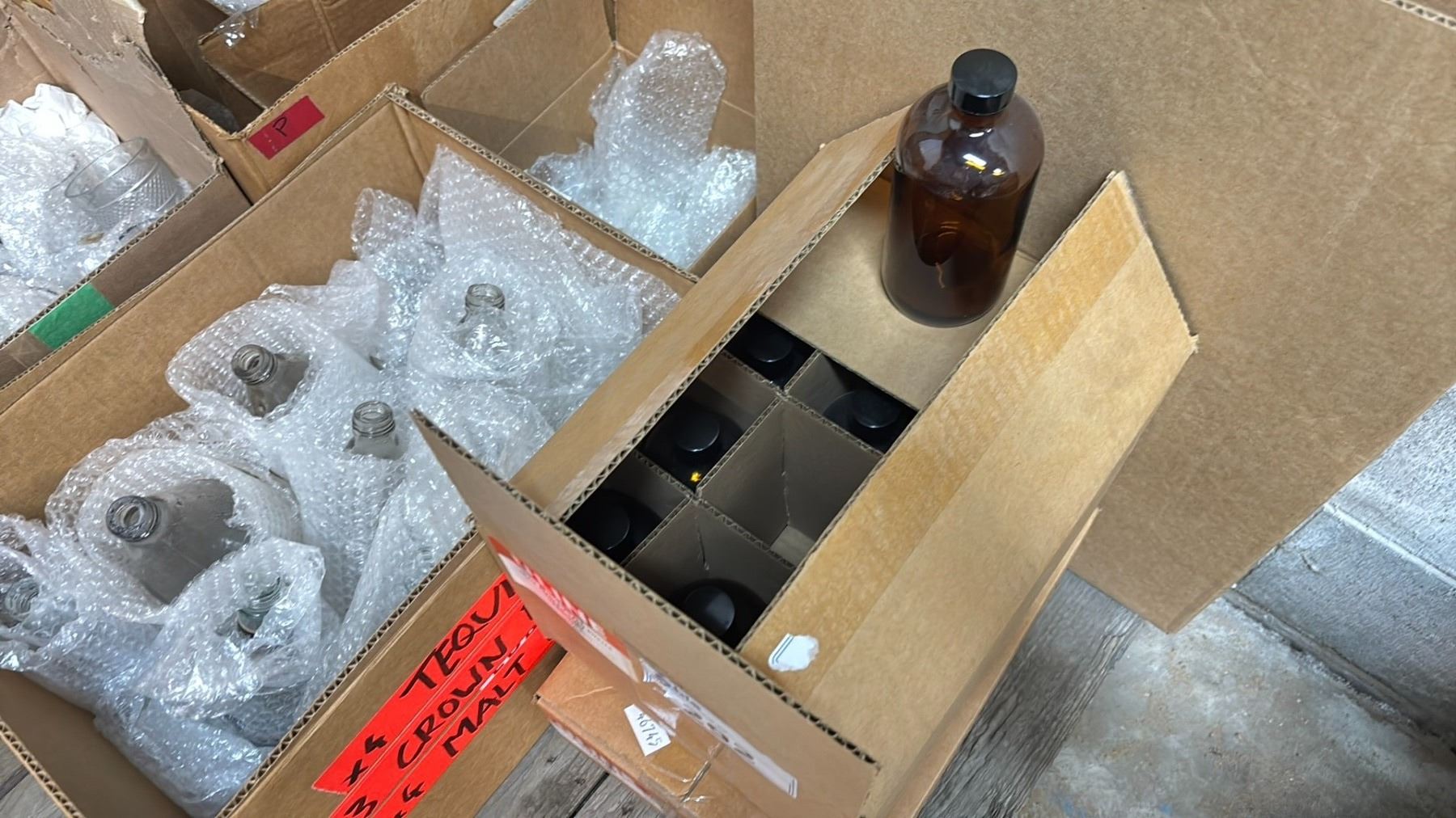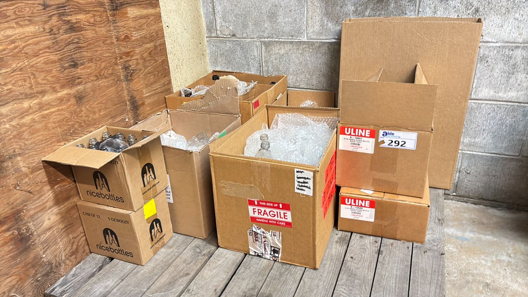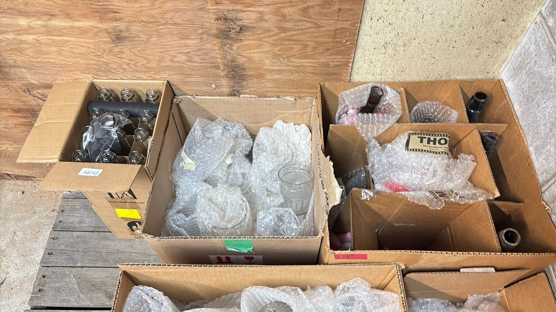 PALLET OF MOVIE PROP BREAKAWAY GLASS BOTTLES, PLASTIC DRINKING GLASSES, FAKE SCOPES, AMBER GLASS BOTTLES &NICEBOTTLES