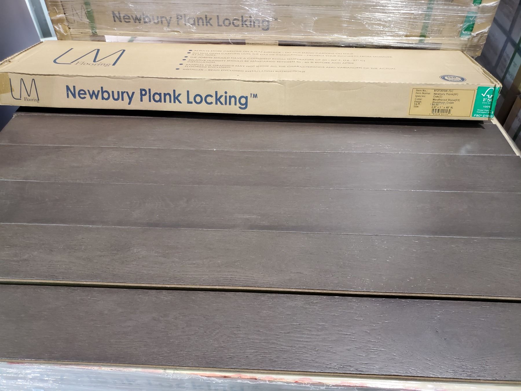 PALLET OF NEWBURY PLANK LOCKING FLOORING (SPECIES: OAK) WEATHERED STONE COLOUR, ALUMINUM OXIDE FINISH, 33 BOXES 26.55 SQ FT PER BOX TOTAL SQUARE FOOTAGE 876.15 SQ FT 3/8" X 5" X 48" PLANK SIZE