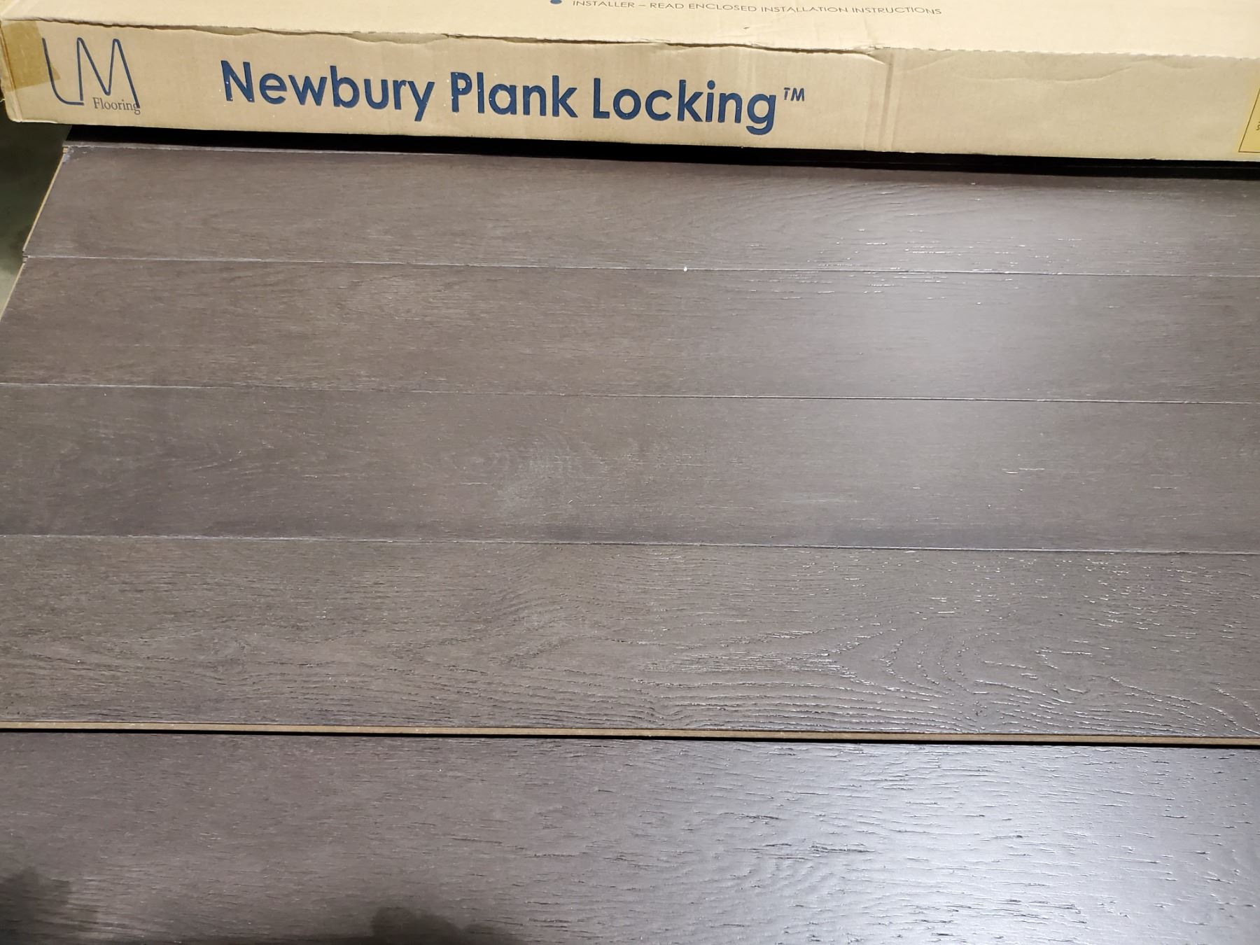 PALLET OF NEWBURY PLANK LOCKING FLOORING (SPECIES: OAK) WEATHERED STONE COLOUR, ALUMINUM OXIDE FINISH, 33 BOXES 26.55 SQ FT PER BOX TOTAL SQUARE FOOTAGE 876.15 SQ FT 3/8" X 5" X 48" PLANK SIZE