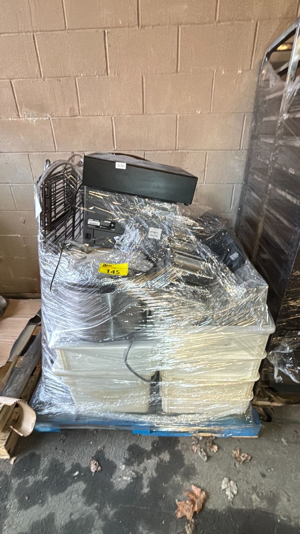 PALLET OF PRINTER, WIRE RACK, BINS AND MORE