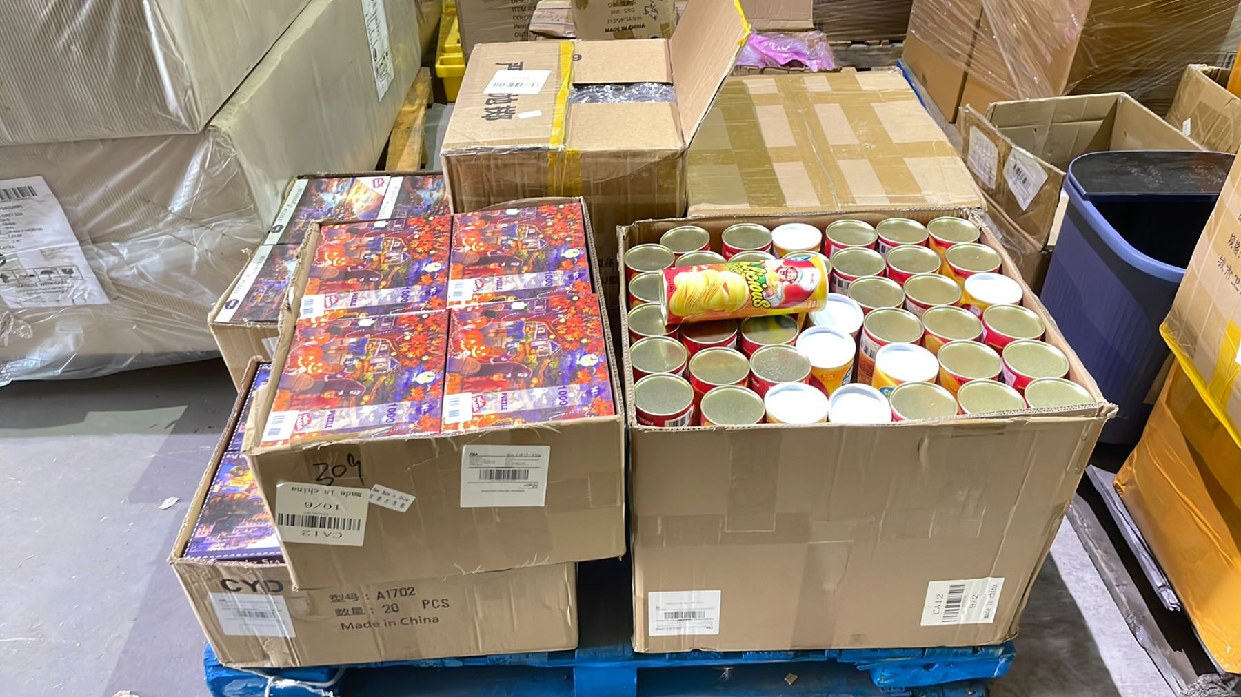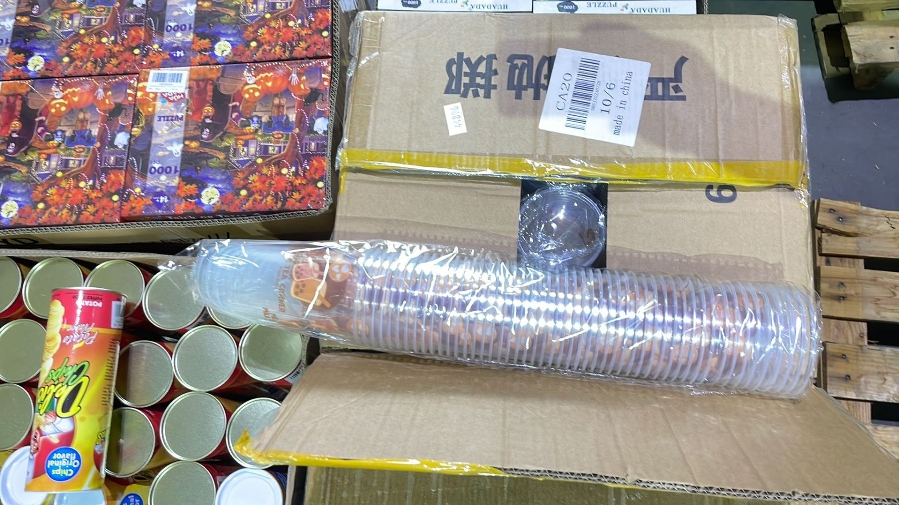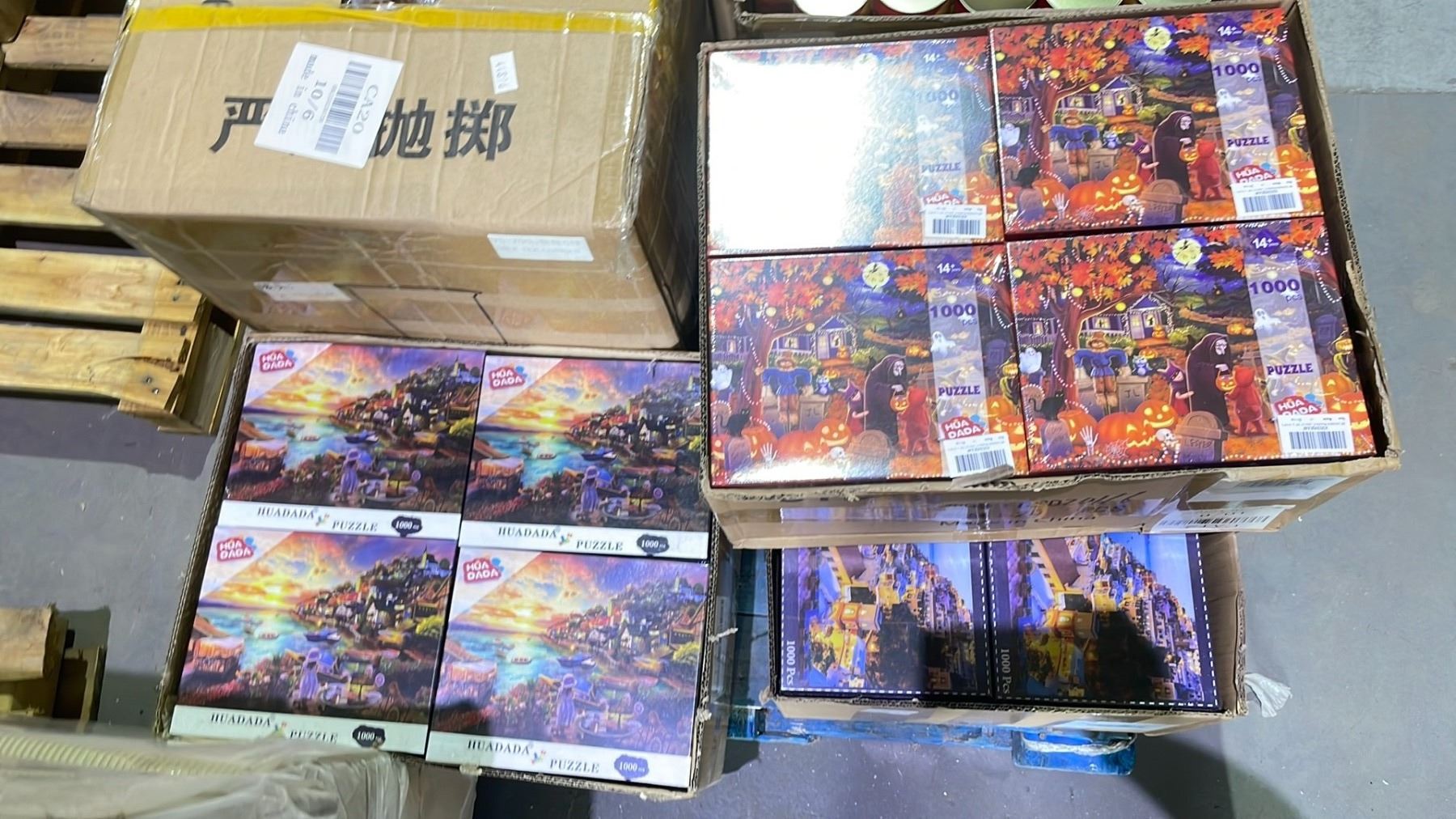 PALLET OF PUZZLES, PRANK CHIP CONTAINERS, DISPOSABLE PLASTIC CUPS AND MORE