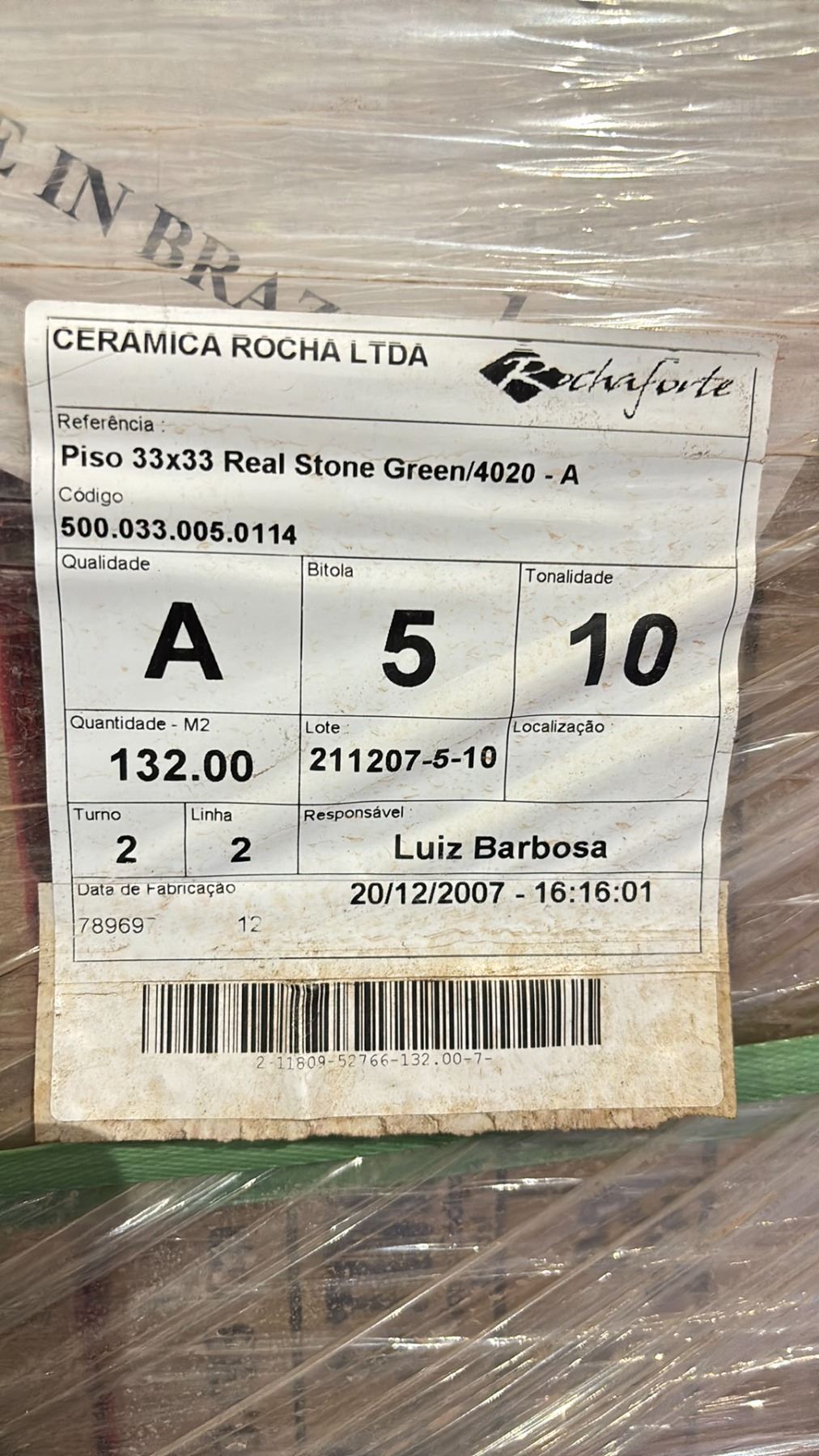 PALLET OF ROCHA CERAMICS PISO 33CM X 33CM REAL STONE GREEN/4020-A CERAMIC TILE FLOORING APPROX 132 SQ. METERS- OFF SITE PICK UP AT 26251 FRASER HWY