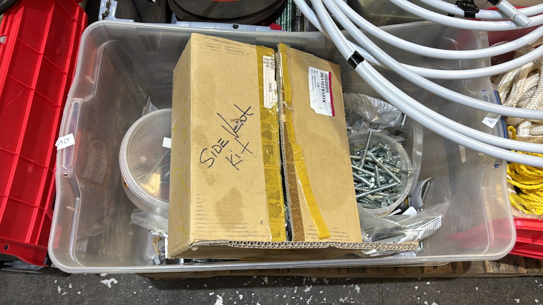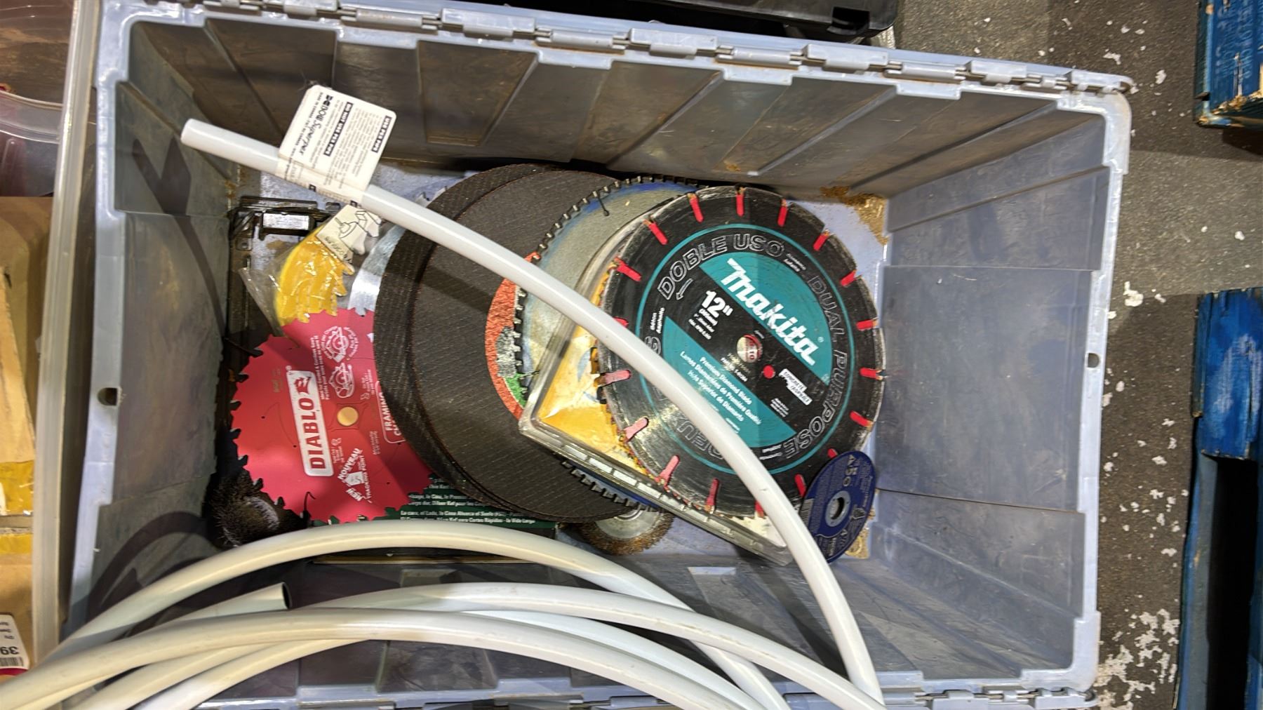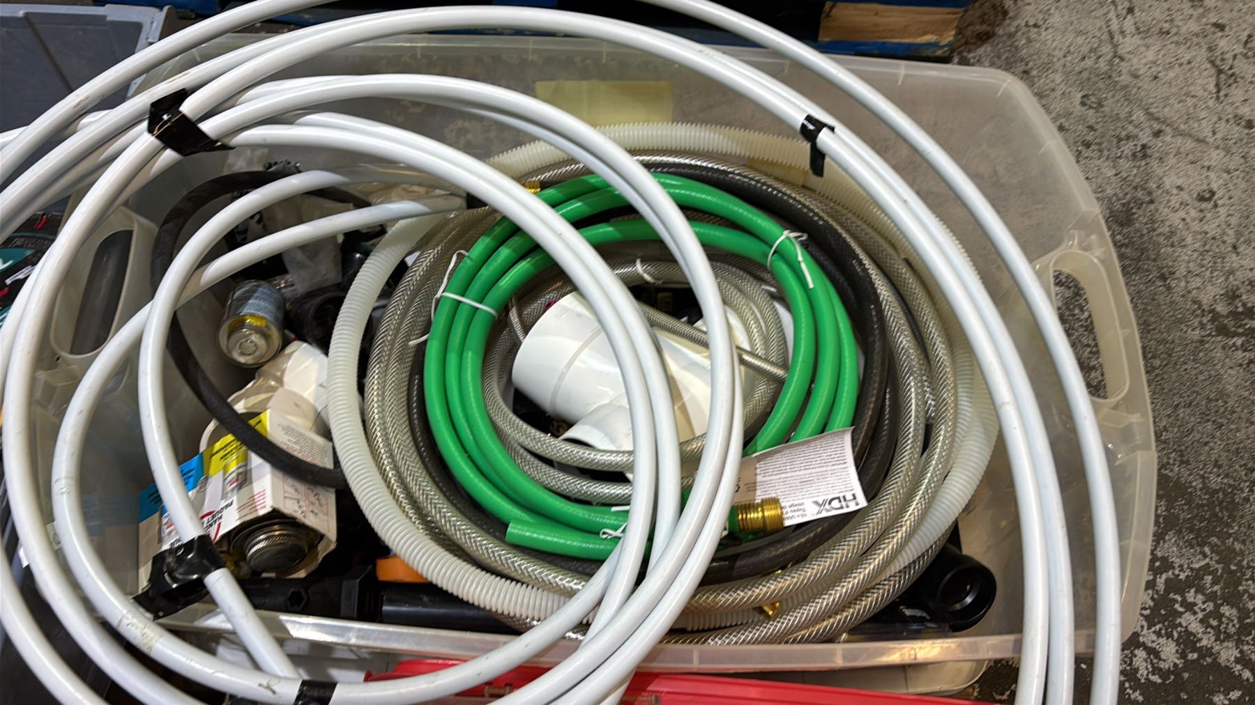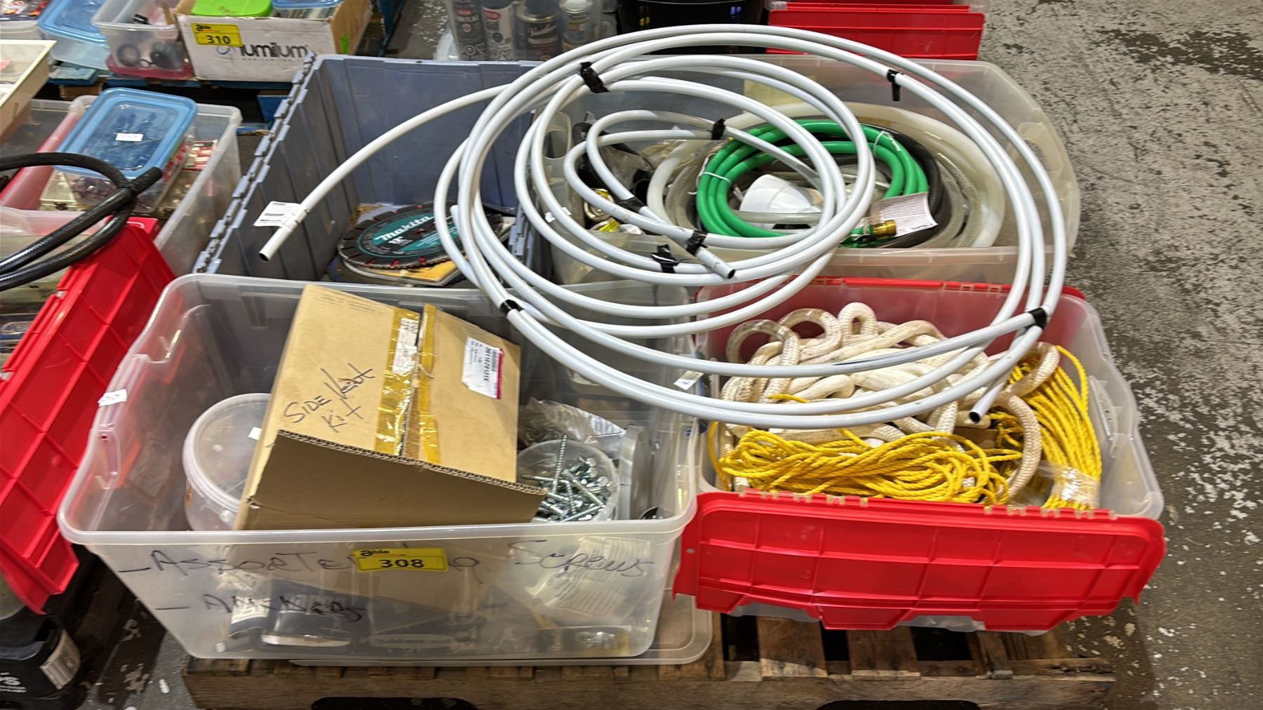 PALLET OF ROPES, PLASTIC PIPE, ASSORTED HOSES, PVC PIPE CONNECTORS & ASSORTED GRINDING WHEELS *MUST
