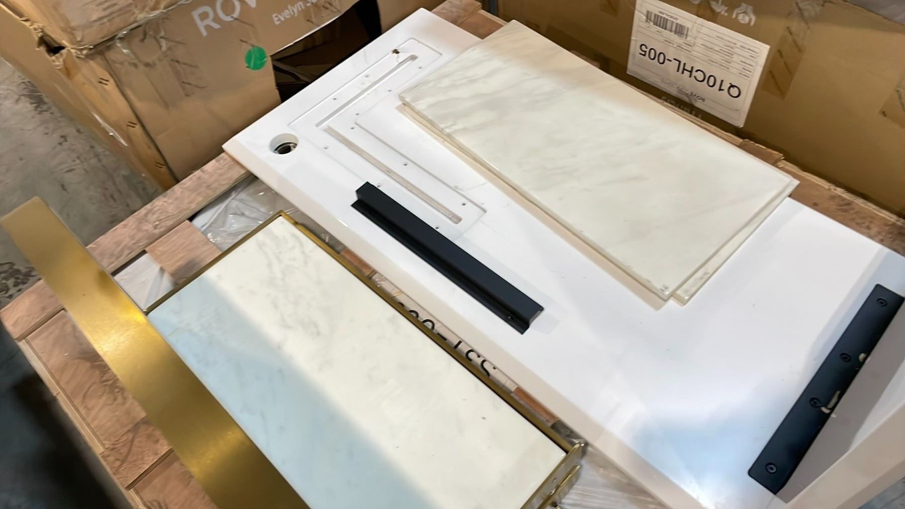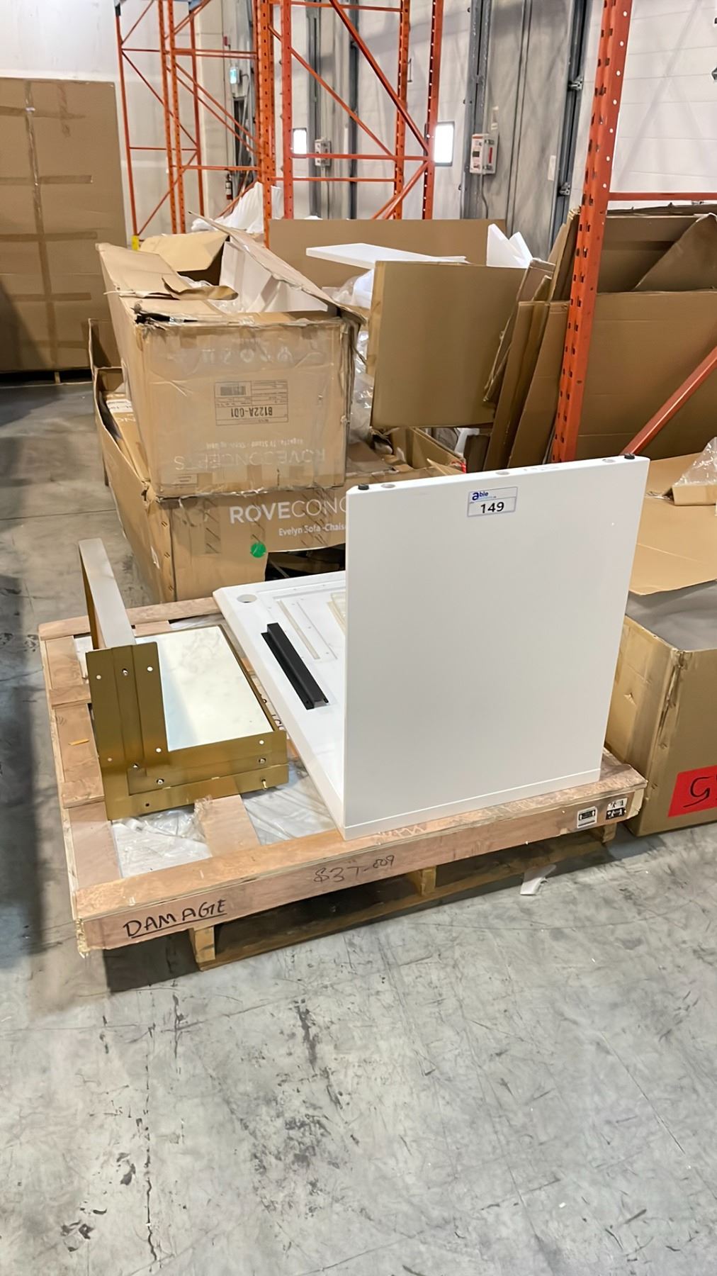 PALLET OF ROVE CONCEPTS DESIGNER ASSORTED DESK PARTS & ROUND TABLE TOP PARTS *MUST TAKE ALL ON PALLET*