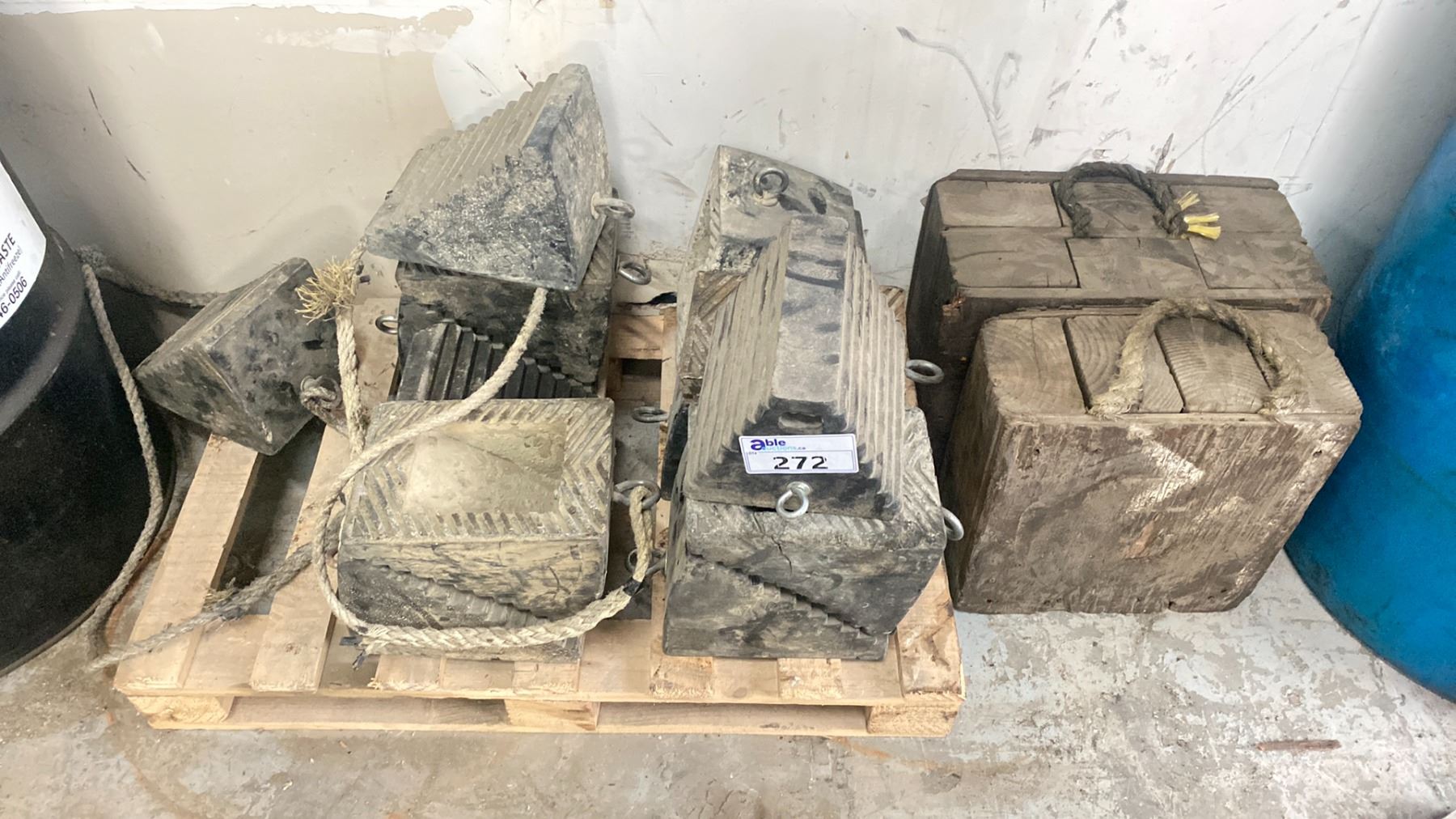PALLET OF RUBBER & WOODEN TIRE CHULKS WITH A REFLECTIVE TRAFFIC CONE