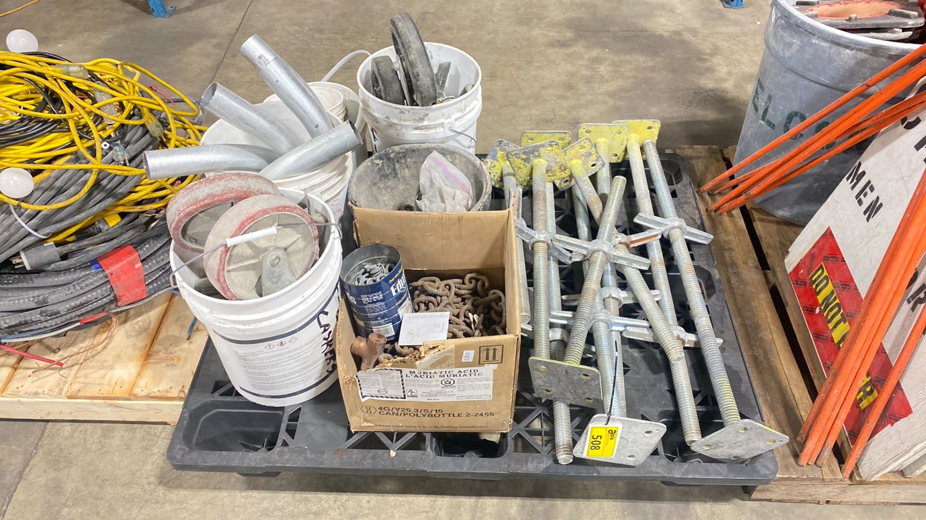 PALLET OF SCAFFOLDING SCREW FEET, CASTERS, PIPING & CHAIN
