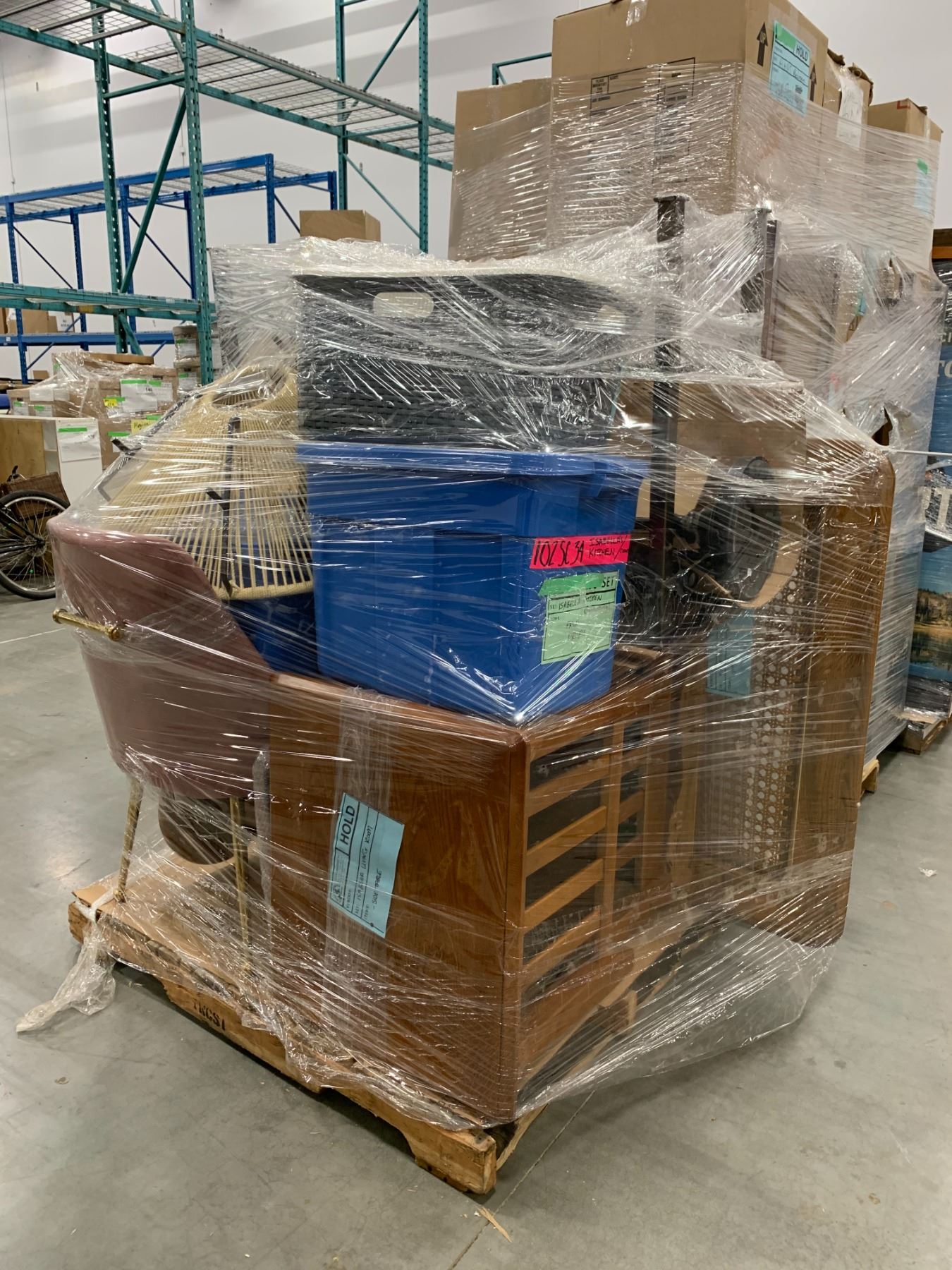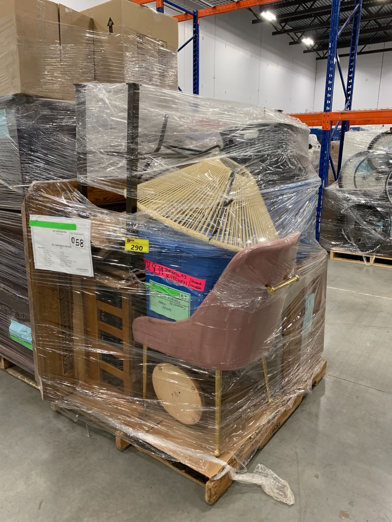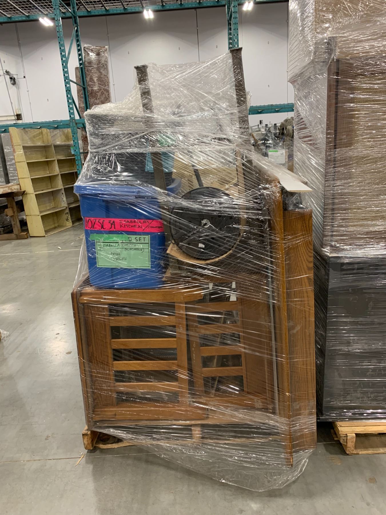 PALLET OF SET DEC ITEMS INCLUDING; BIG TABLE, PINK DESK CHAIR, LAMPS AND MORE