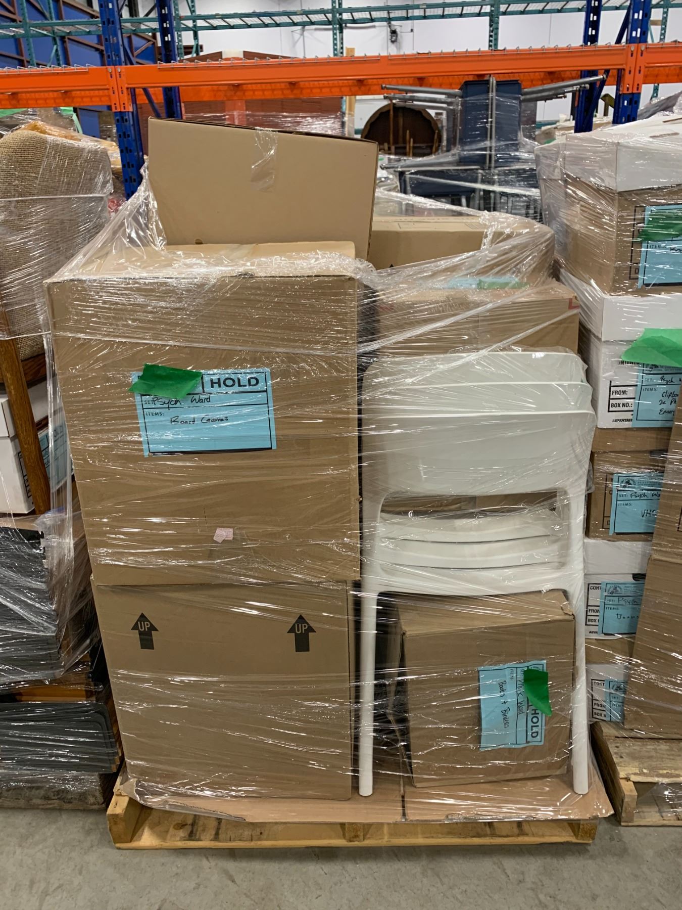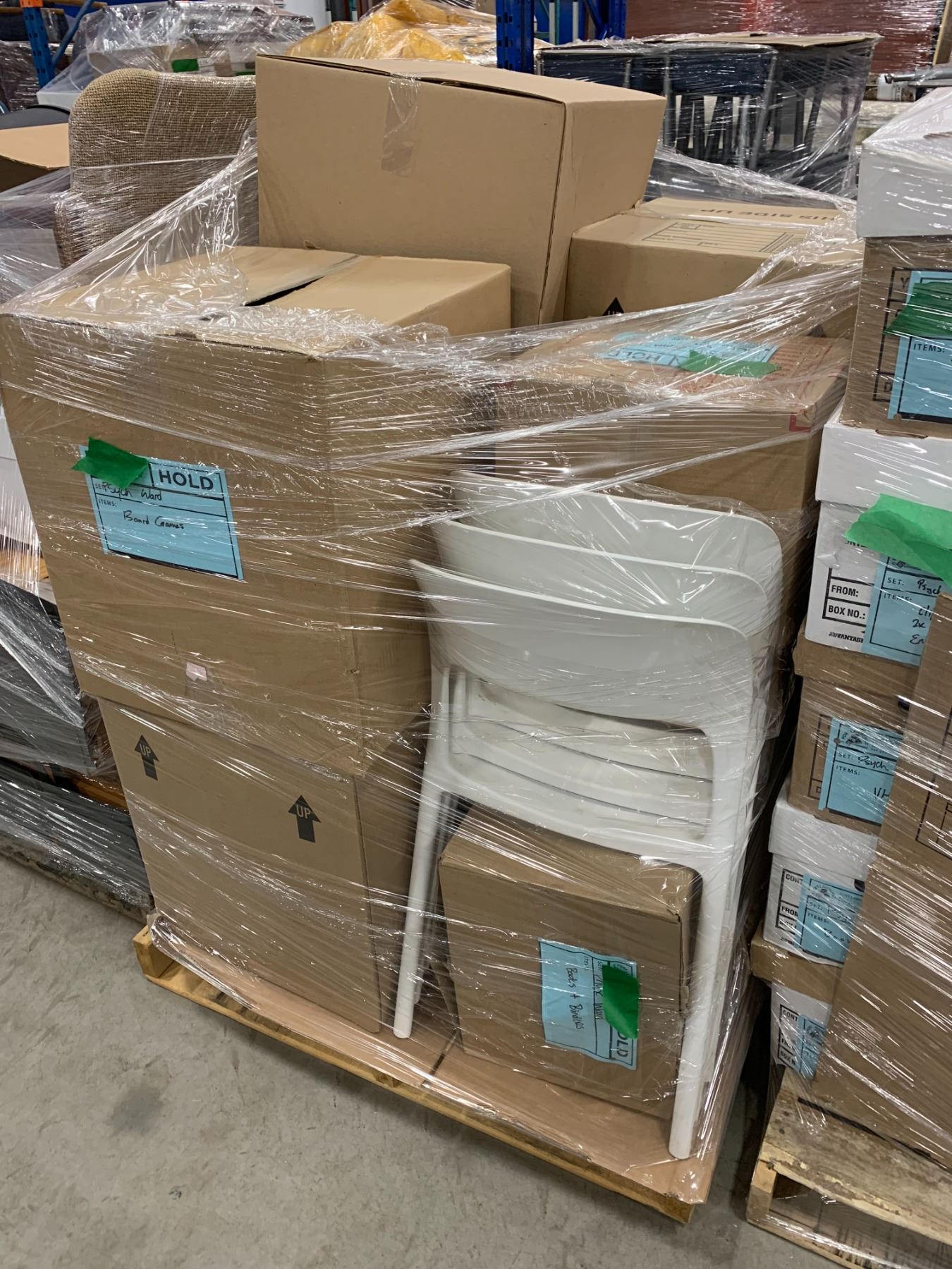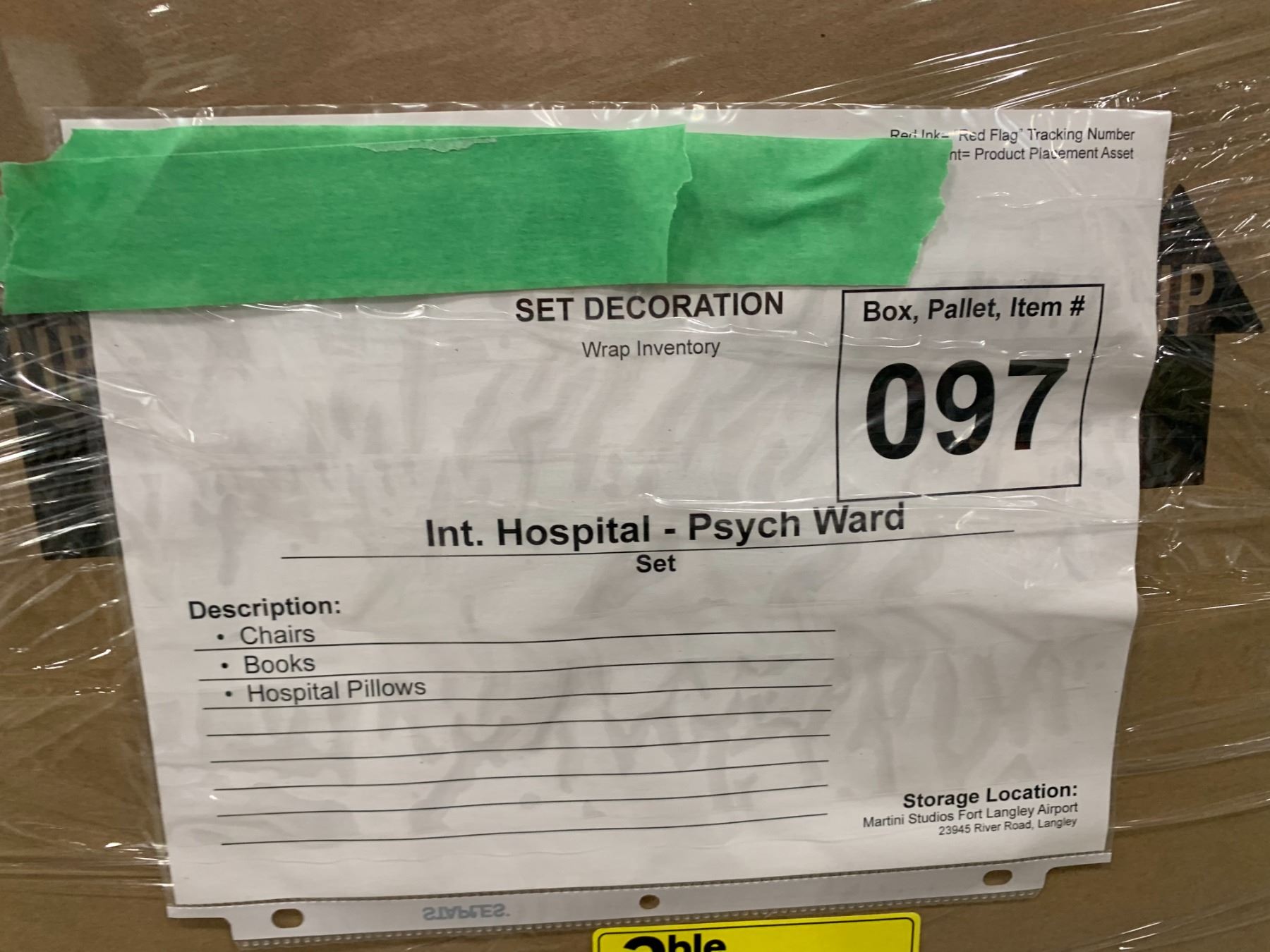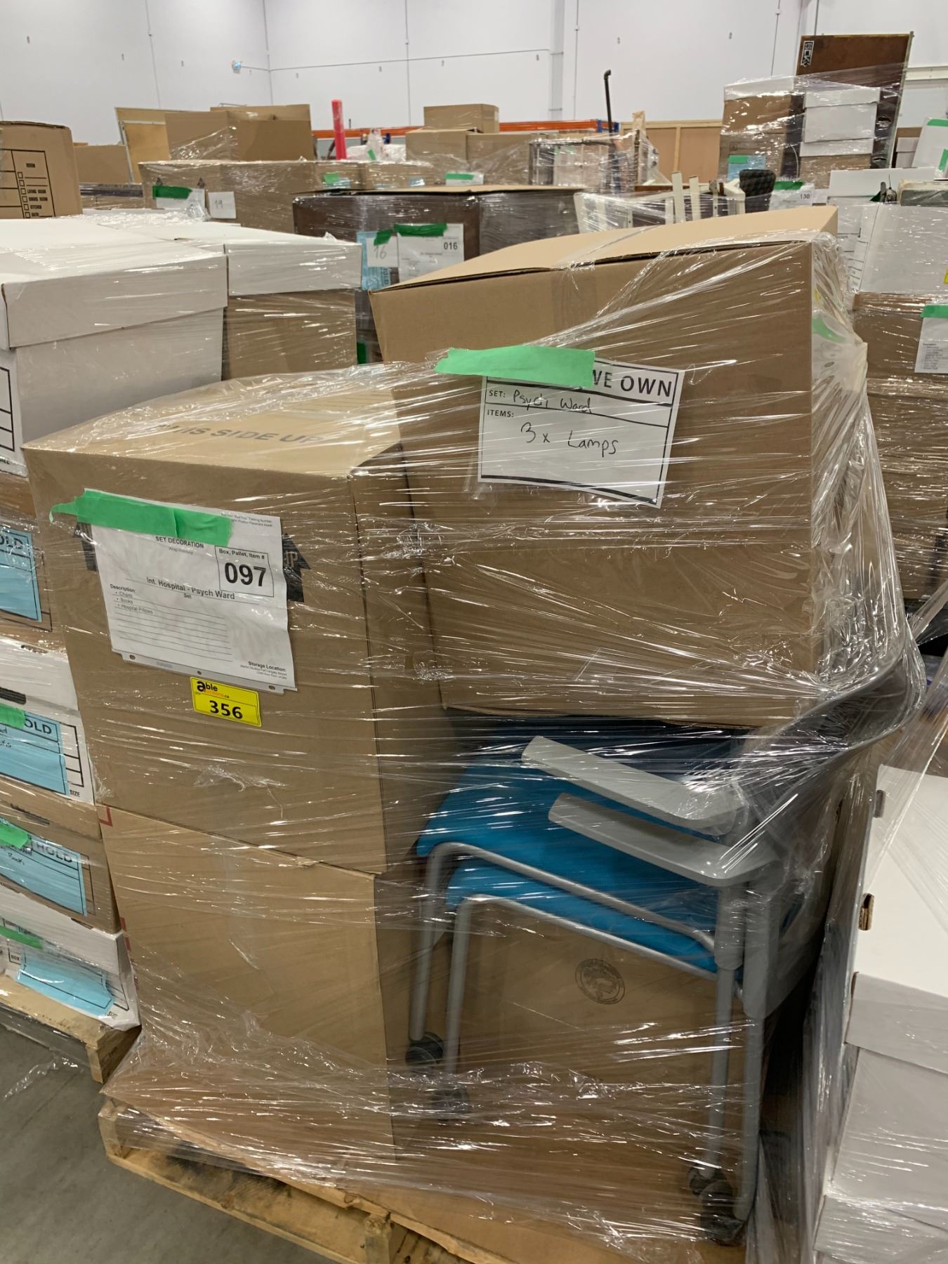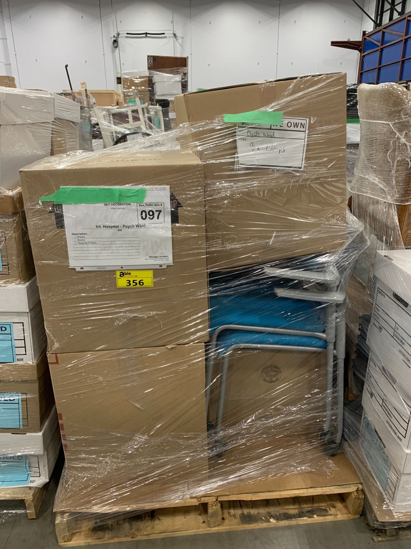 PALLET OF SET DEC ITEMS INCLUDING; CHAIRS, BOOKS AND HOSPITAL PILLOWS