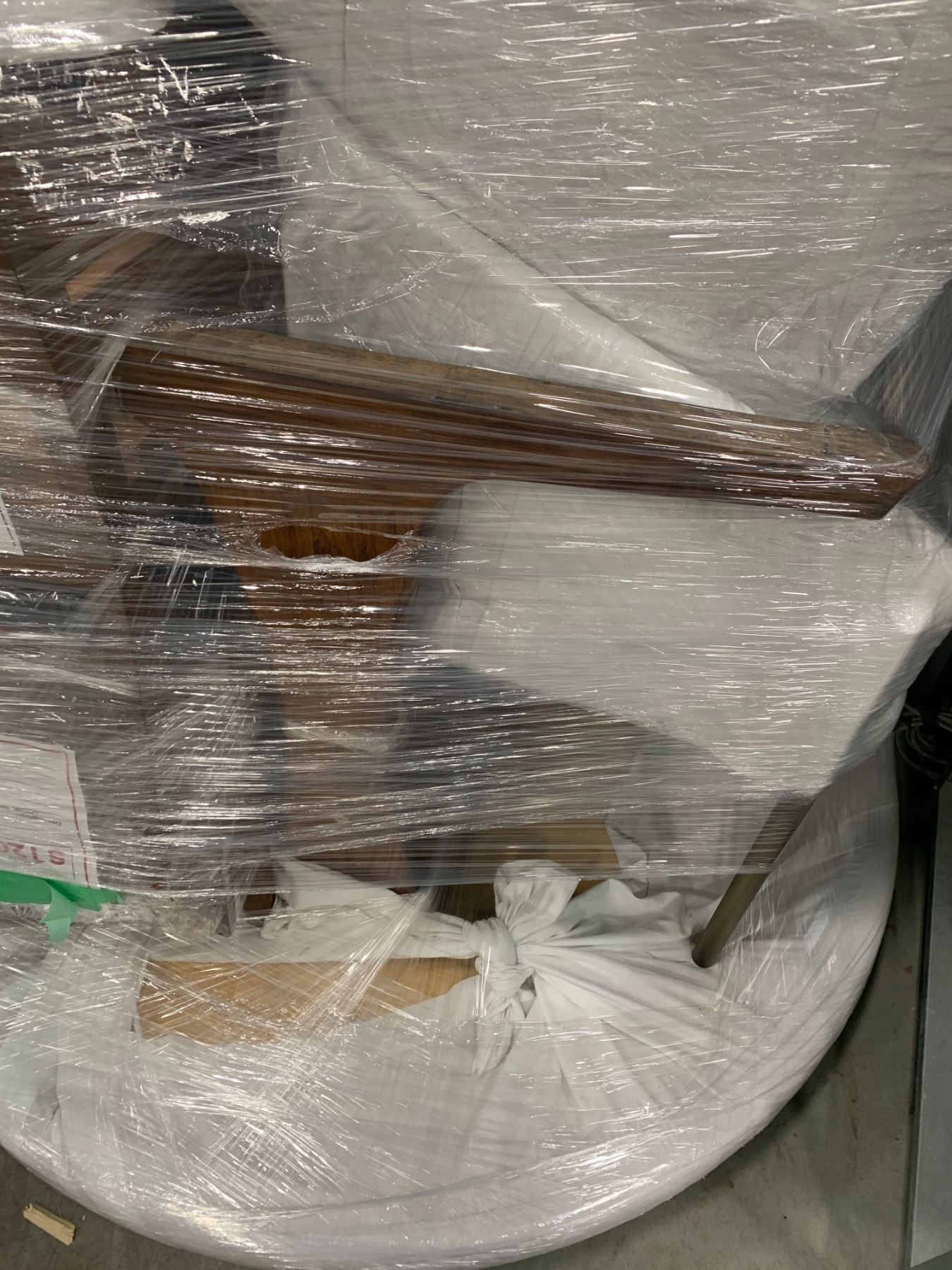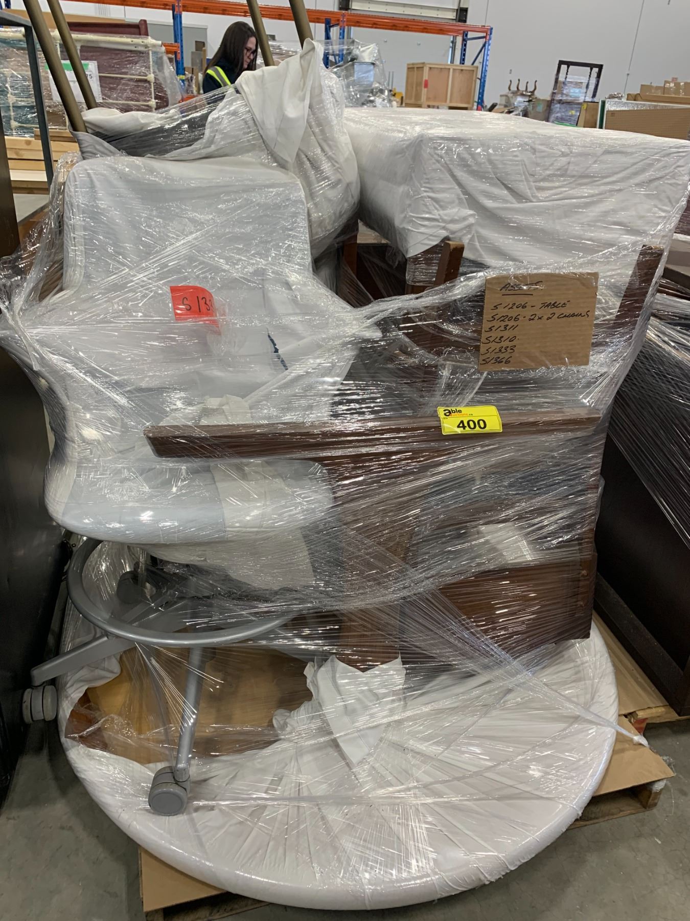 PALLET OF SET DEC ITEMS INCLUDING; CHAIRS, STOOLS AND COFFEE TABLE