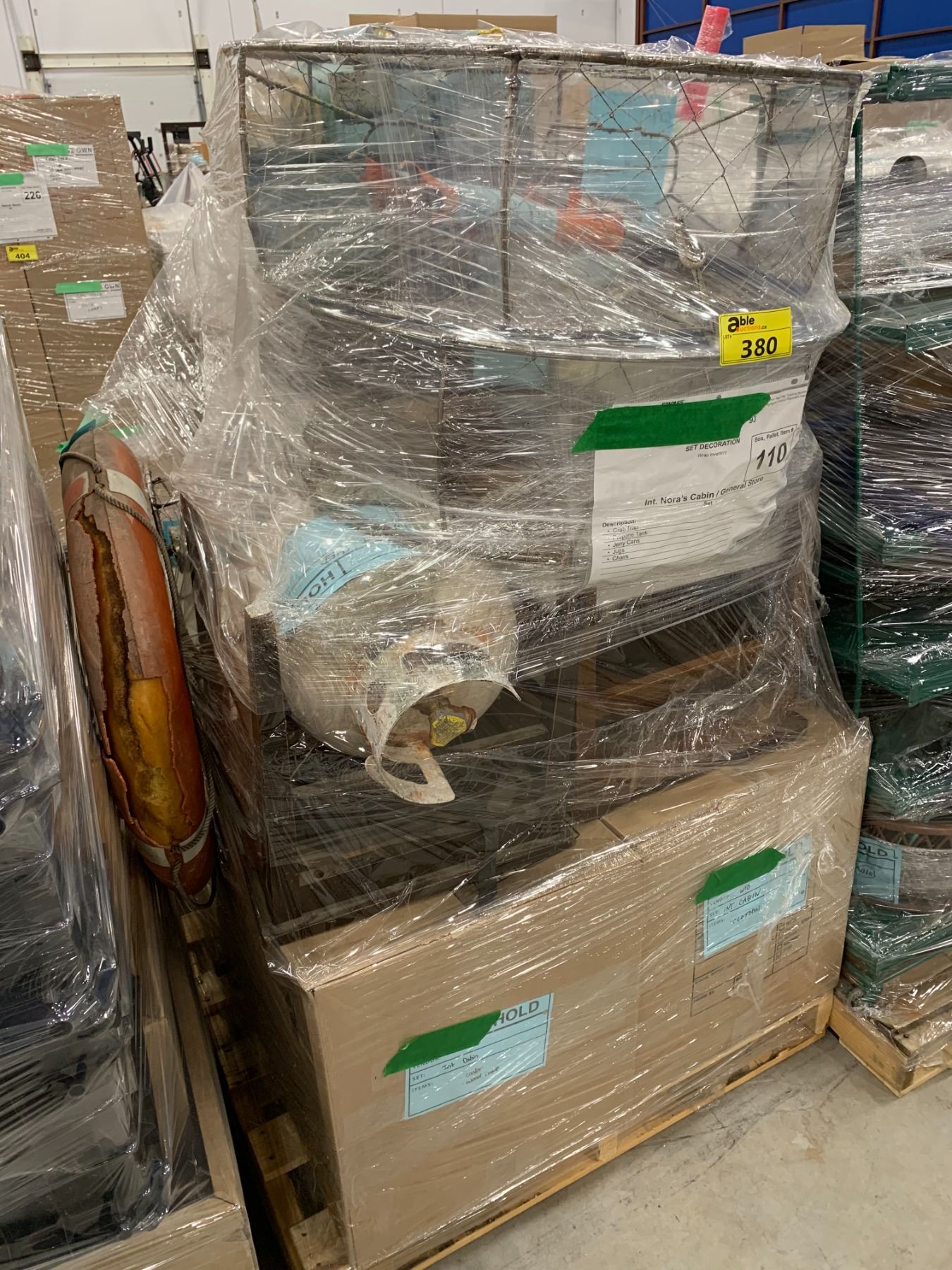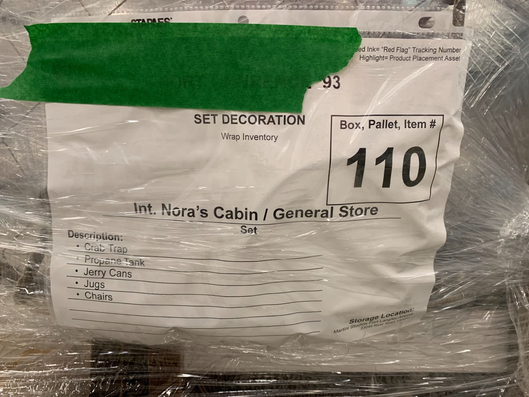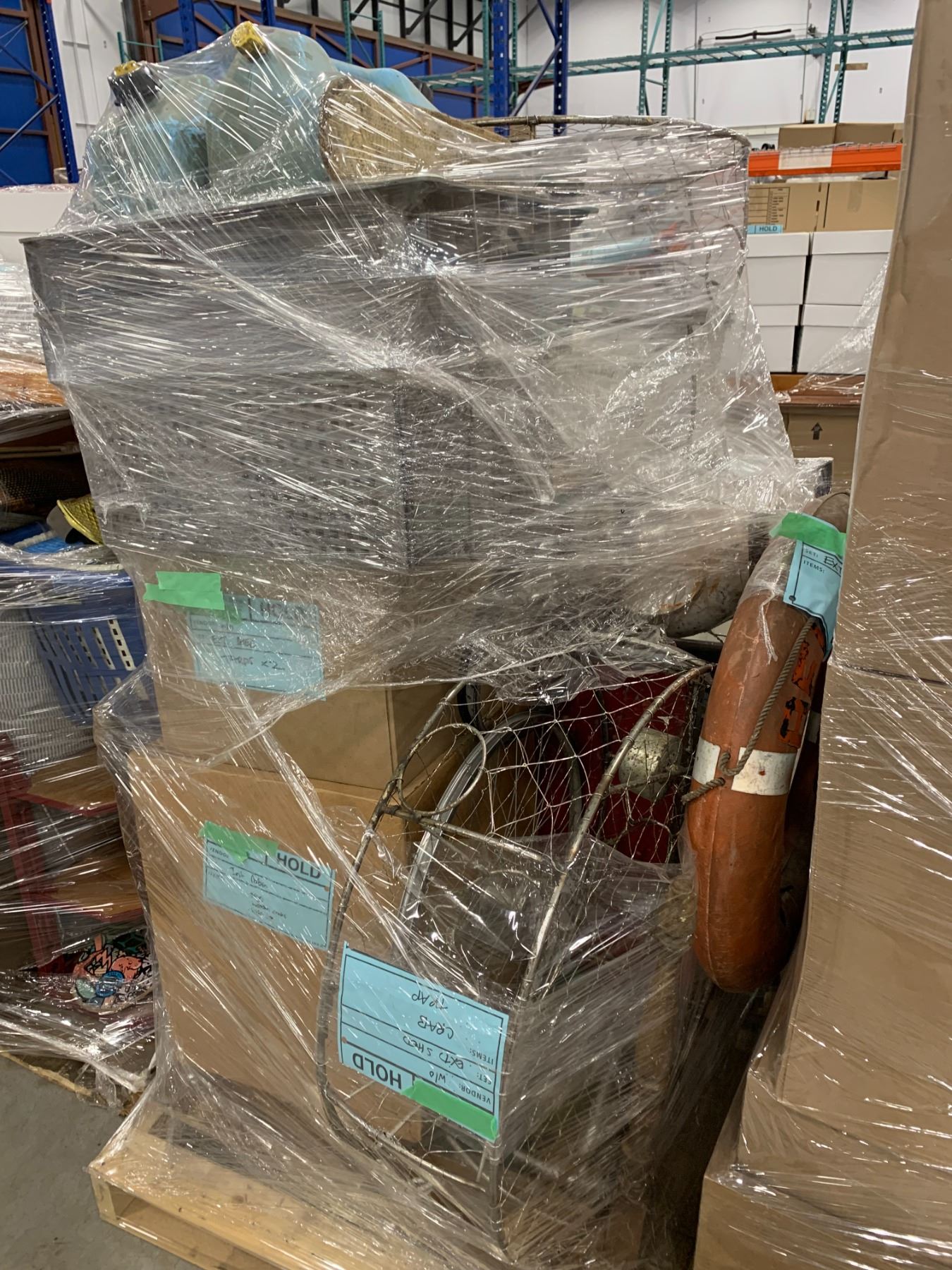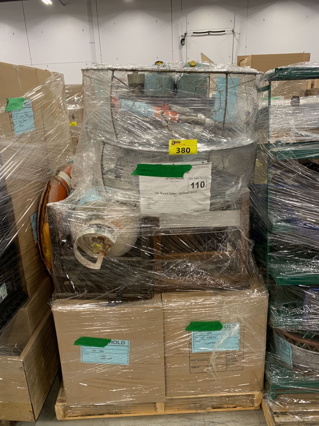 PALLET OF SET DEC ITEMS INCLUDING; CRAB TRAPS, PROPANE TANK, JERRY CANS AND MORE