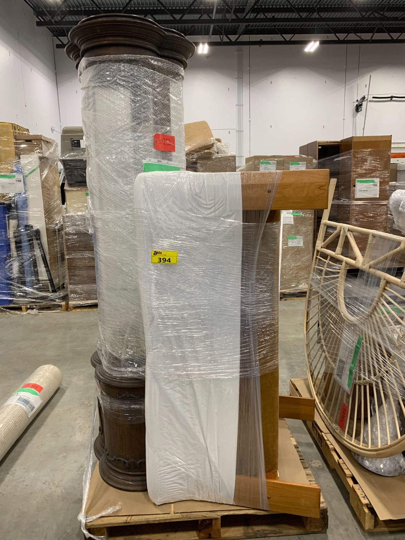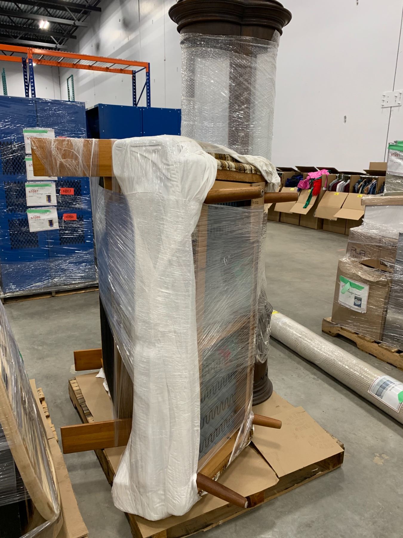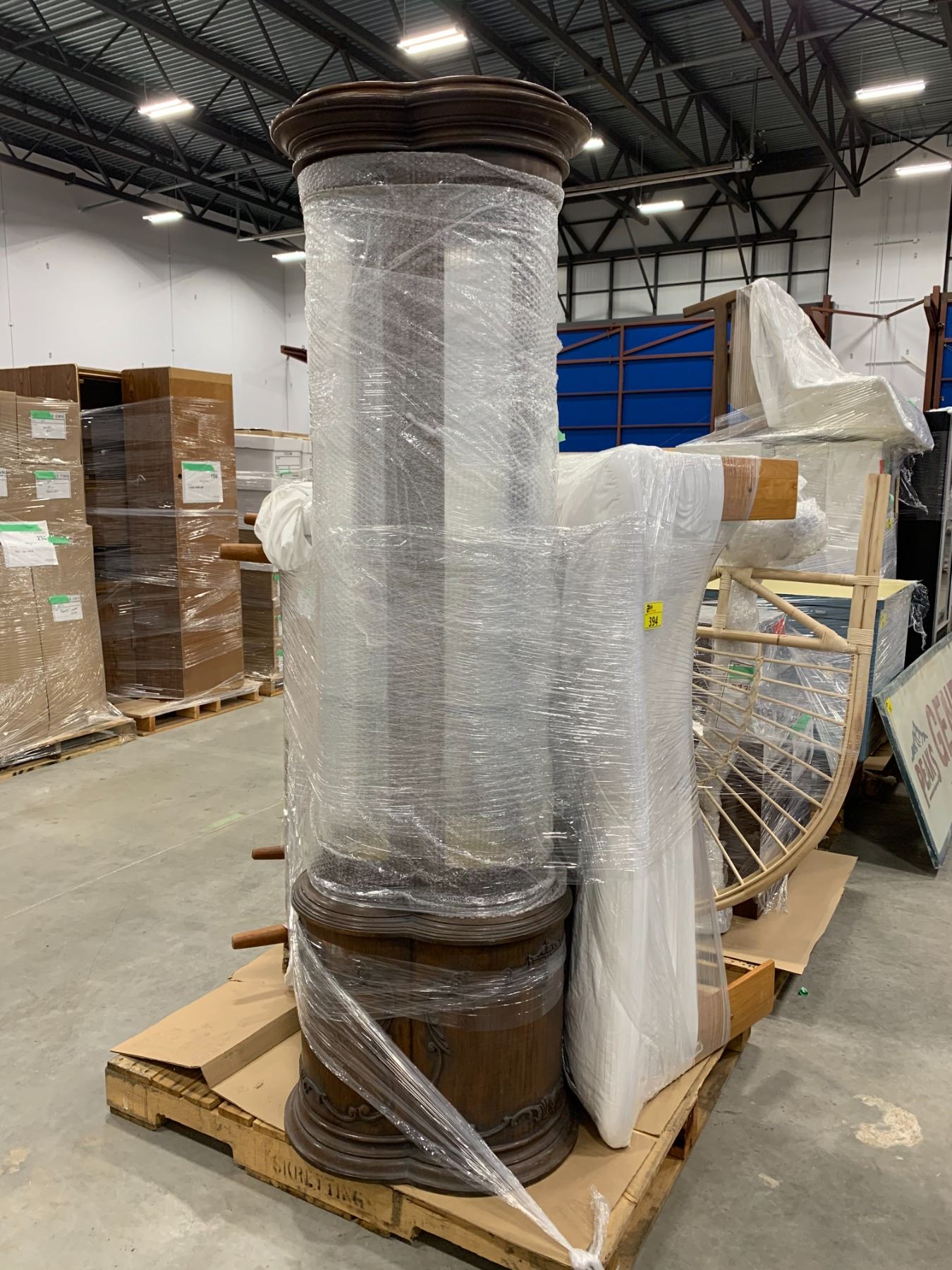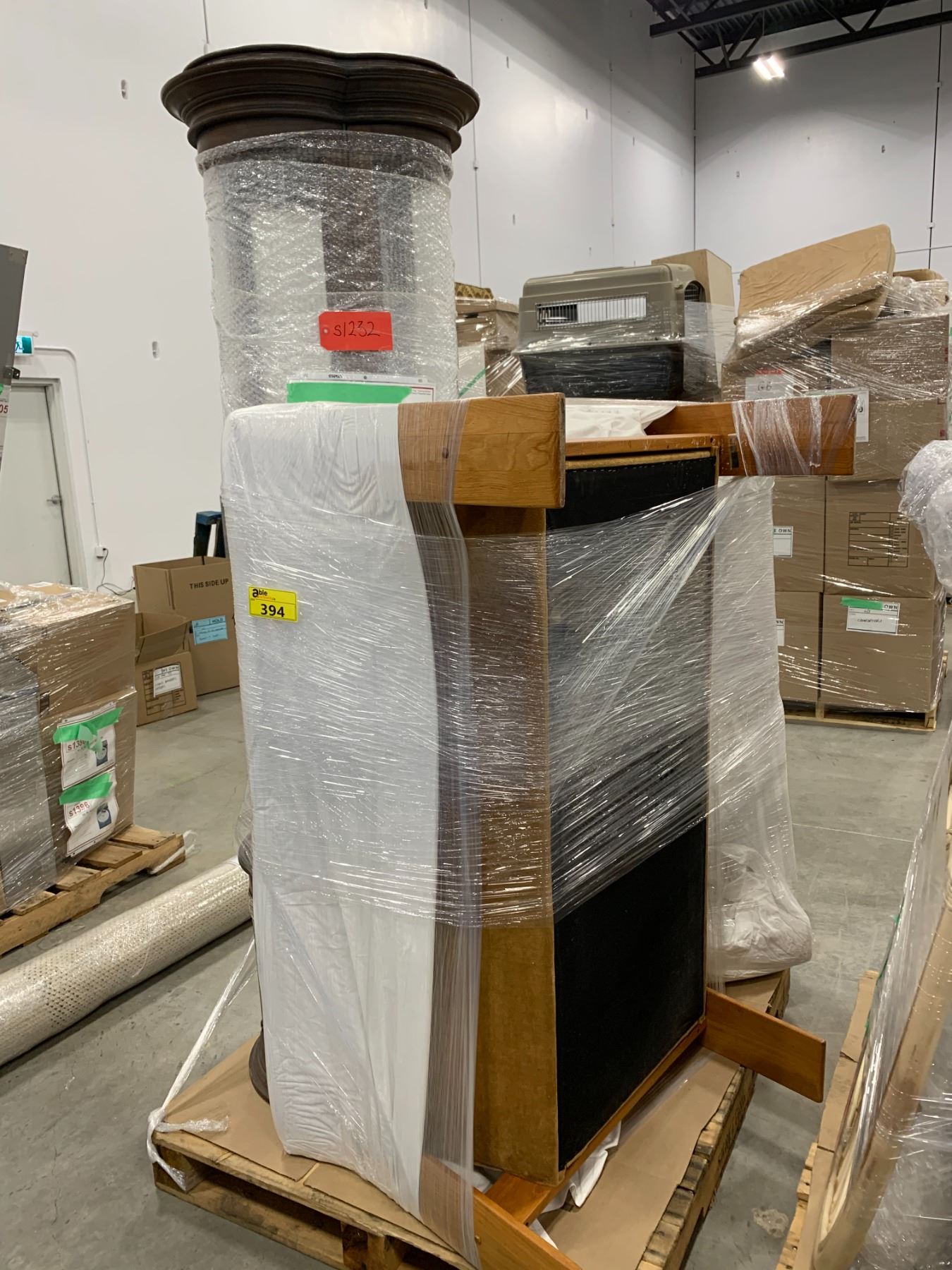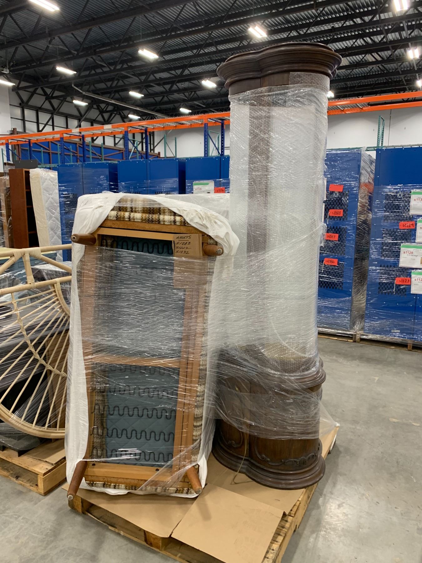 PALLET OF SET DEC ITEMS INCLUDING; CURVED CURIO DISPLAY UNIT, AND 2 SOFAS