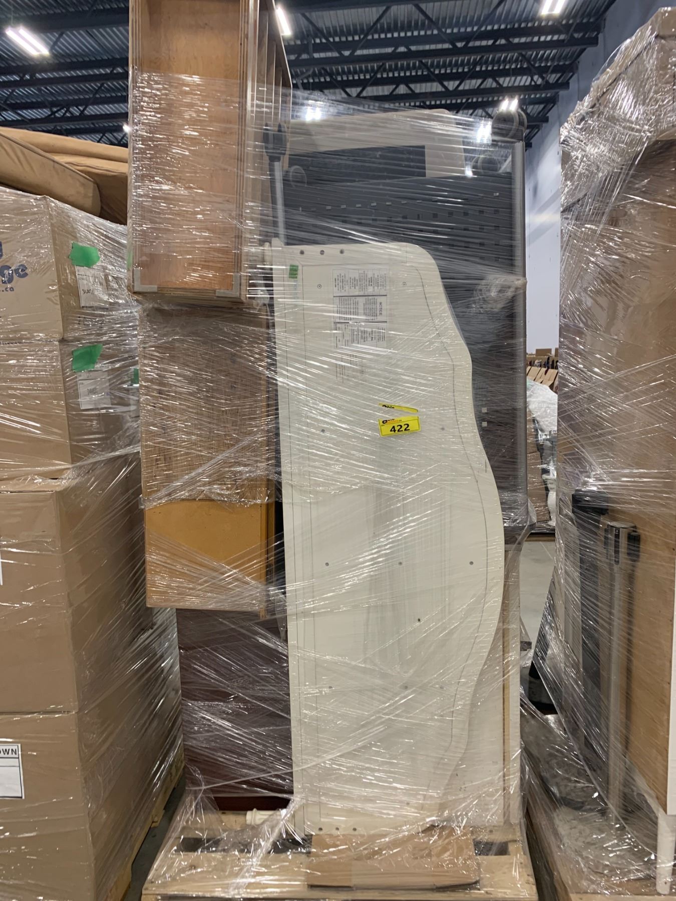 PALLET OF SET DEC ITEMS INCLUDING; DOG CRATE, FRIDGE, HEADBOARD, ROLLING CART AND MORE