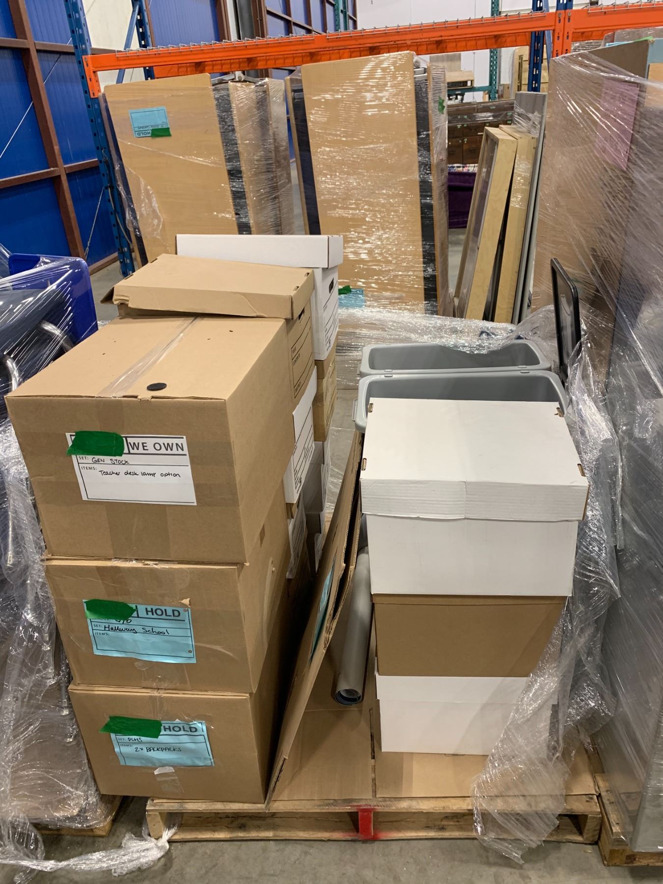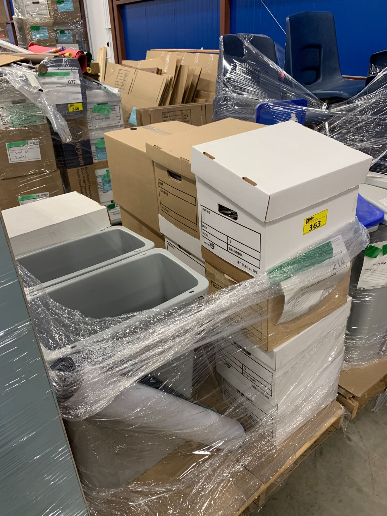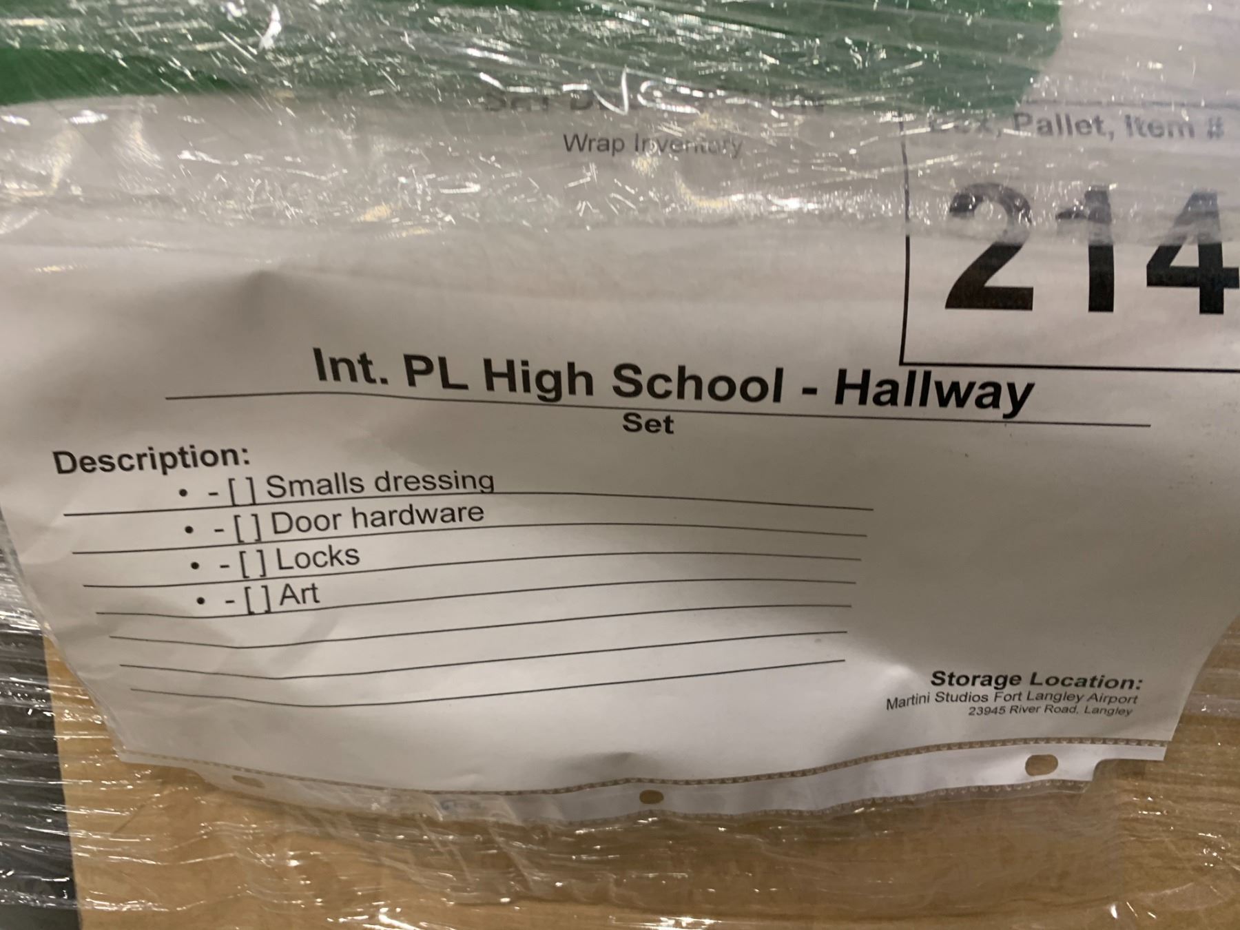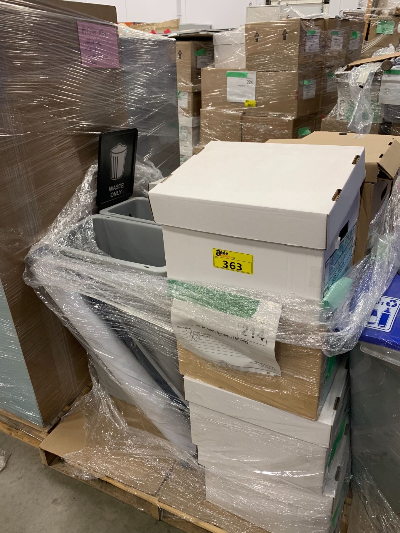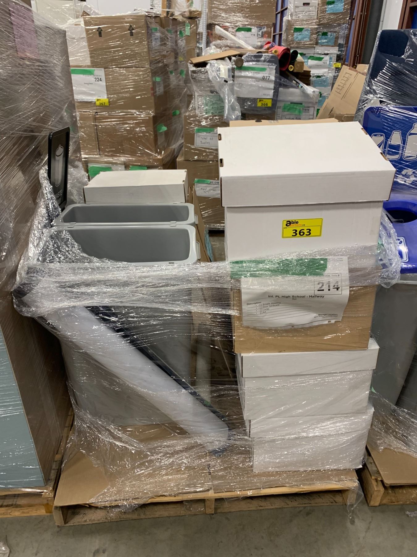 PALLET OF SET DEC ITEMS INCLUDING; DOOR HARDWARE, LOCKS, RECYCLING BINS AND MORE
