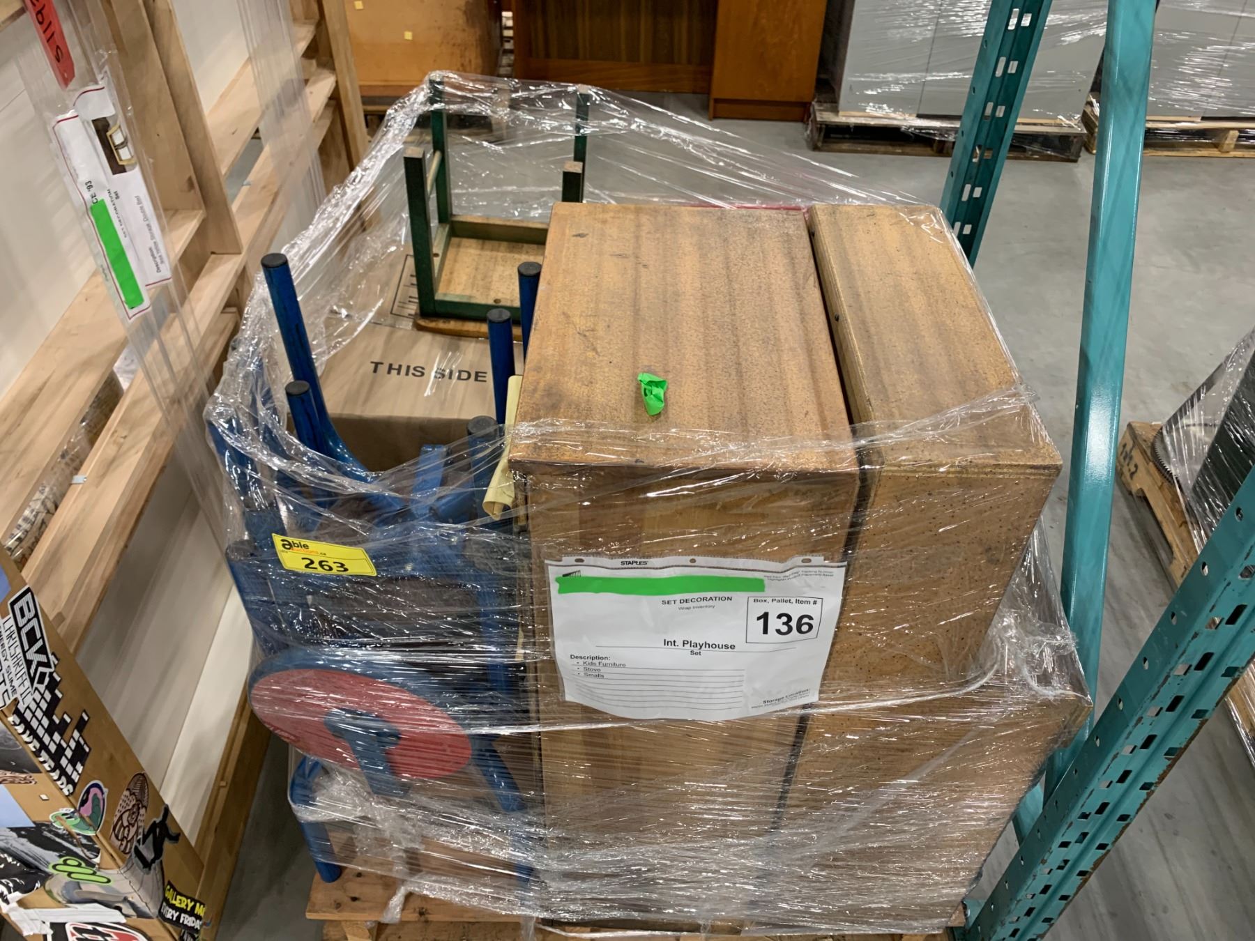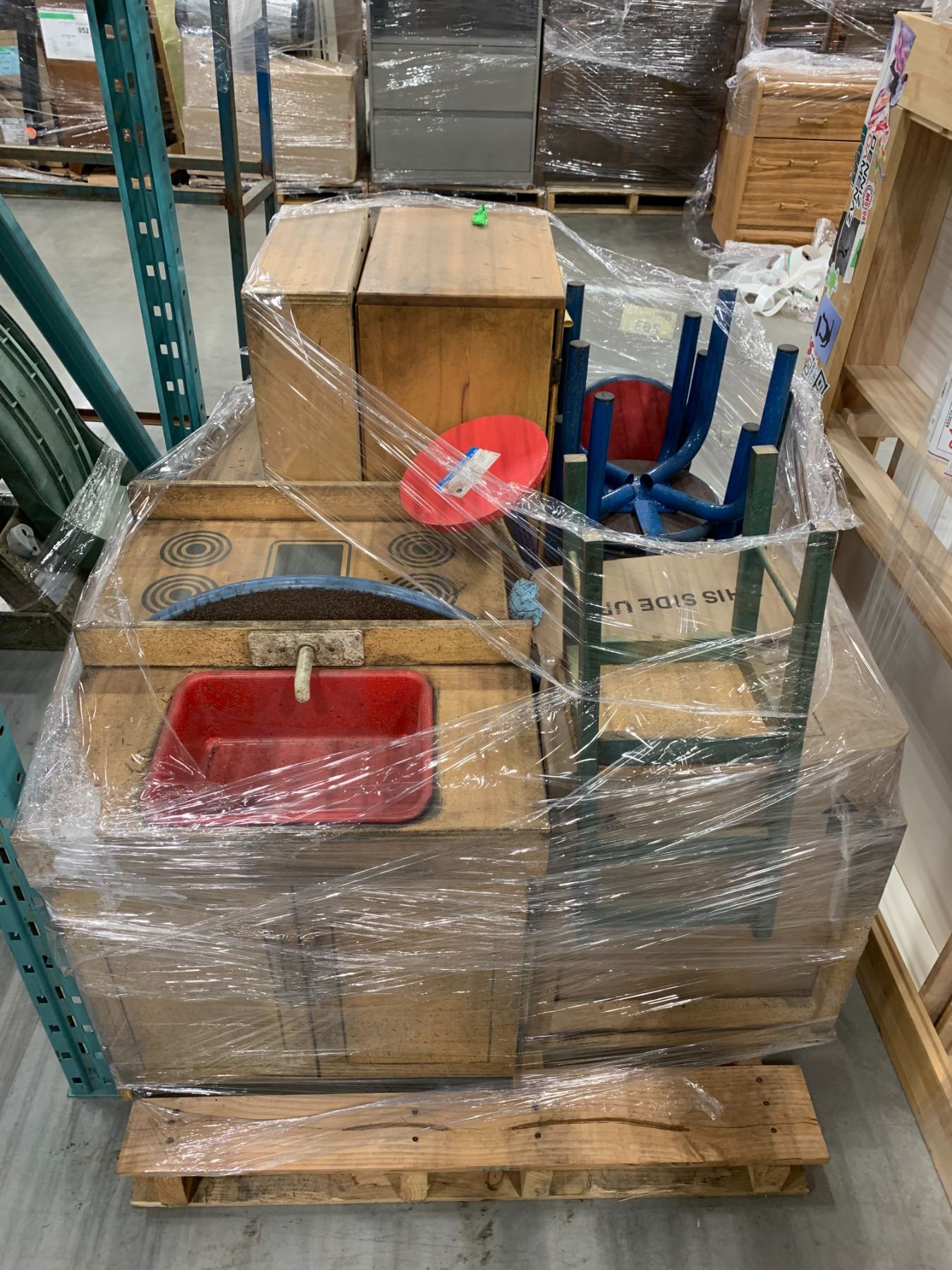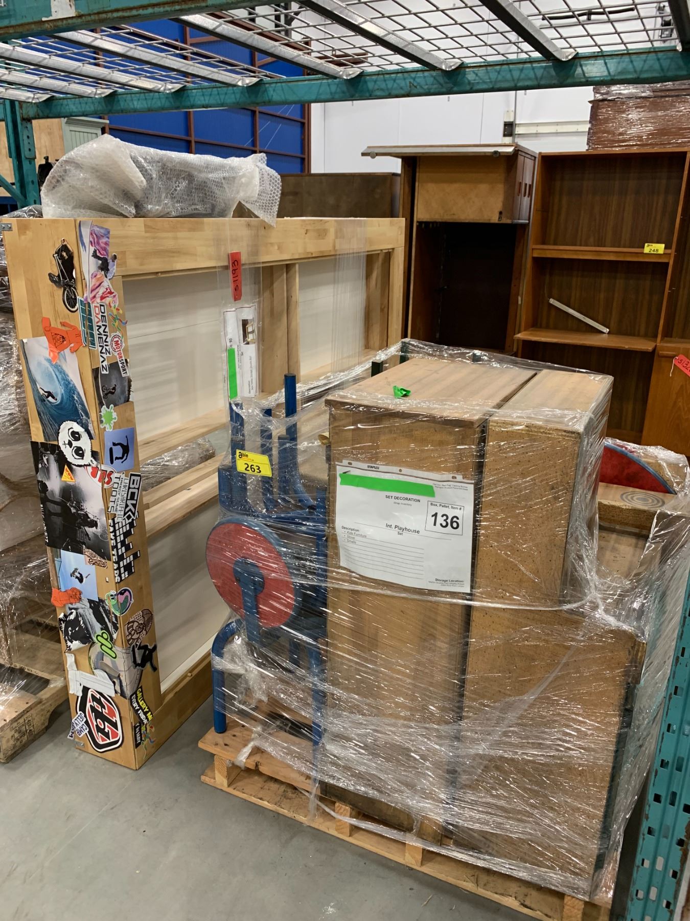 PALLET OF SET DEC ITEMS INCLUDING; DOUBLE SIZE BED FRAME, KIDS FURNITURE AND MORE
