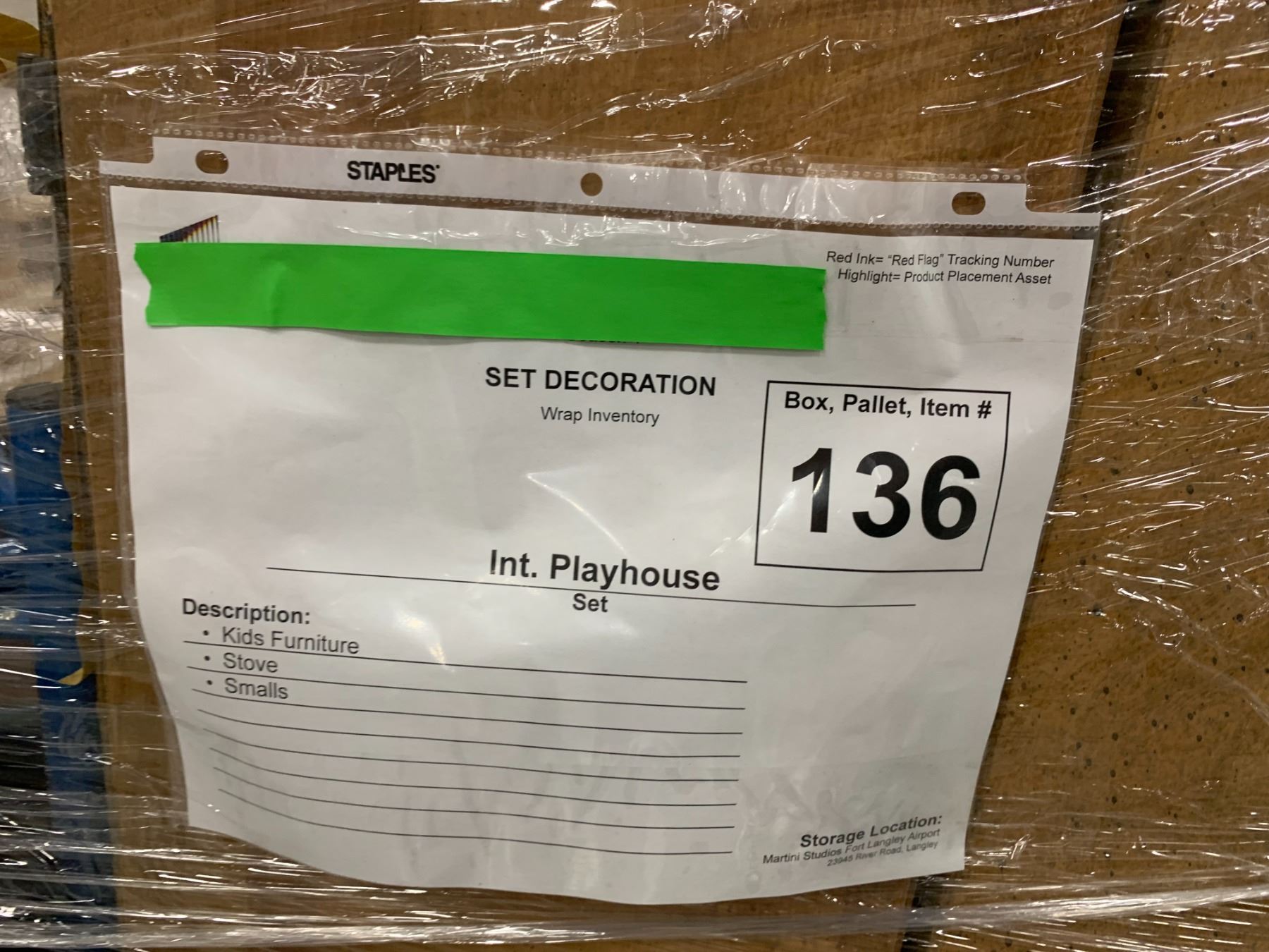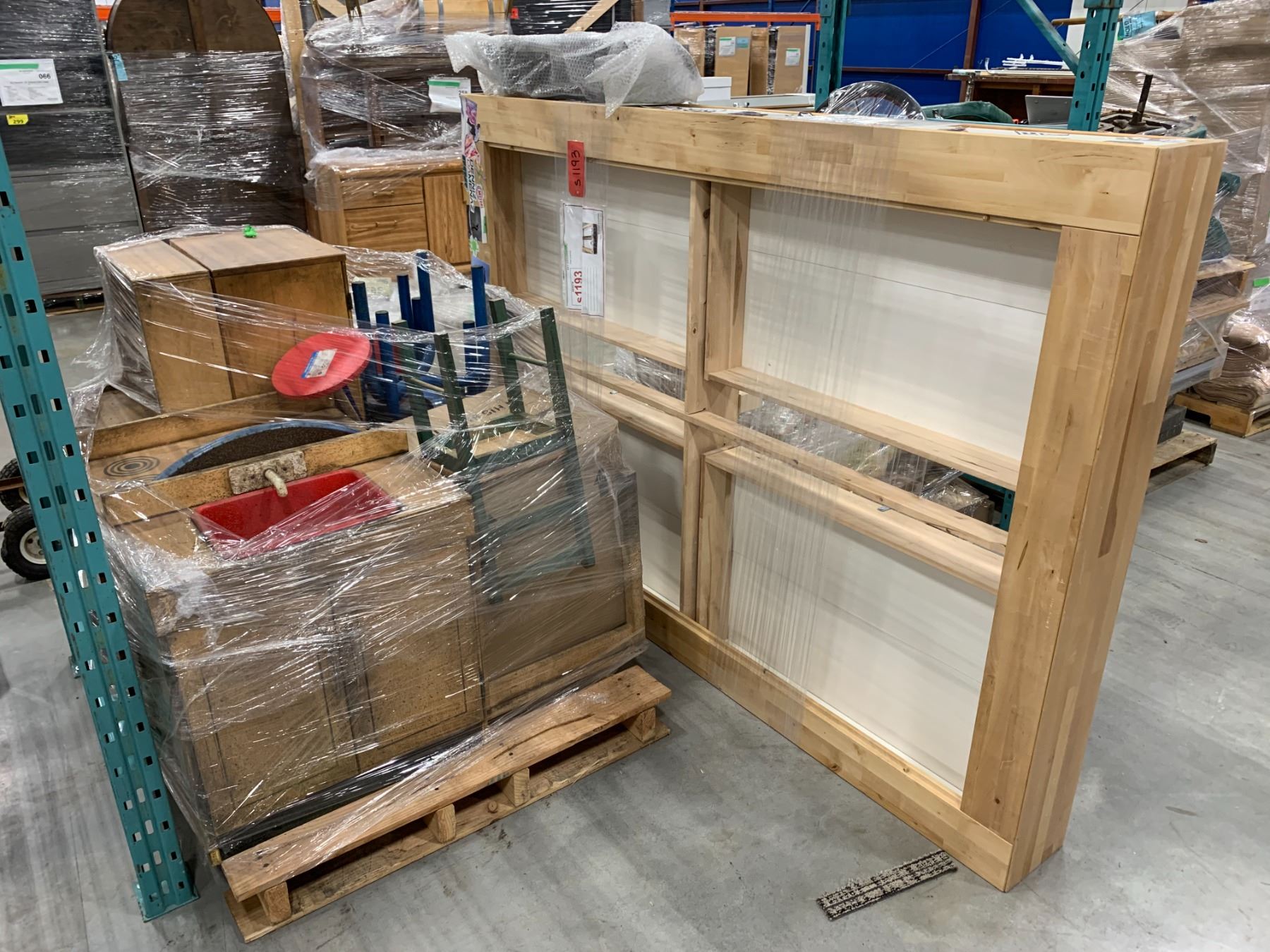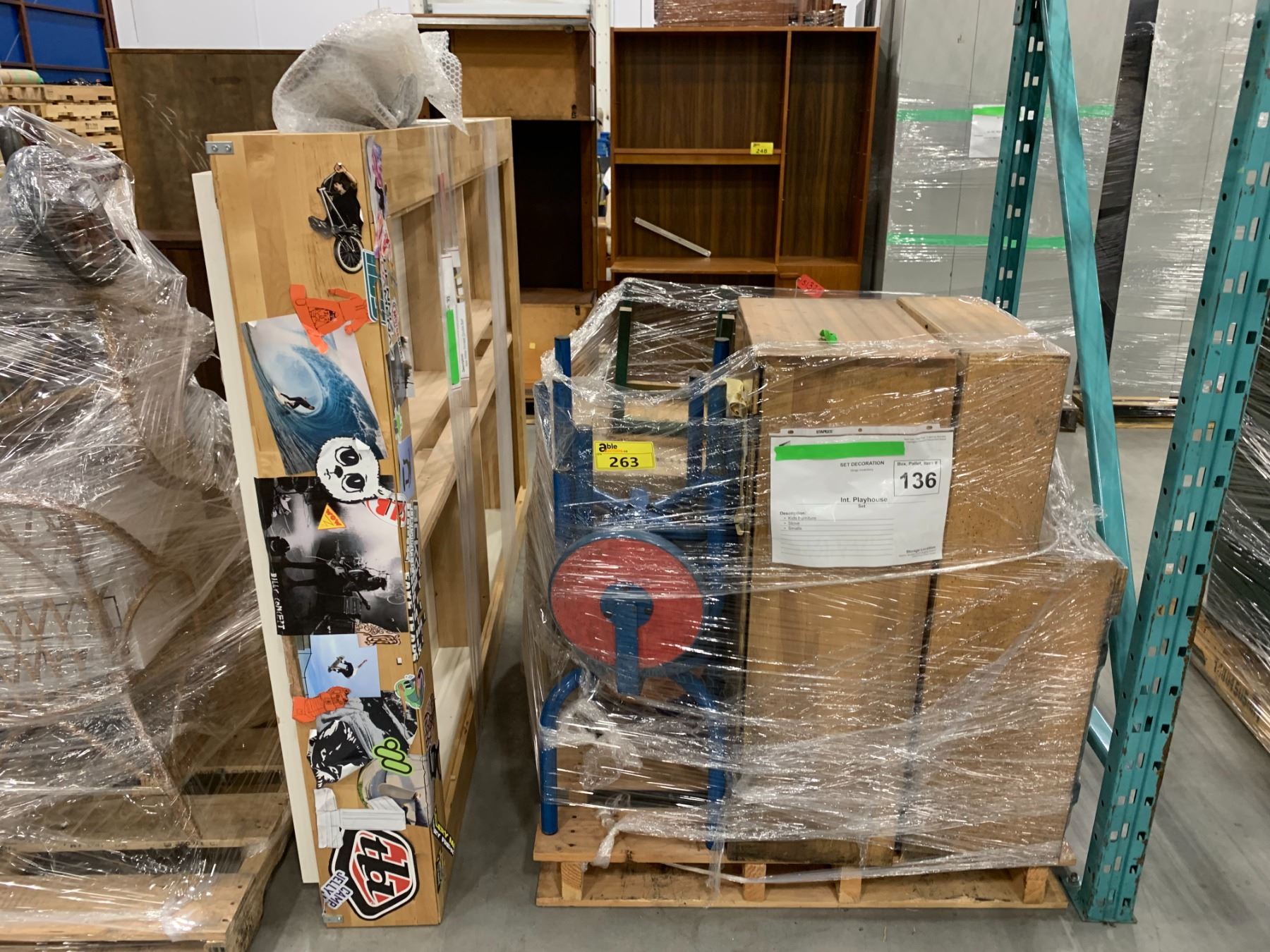 PALLET OF SET DEC ITEMS INCLUDING; DOUBLE SIZE BED FRAME, KIDS FURNITURE AND MORE