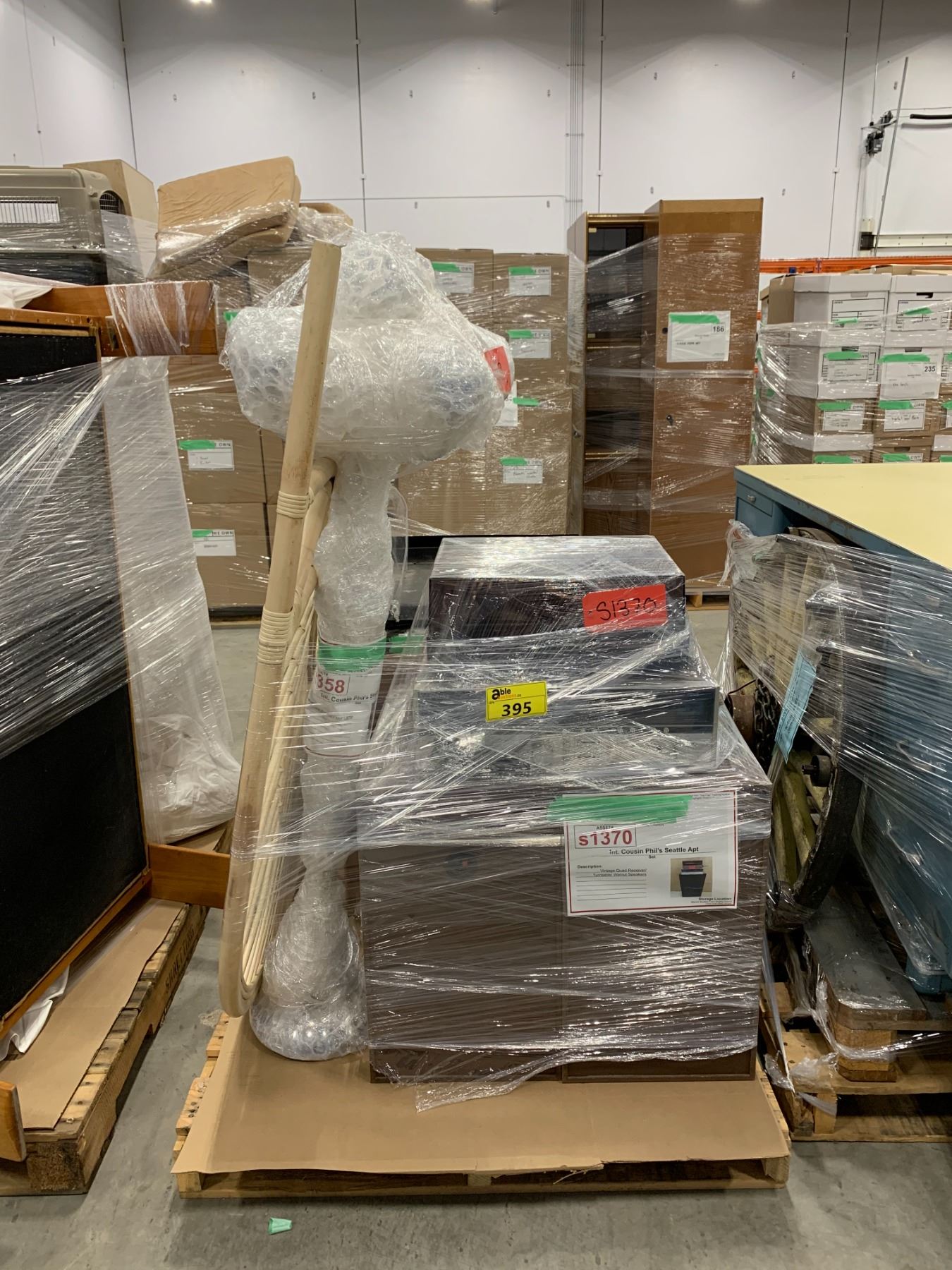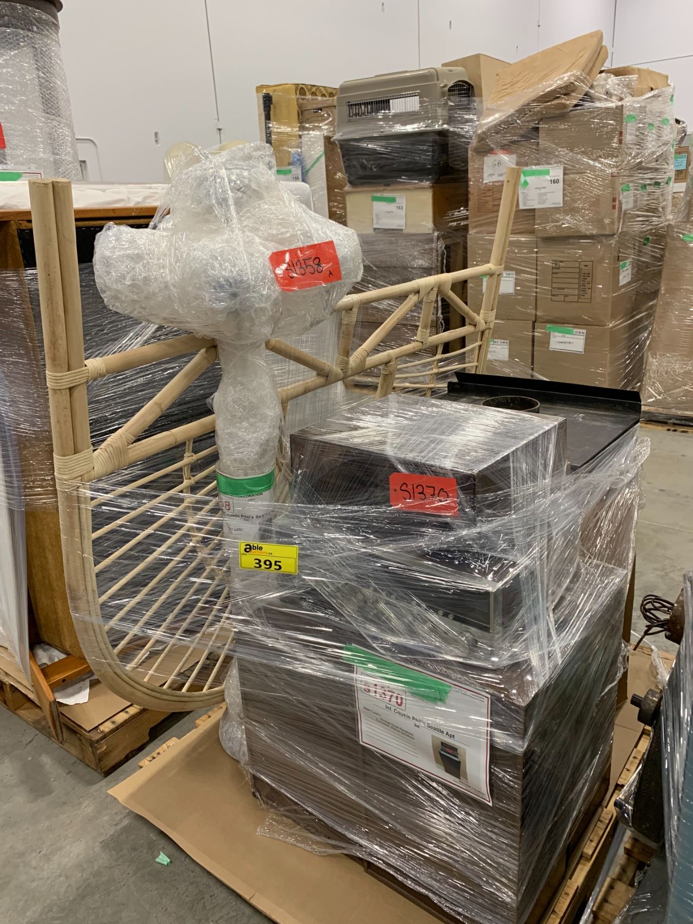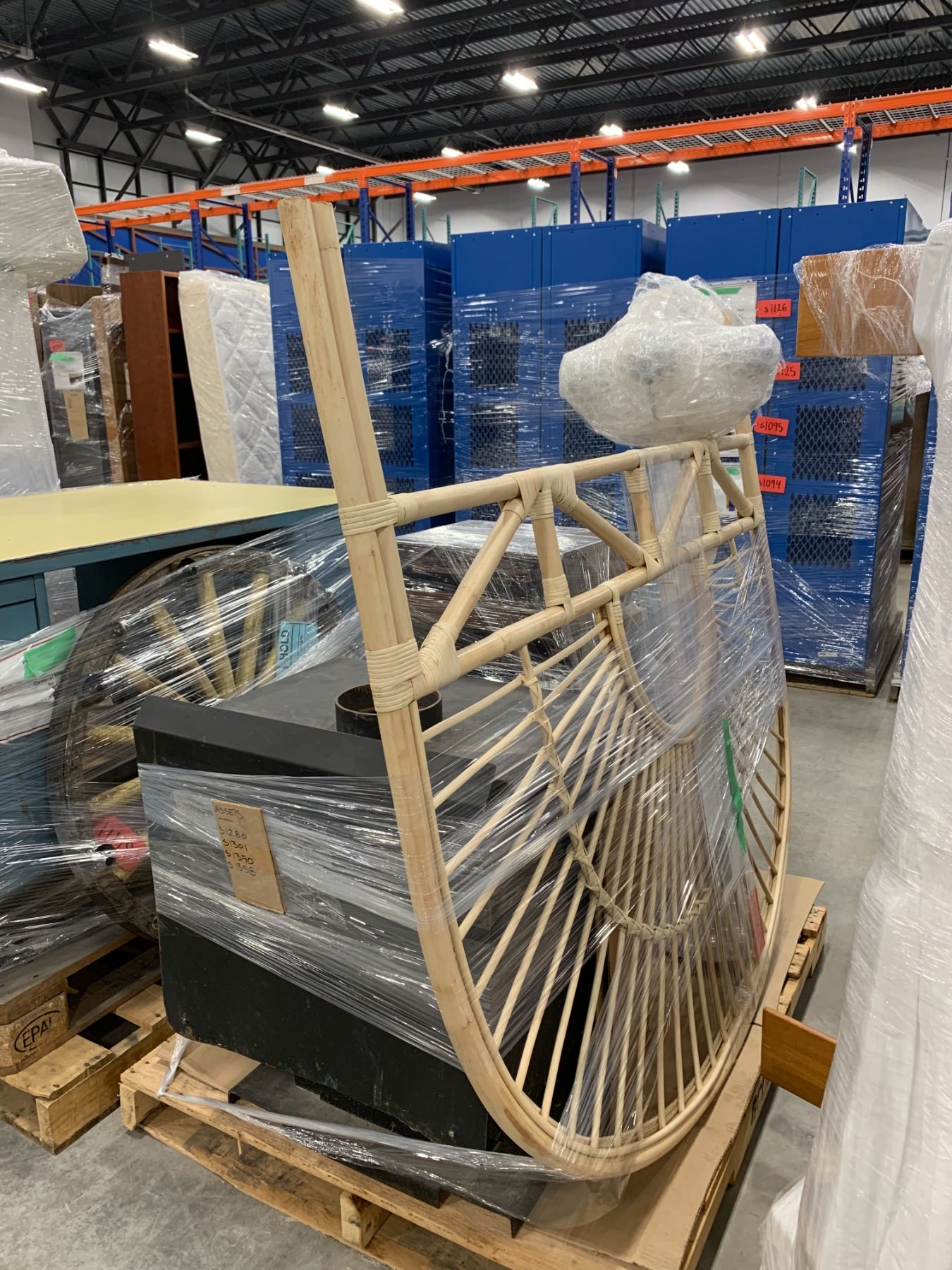 PALLET OF SET DEC ITEMS INCLUDING; QUEEN RATTAN HEADBOARD, FILE CABINETS, RECORD PLAYER, WOODSTOV...