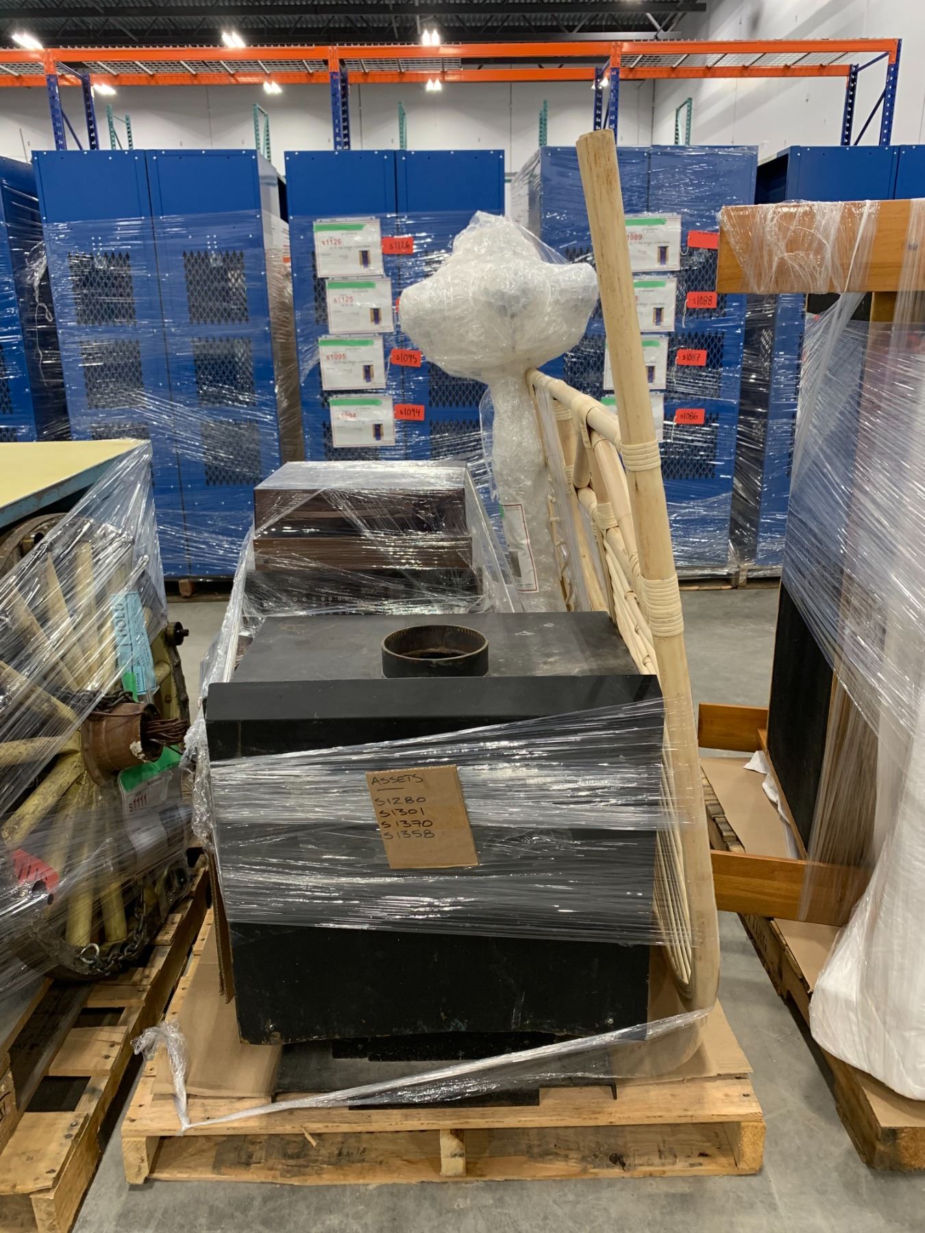 PALLET OF SET DEC ITEMS INCLUDING; QUEEN RATTAN HEADBOARD, FILE CABINETS, RECORD PLAYER, WOODSTOVE AND MORE