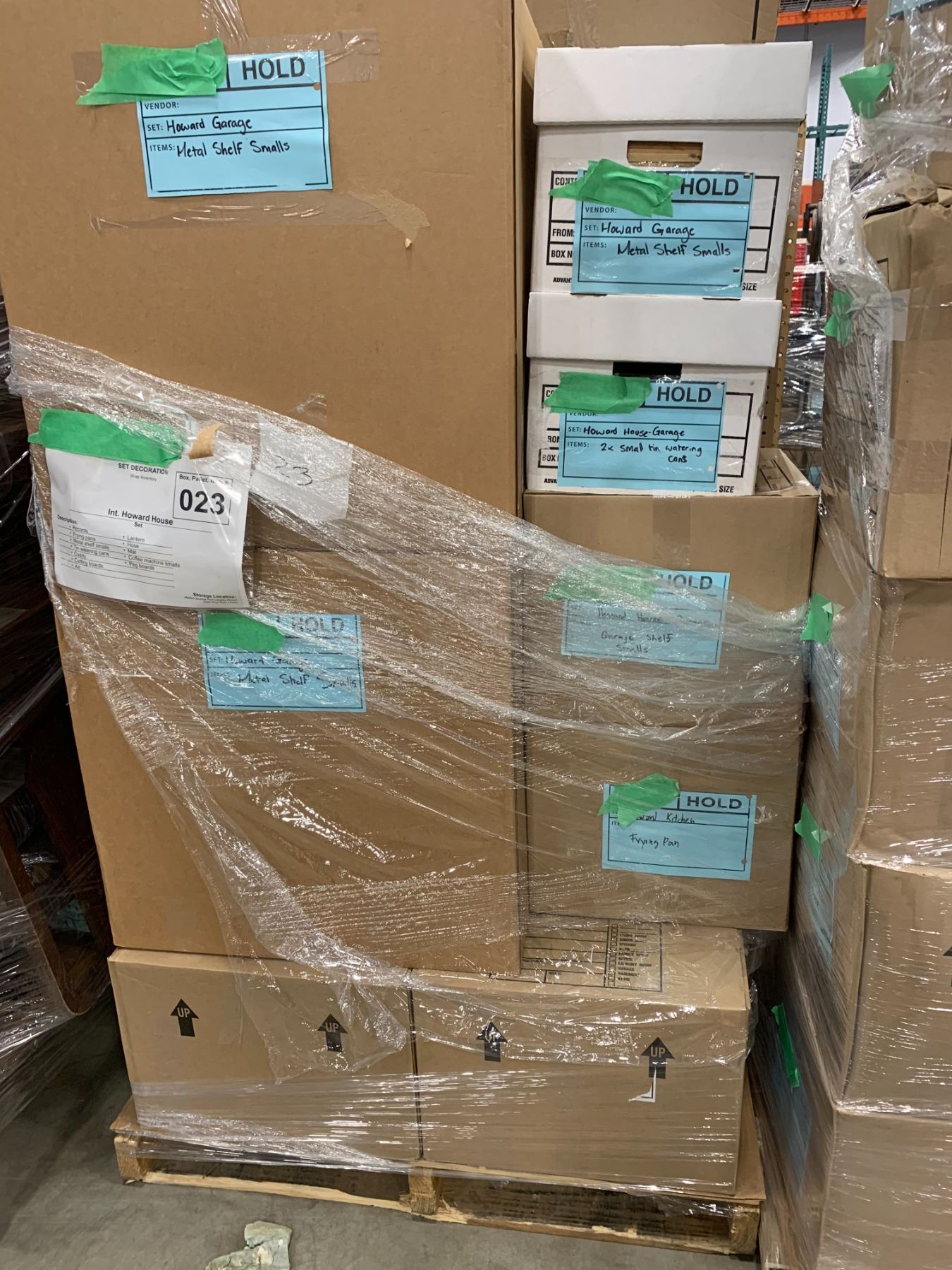 PALLET OF SET DEC ITEMS INCLUDING; SHELVING UNIT, TV, COFFEE MACHINE, LANTERN AND MORE
