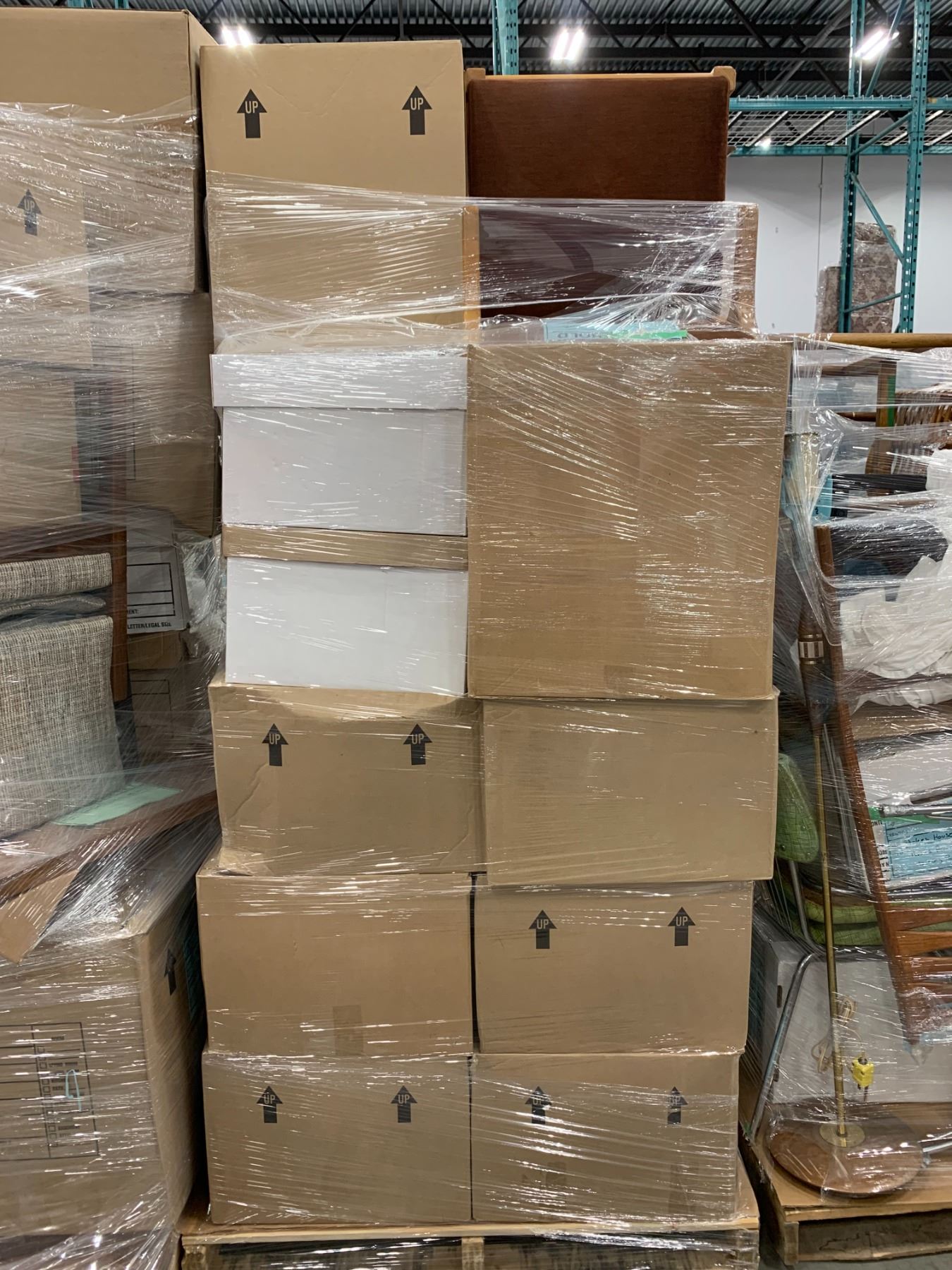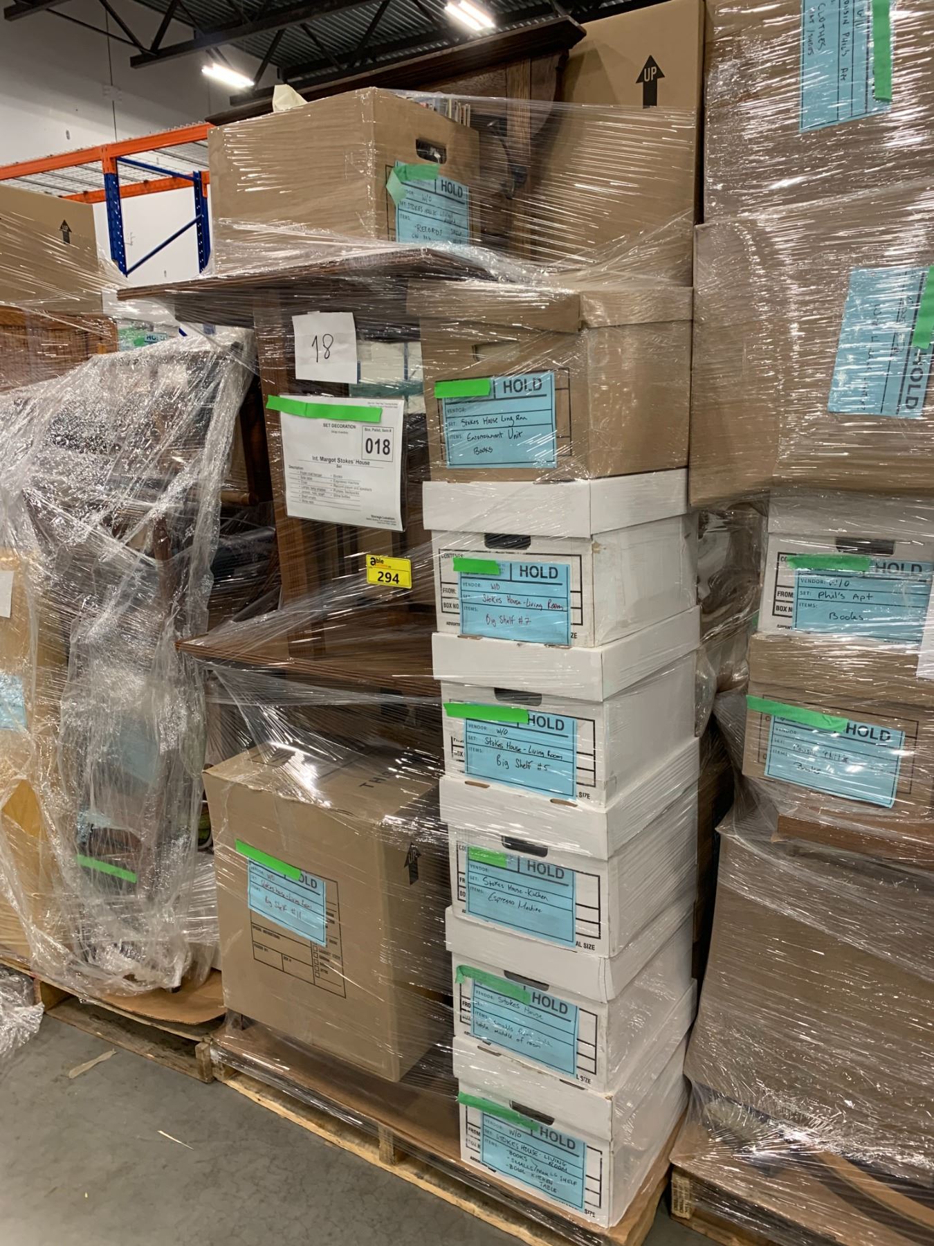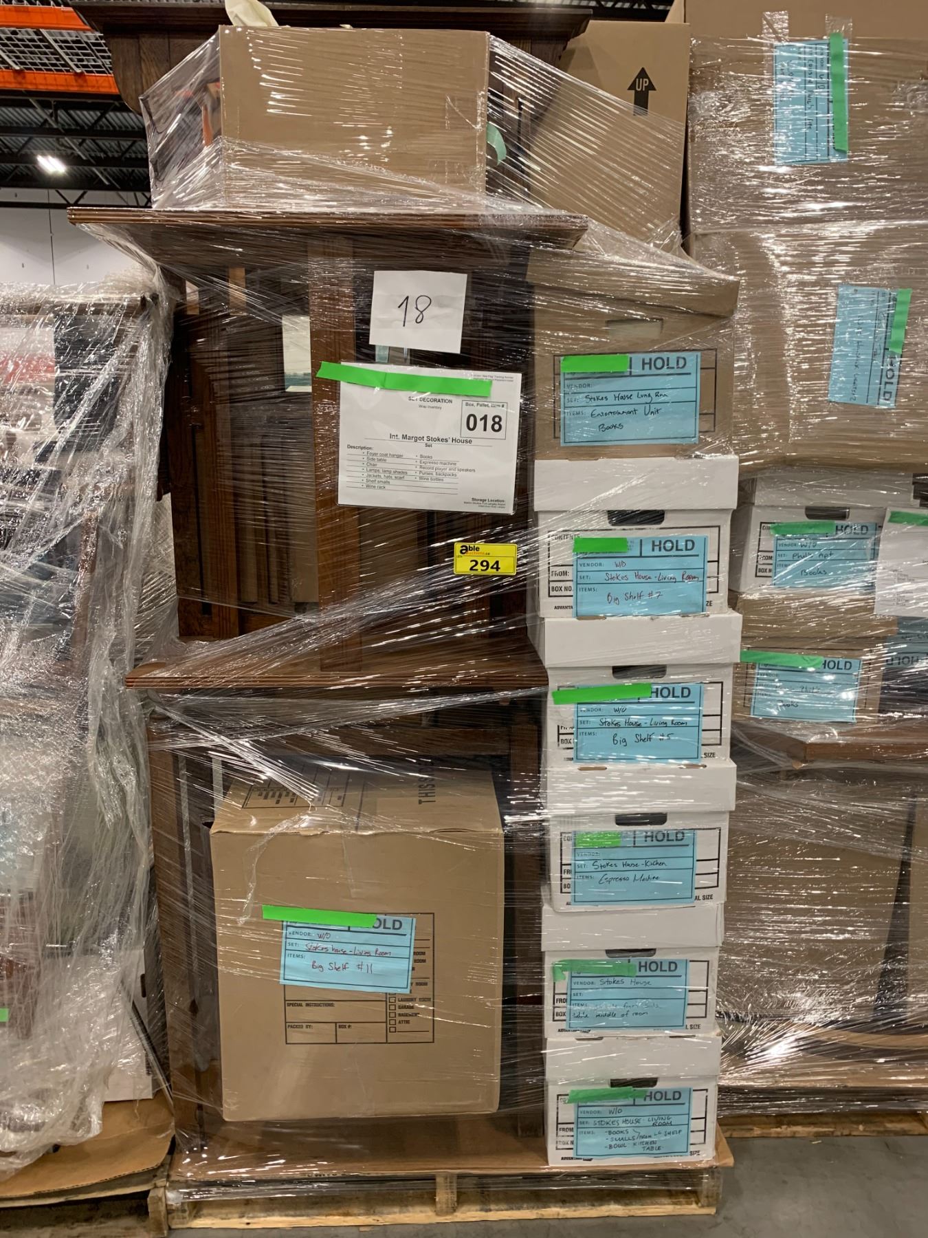 PALLET OF SET DEC ITEMS INCLUDING; SIDE TABLE, LAMPS, JACKETS, WINE BOTTLES AND MORE
