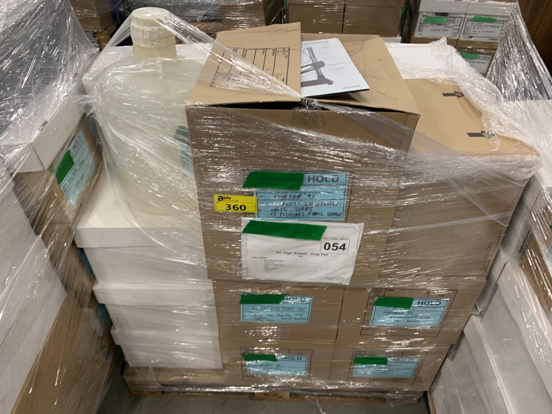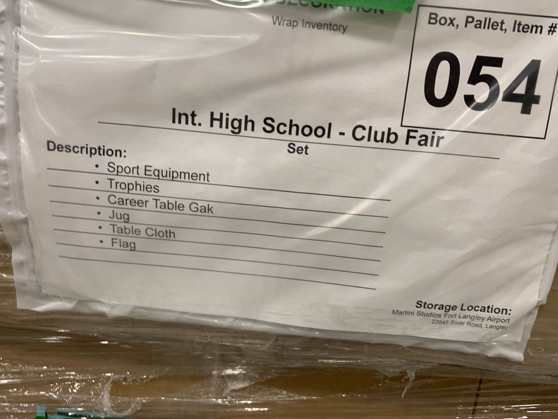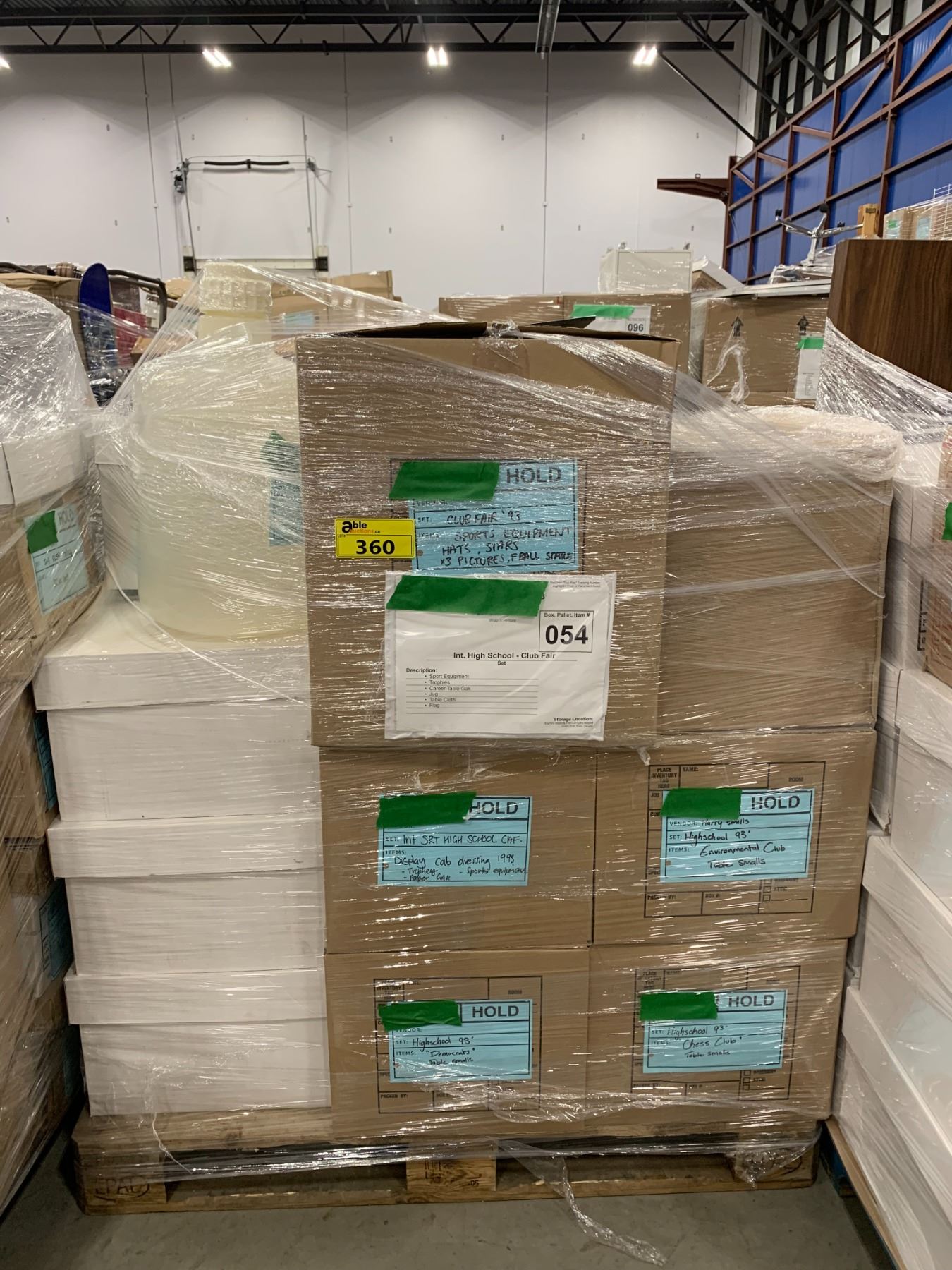 PALLET OF SET DEC ITEMS INCLUDING; SPORTS EQUIPMENT, TROPHIES, JUG, FLAG AND MORE