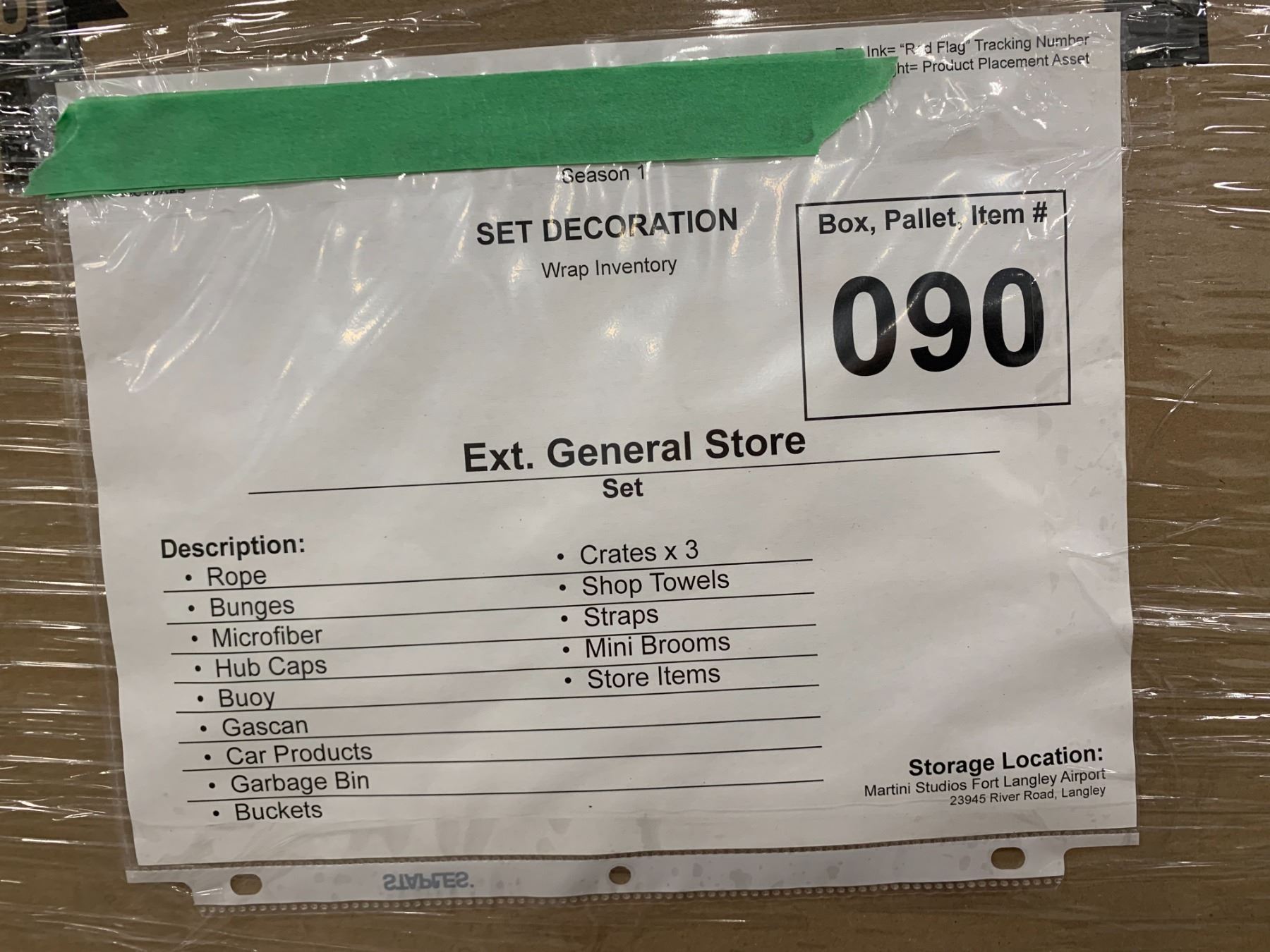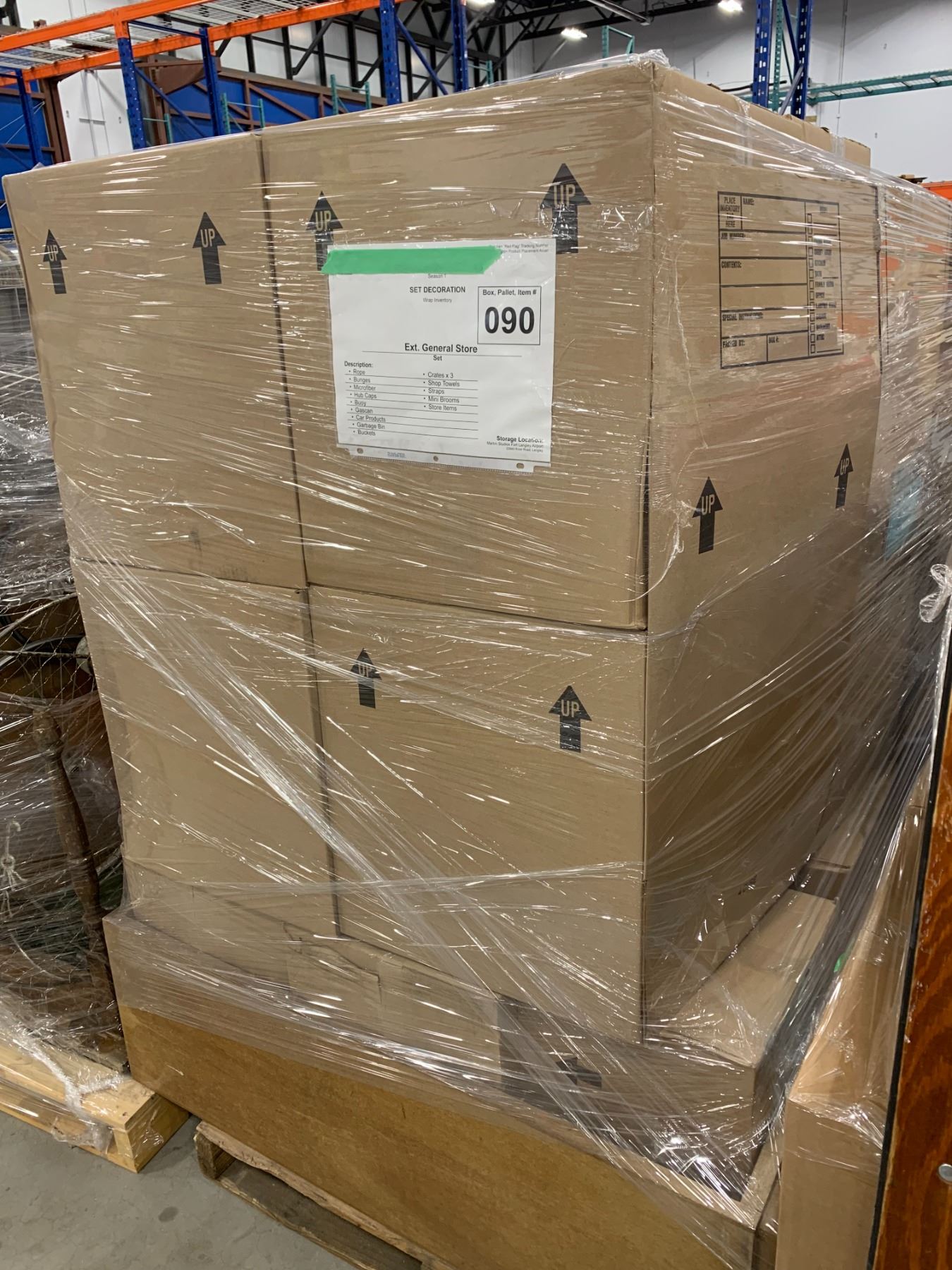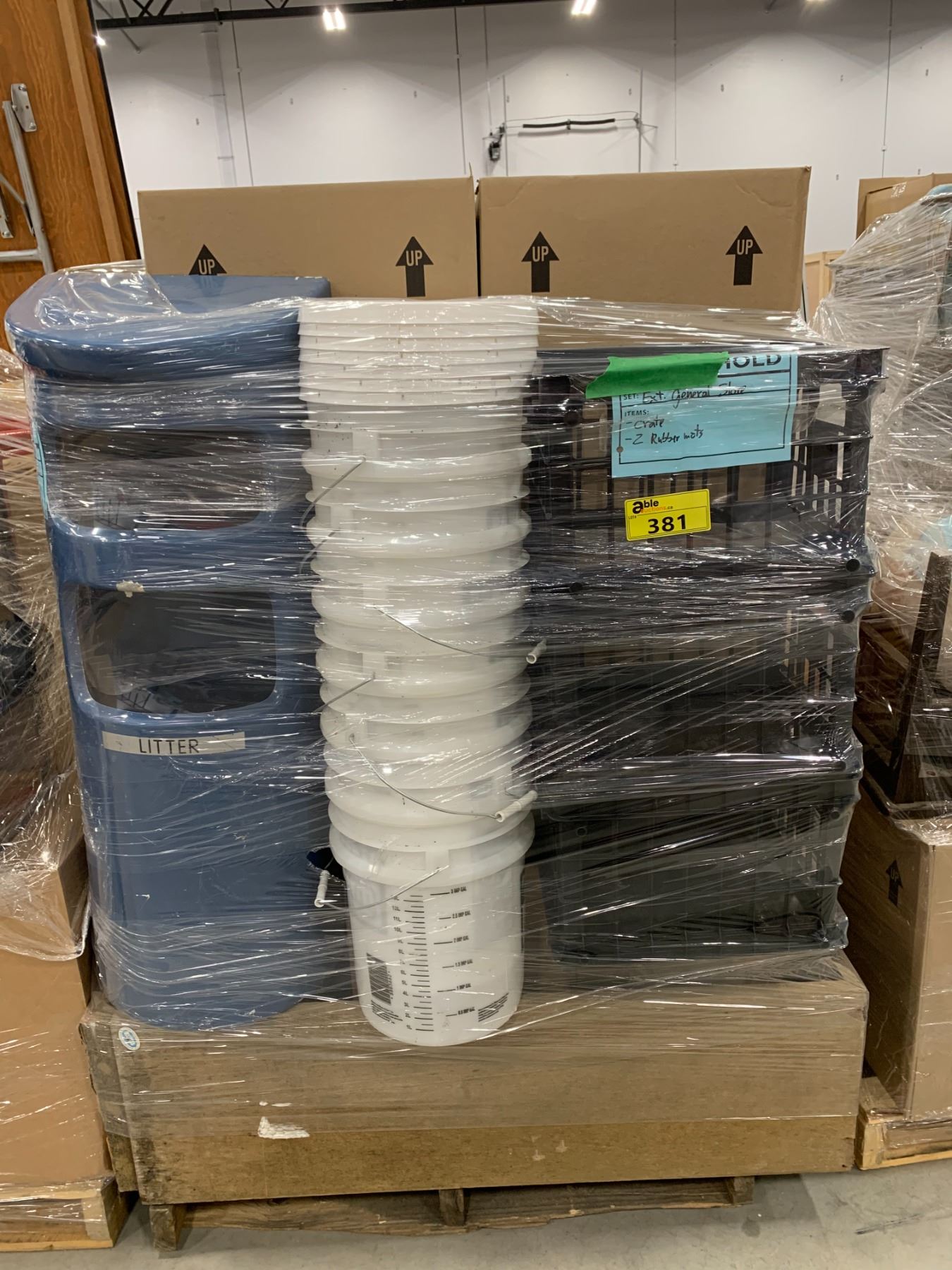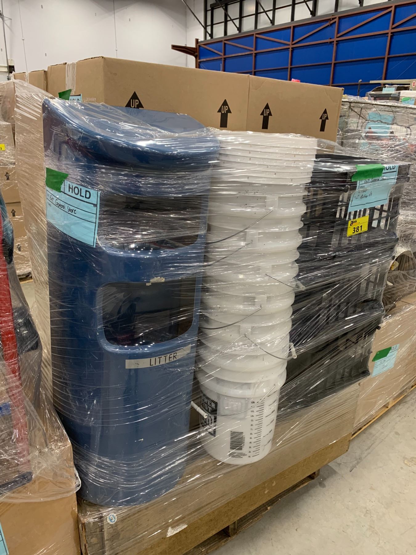 PALLET OF SET DEC ITEMS INCLUDING; TRASH CANS, CRATES, BUCKETS AND MORE