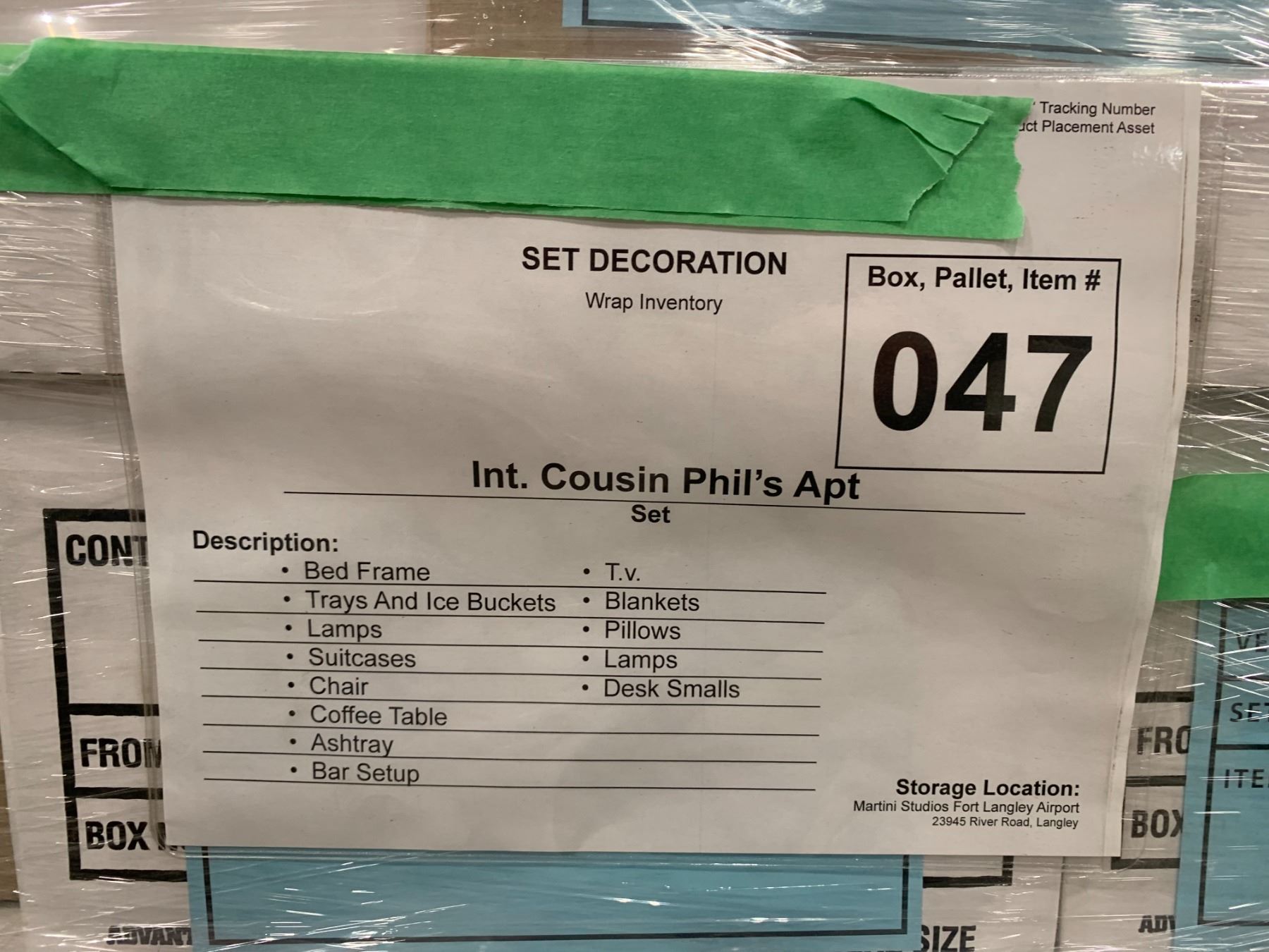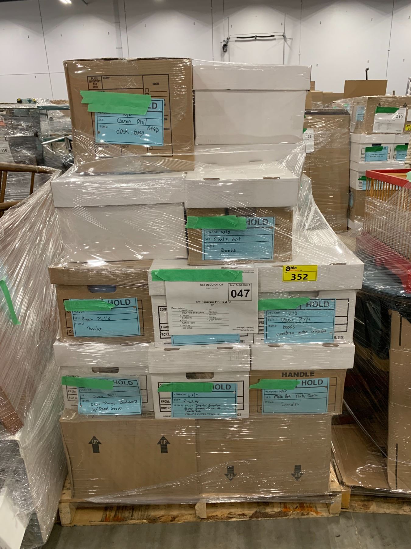 PALLET OF SET DEC ITEMS INCLUDING; TRAYS AND ICE BUCKETS, CHAIR, COFFEE TABLE, BLANKETS AND MORE