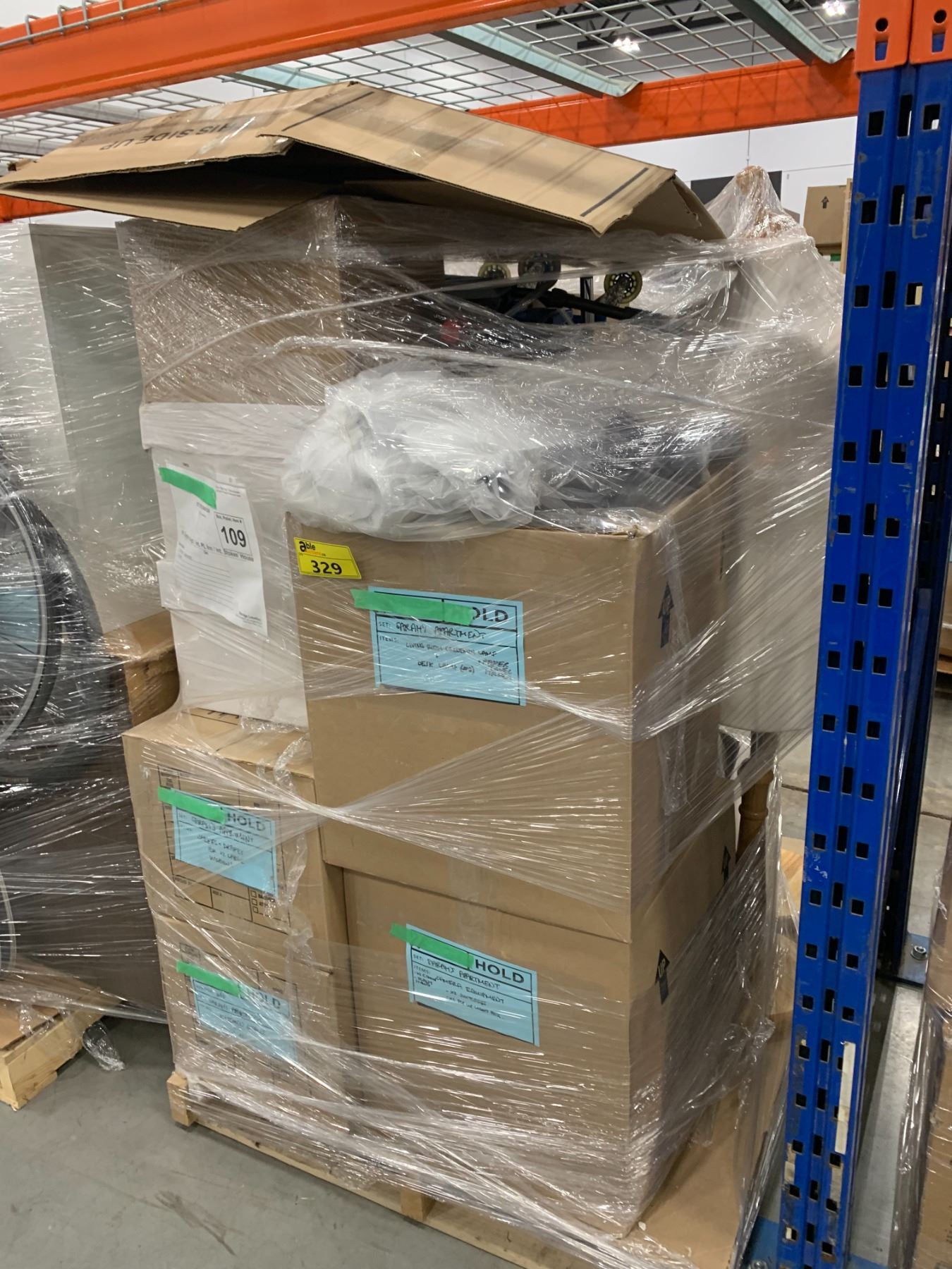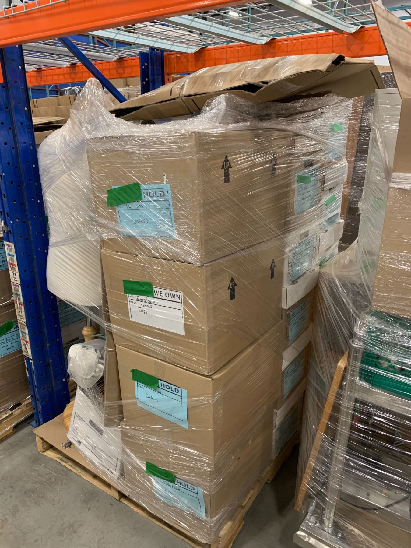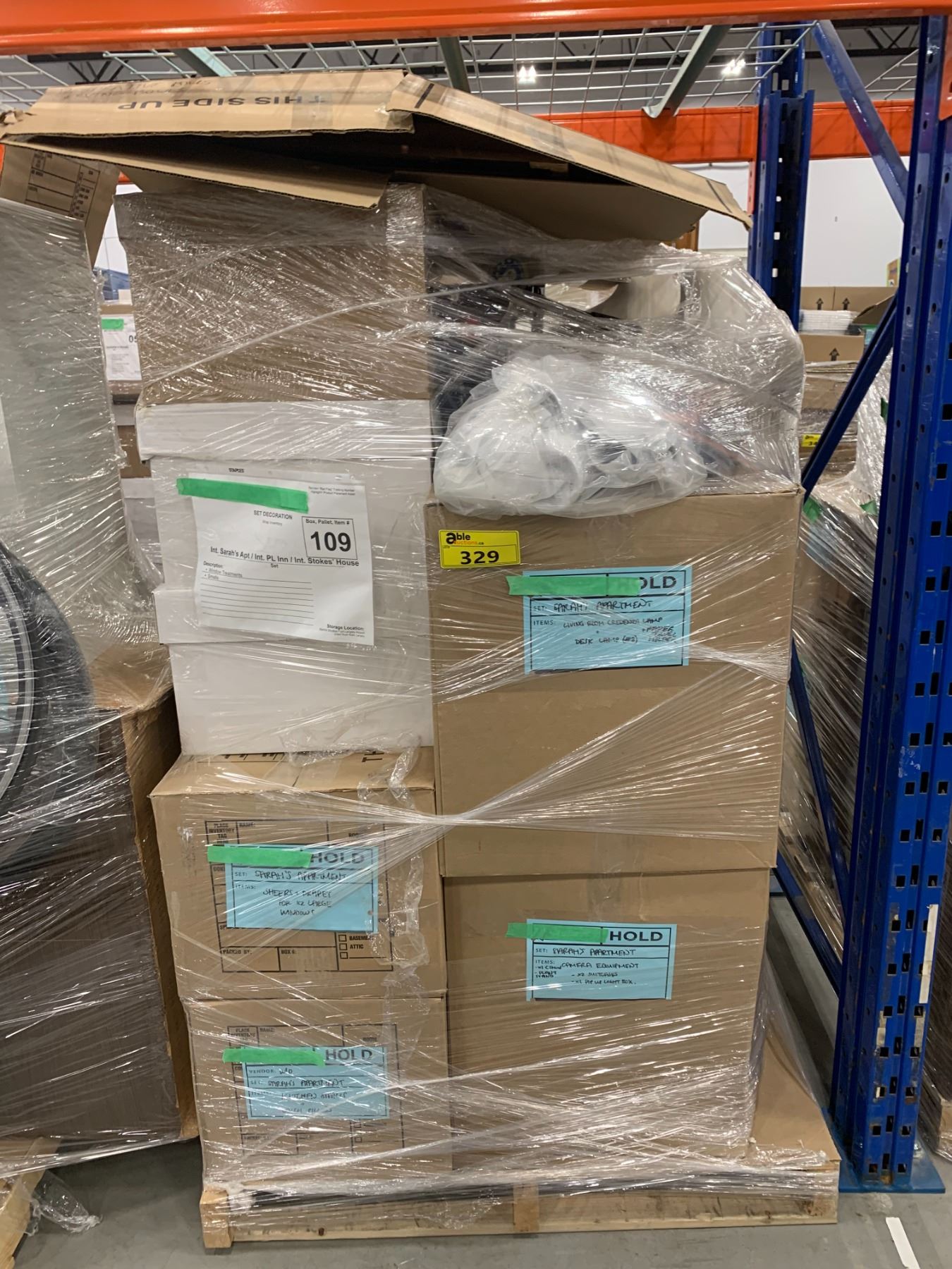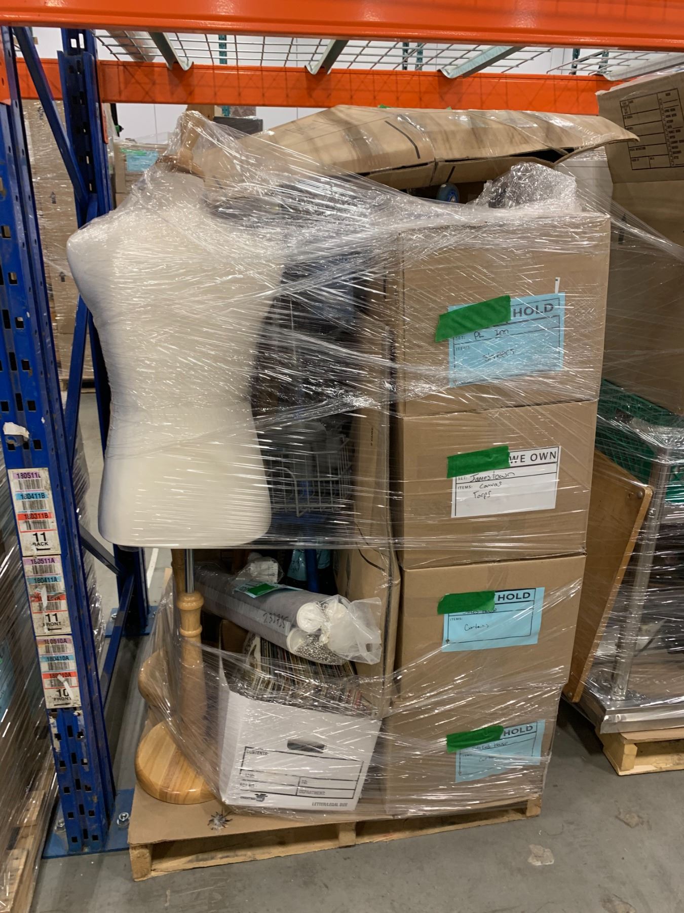 PALLET OF SET DEC ITEMS INCLUDING; WINDOW TREATMENTS, TRIPOD, FRAMED ART AND MORE