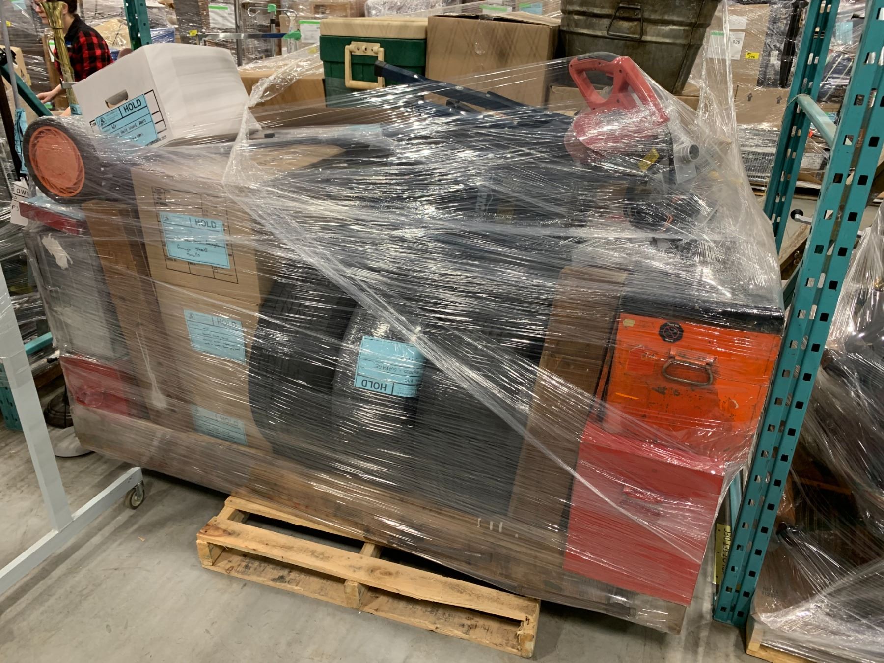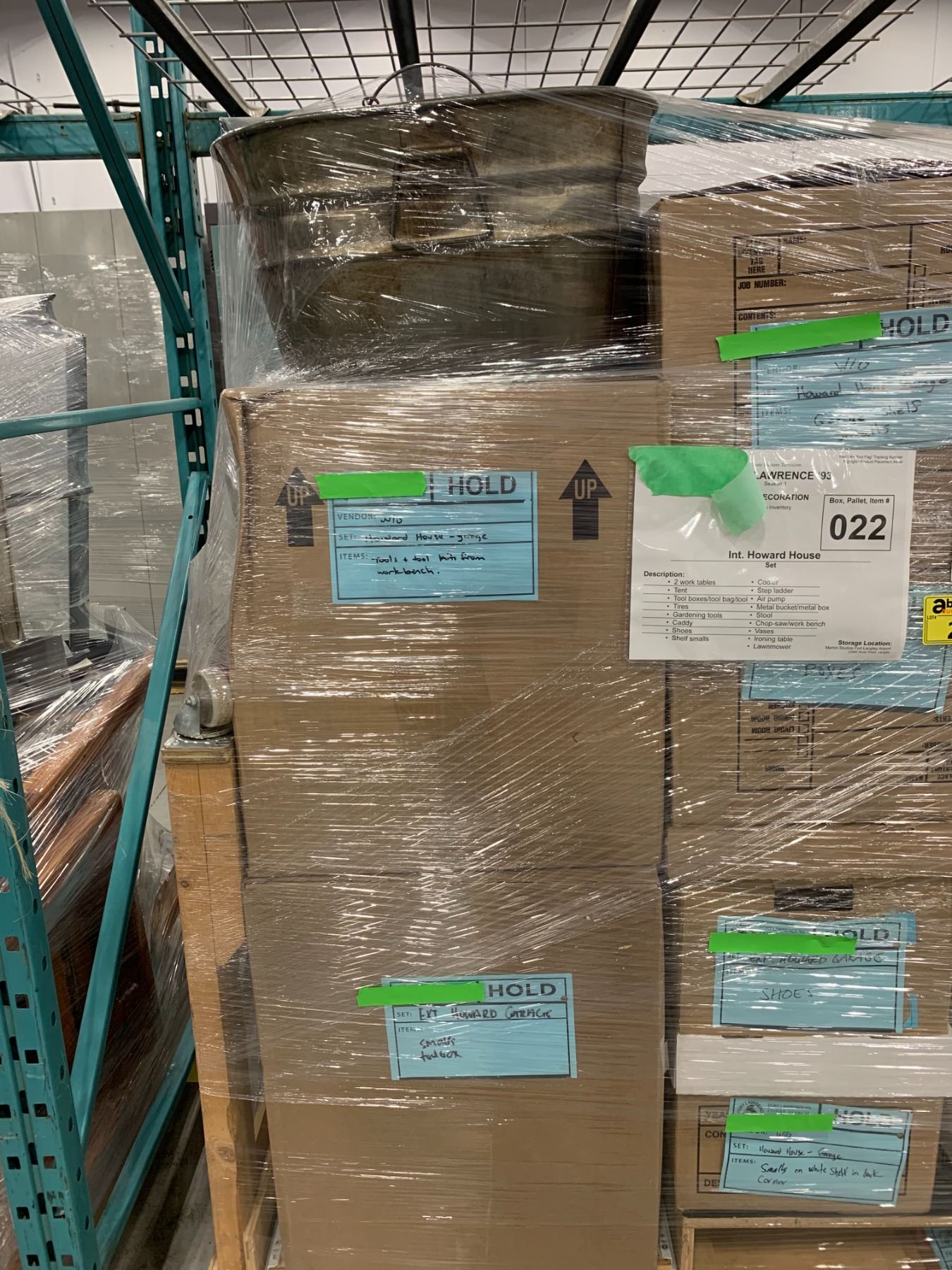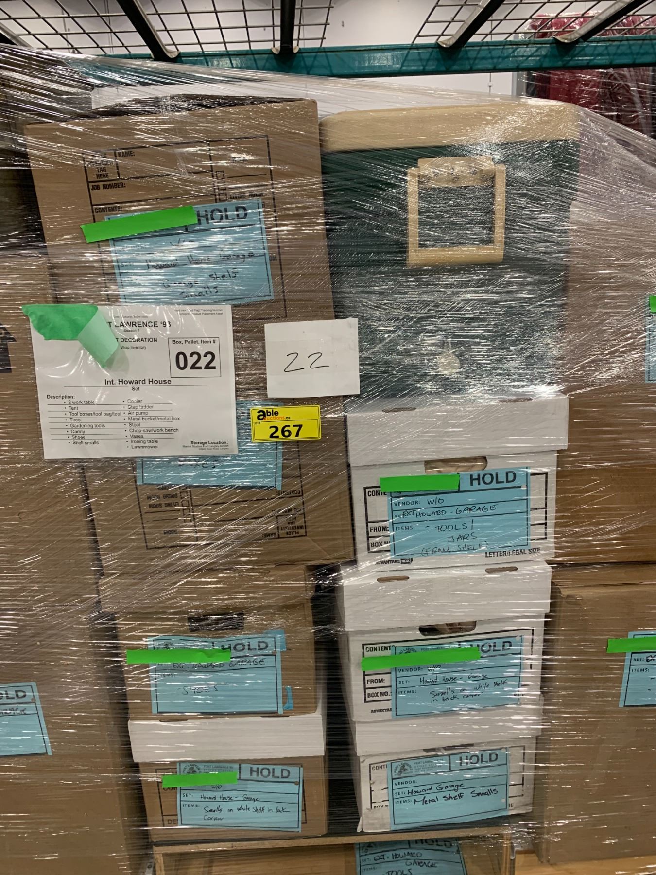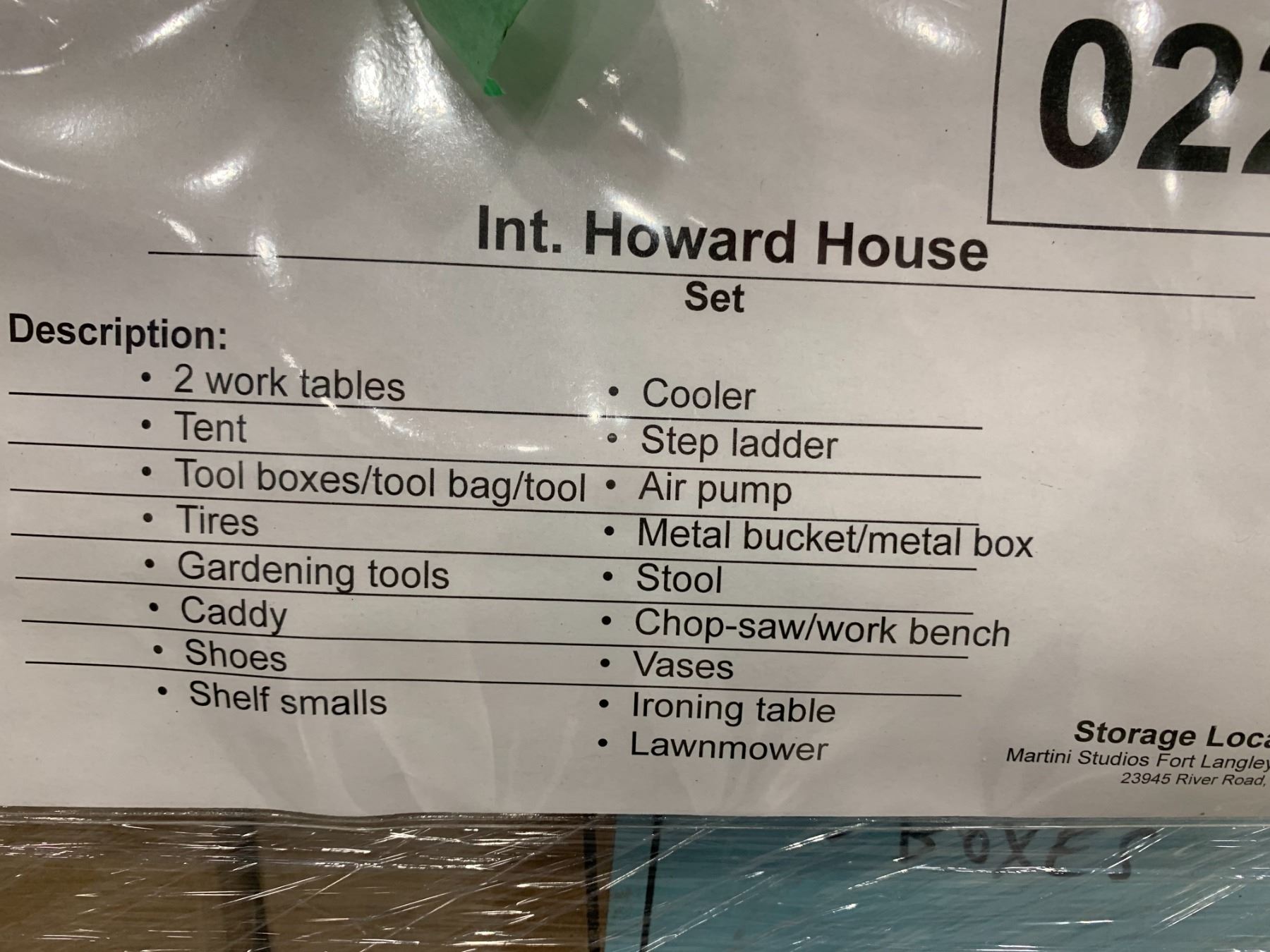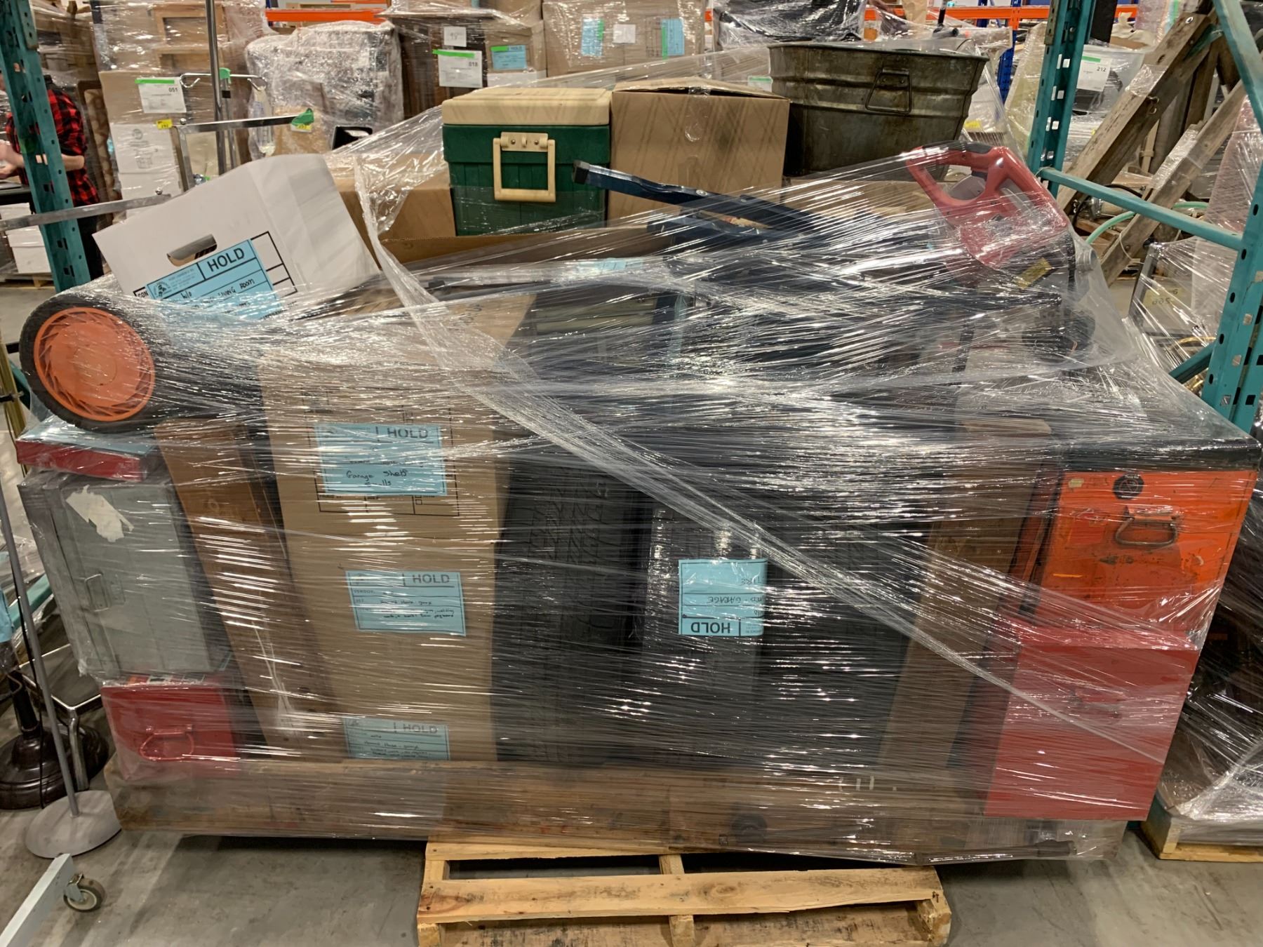 PALLET OF SET DEC ITEMS INCLUDING; WORK TABLES, TOOL BOXES, COOLERS, STEPLADDERS AND MORE