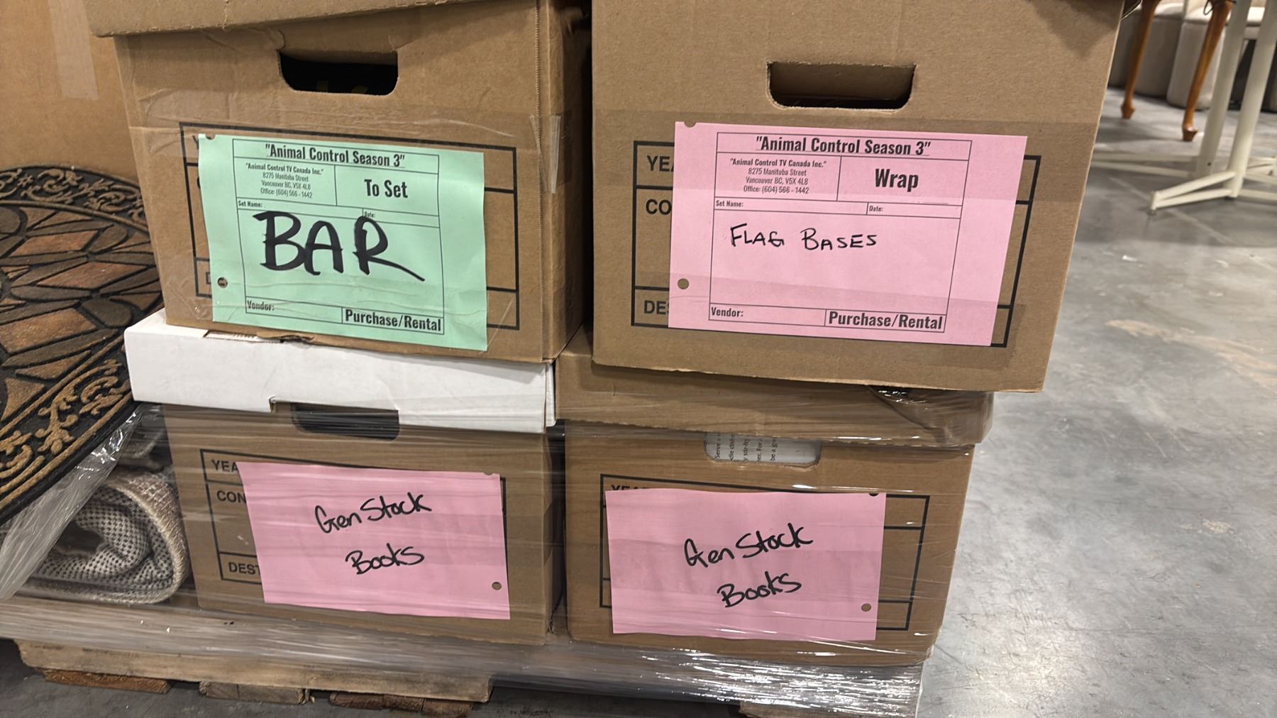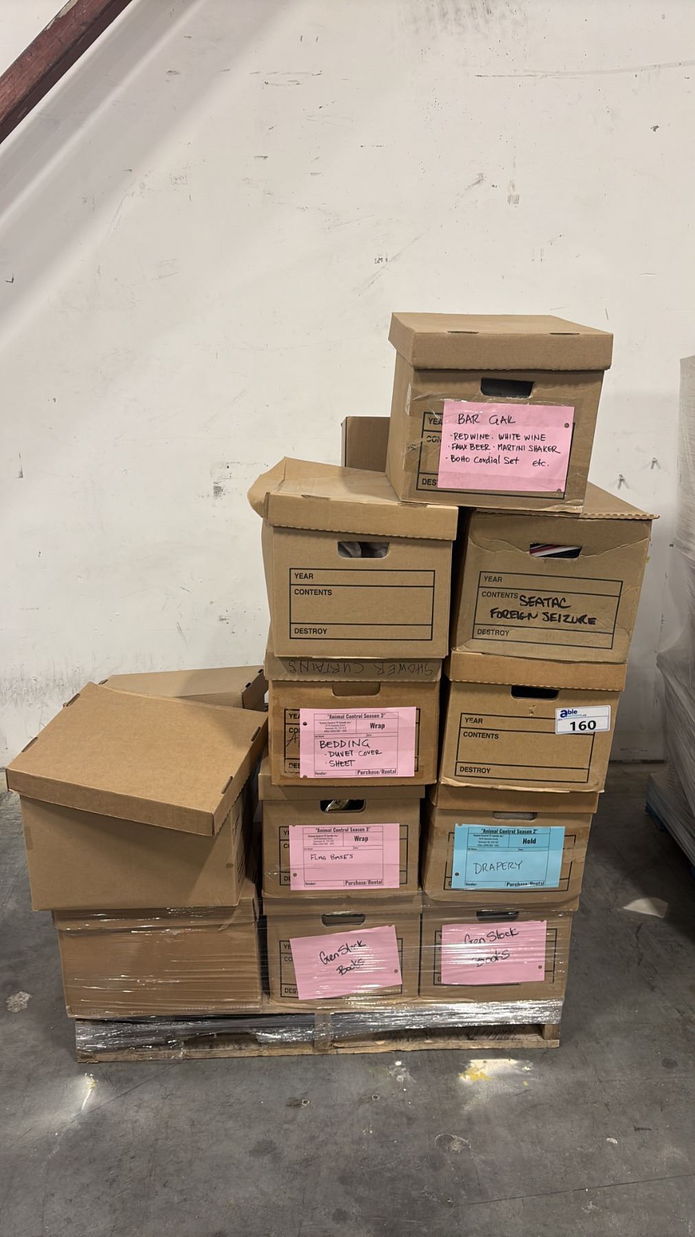PALLET OF SET DEC PROPS/DECORATIONS - DRAPERY, DUVET COVER, FLAG BASES, BOOKS, DOORMAT, BAR ITEMS & MORE *MUST TAKE ALL*